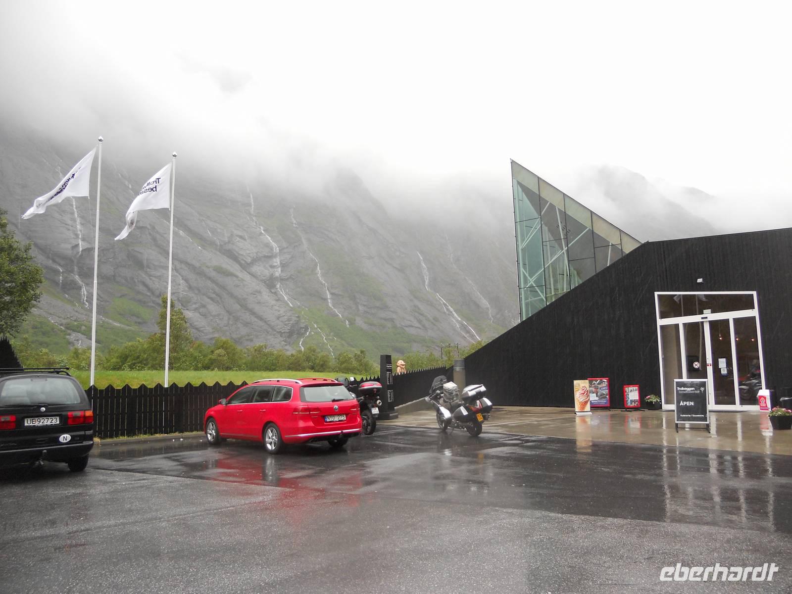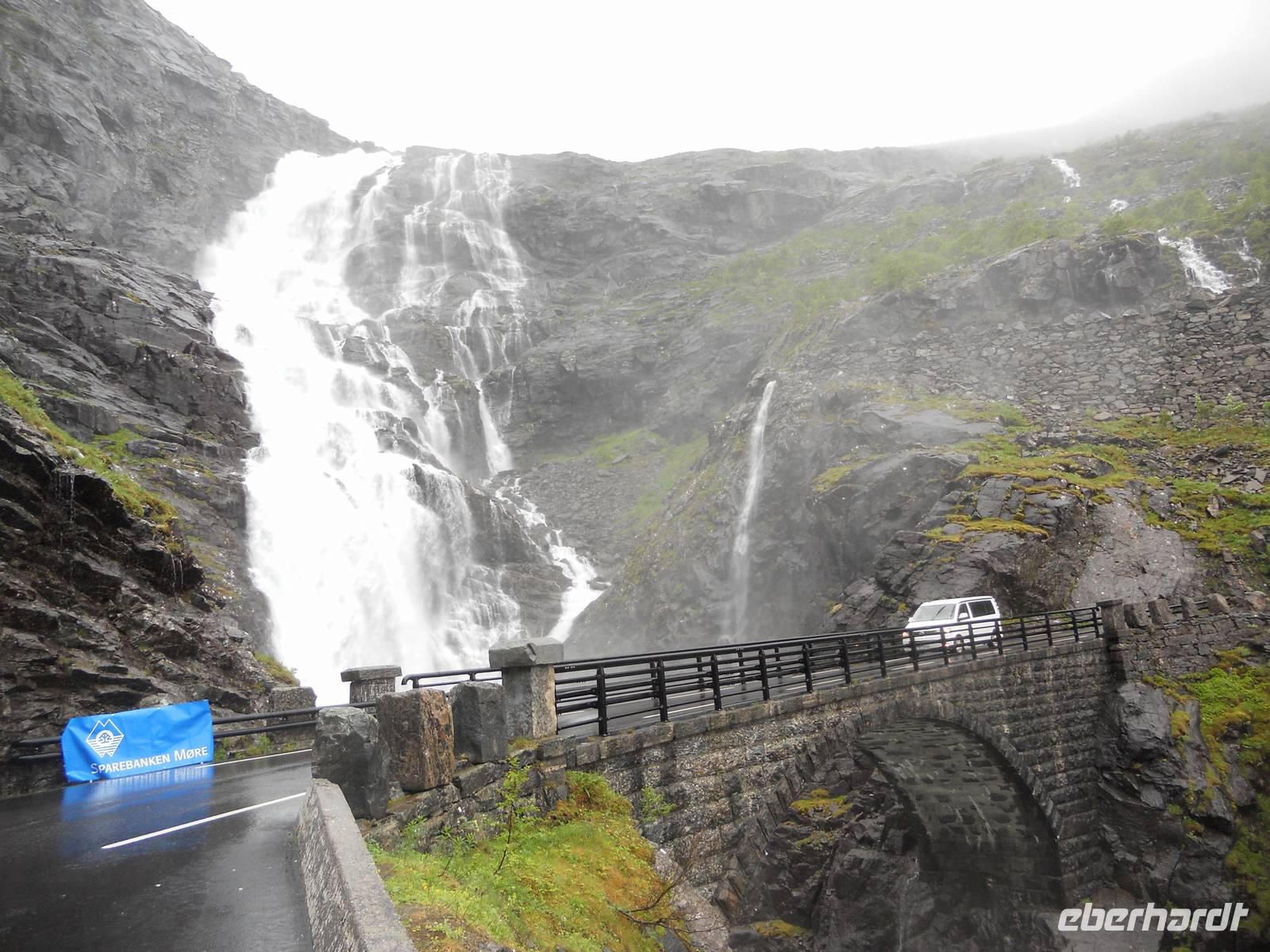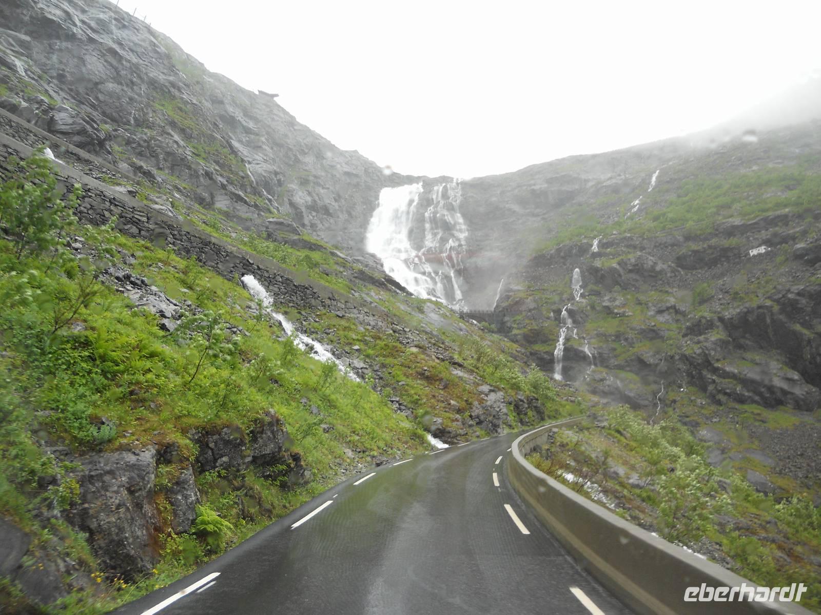 Als Sonntagsauftakt wollten wir den herrlichen Blick vom Hausberg von Molde, dem Varden, erleben. Das war uns leider nicht vergönnt, zwar konnten wir den Fjord mit vielen Inselchen sehen, aber nicht mit der Bergkulisse der Romsdalen dahinter. Danach geht die Fahrt Richtung Trollwand und Trollstiegen, mit kräftigen Wasserfällen und Steilwänden, und der beeindruckenden Straße der Trollstiegen. Hier hat unser Chauffeur Dietmar ganze Arbeit zu leisten, es geht in sogenannten "Haarnadelkurven" nach oben. Am Paß dann eine längere Pause mit kleinen Erkundungen auf gut ausgebauten Wegen. Fotomotive überall, der Blick zurück über die Kehren mit all den Wasserfällen ist toll. Der weitere Weg führt durch das Gebirge der Romsdalen, entlang des Norddalsfjorden und des Storfjorden bis Alesund. Wir bestaunen die Landschaft, die Wasserfälle, rauschende Strudeltöpfe. In den küstennahen Fjorden sorgt der Golfstrom für mildes Klima, beste Bedingungen für Obst und Gemüseanbau. Gegen Abend erreichen wir die Küstenstadt Alesund.