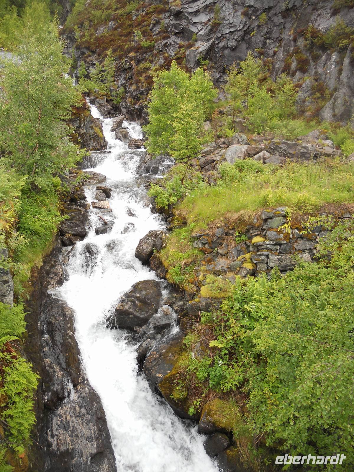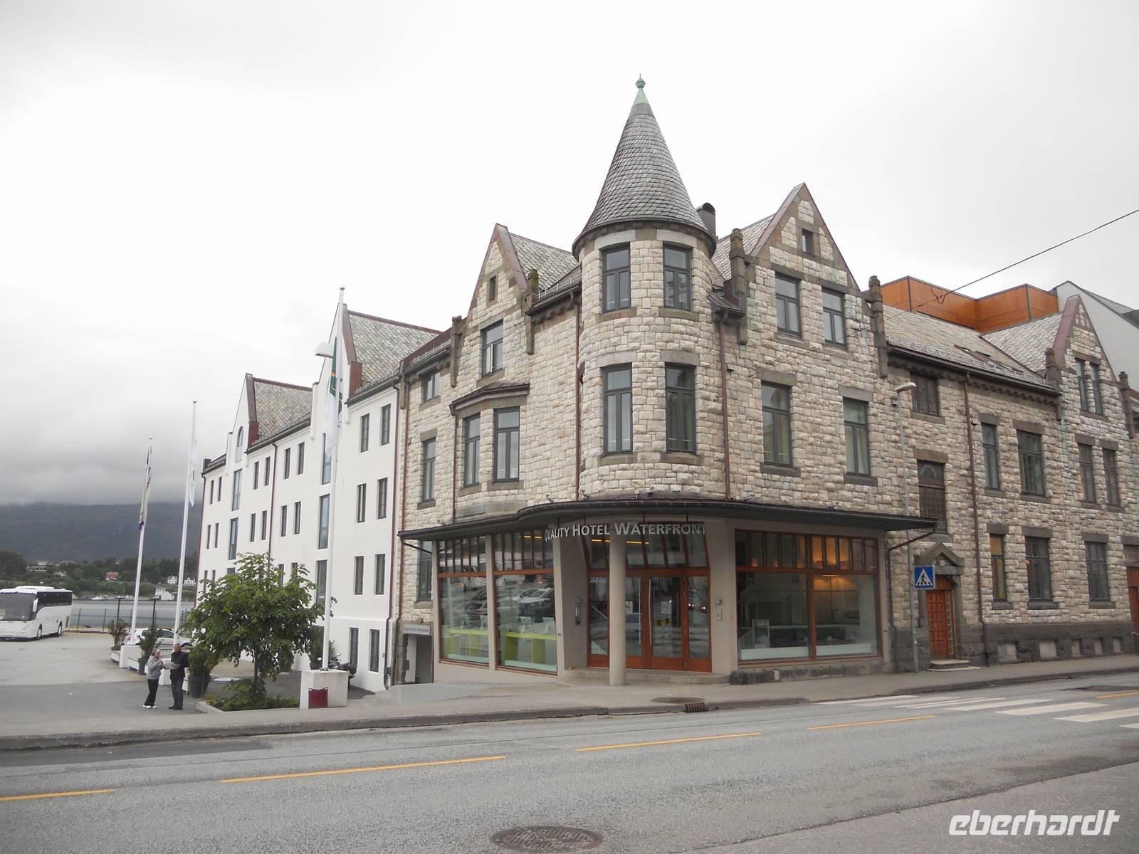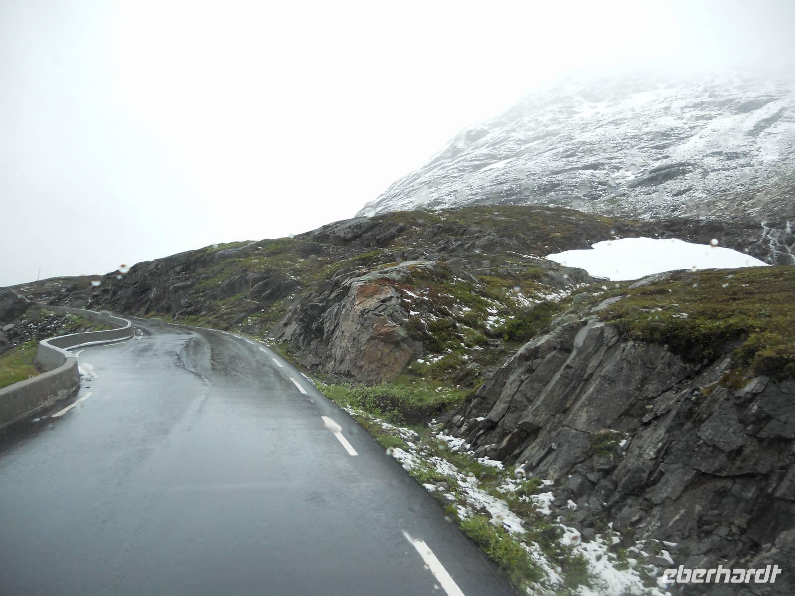 Als Sonntagsauftakt wollten wir den herrlichen Blick vom Hausberg von Molde, dem Varden, erleben. Das war uns leider nicht vergönnt, zwar konnten wir den Fjord mit vielen Inselchen sehen, aber nicht mit der Bergkulisse der Romsdalen dahinter. Danach geht die Fahrt Richtung Trollwand und Trollstiegen, mit kräftigen Wasserfällen und Steilwänden, und der beeindruckenden Straße der Trollstiegen. Hier hat unser Chauffeur Dietmar ganze Arbeit zu leisten, es geht in sogenannten "Haarnadelkurven" nach oben. Am Paß dann eine längere Pause mit kleinen Erkundungen auf gut ausgebauten Wegen. Fotomotive überall, der Blick zurück über die Kehren mit all den Wasserfällen ist toll. Der weitere Weg führt durch das Gebirge der Romsdalen, entlang des Norddalsfjorden und des Storfjorden bis Alesund. Wir bestaunen die Landschaft, die Wasserfälle, rauschende Strudeltöpfe. In den küstennahen Fjorden sorgt der Golfstrom für mildes Klima, beste Bedingungen für Obst und Gemüseanbau. Gegen Abend erreichen wir die Küstenstadt Alesund.