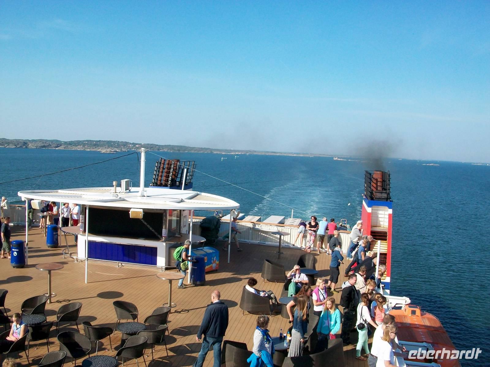 Ich glaube dieser kleine Umweg hat sich gelohnt; nach gut vierzig Minute müssen wir die Fahrt aber wieder aufnehmen, unser Weg ist noch weit. Bald zahlt es sich auch aus dass wir etwas Zeitreserve eingeplant haben, hinter Oslo erwischt uns ein Stau, nur schrittweise geht es nun voran. Aber auch das geht vorbei, wir gelangen über den Swinesund nach Schweden und zwei Stunden später sind wir am Fährterminal in Göteborg angelangt. Die Fähre steht schon bereit, wir gehen an Bord und bis zum Abendessen verbleibt noch etwas Zeit die schöne Atmosphäre an Bord zu genießen.
