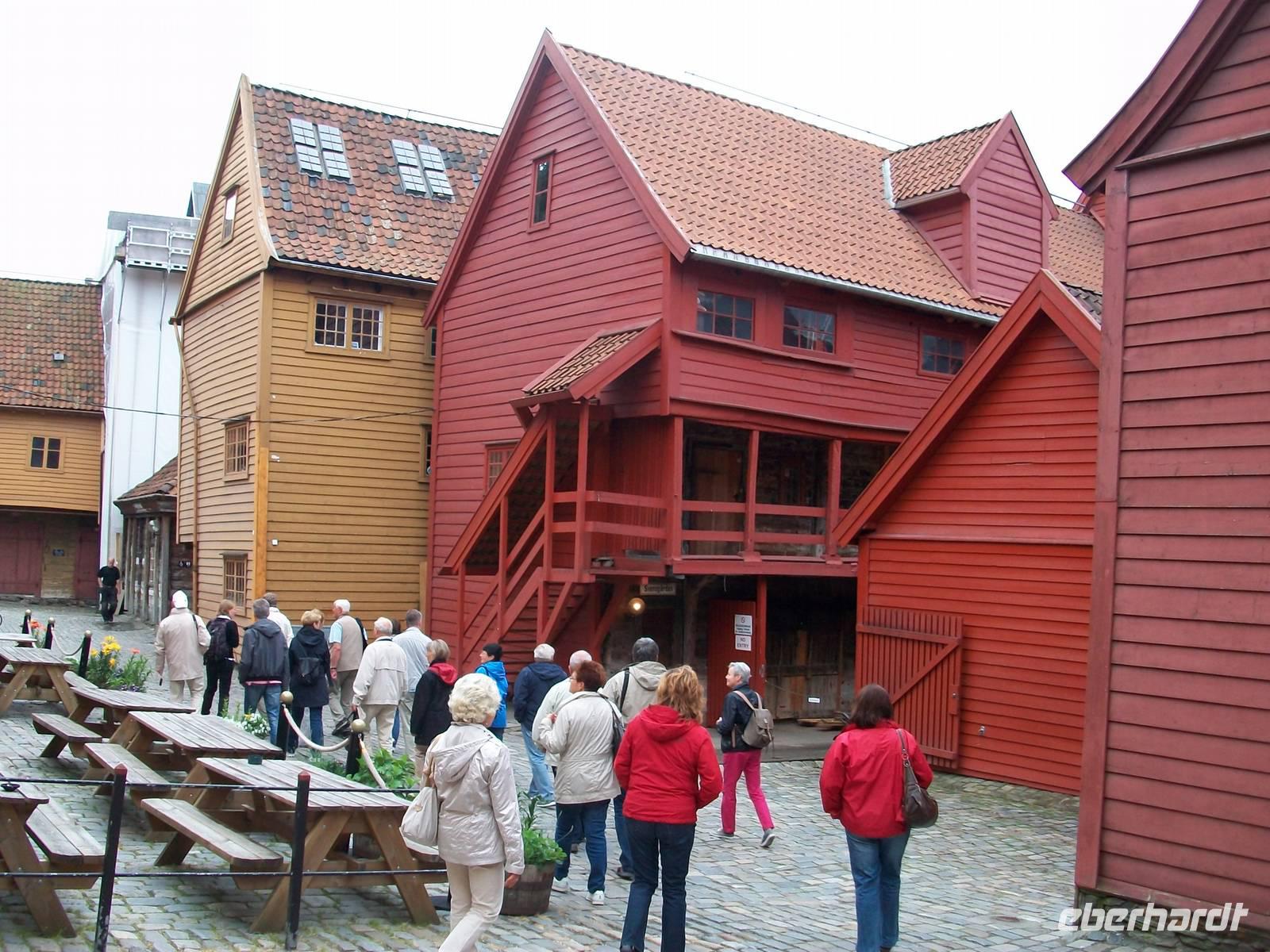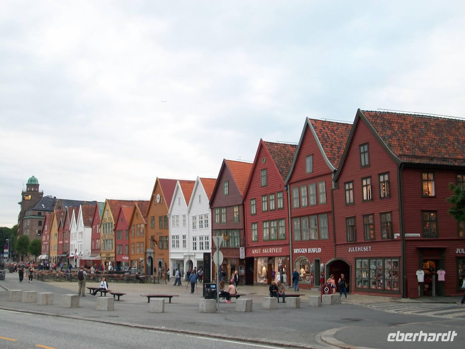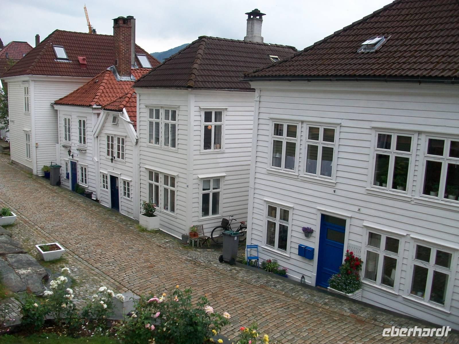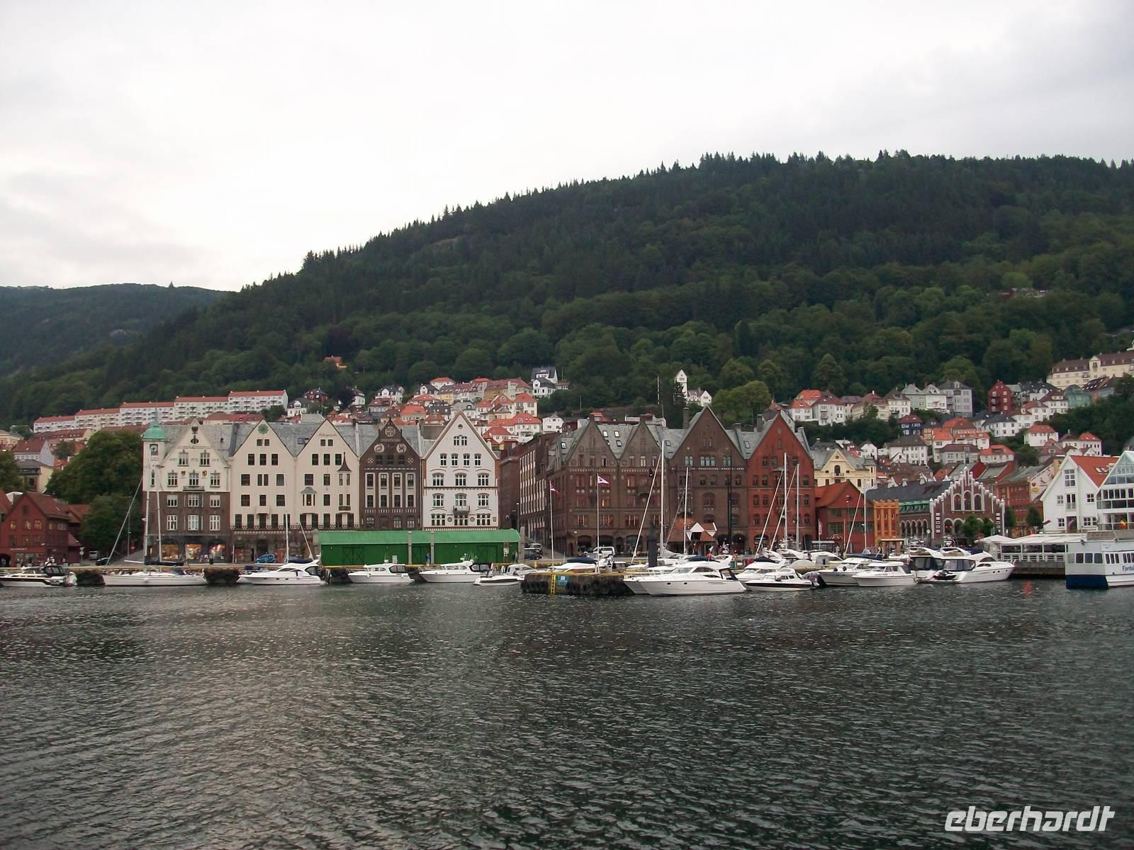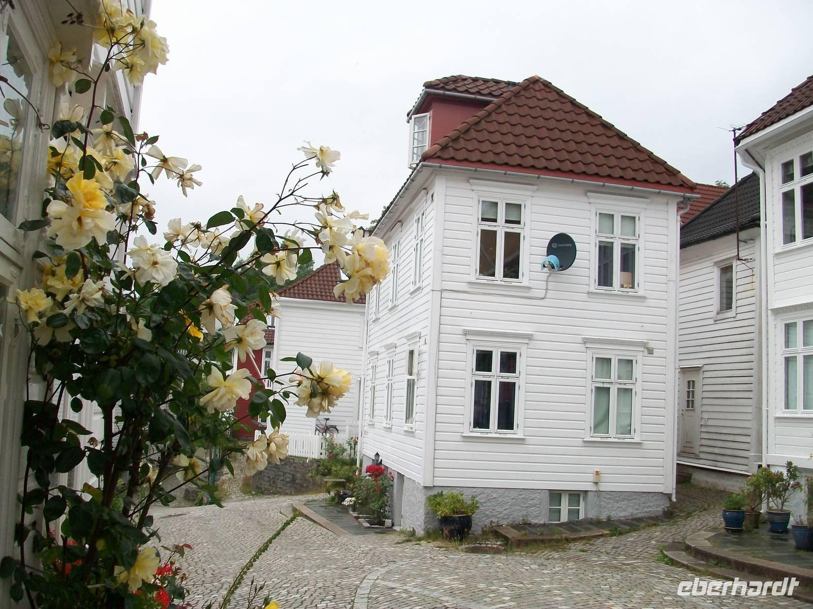 Entlang gepflegter Straßenzüge und eleganter Häuser gelangen wir über den Hafen in einen der ältesten Stadtteile von Bergen. Karin, unsere Führerin, begleitet uns nun bei einem Rundgang durch diese alten Holzgebäude mit dem schönen Anstrich und dem gepflegten Blumenschmuck. Es ist eine ruhige Gegend; als wir weiter fahren, kommen wir wieder am quirligen Hafen vorbei und sehen die Häuserreihe des historischen Kaufmannsviertels Bryggen. Die Häuser haben einen verschiedenen Anstrich und stehen zumeist auch ziemlich schief weil der Untergrund nicht sehr stabil ist.