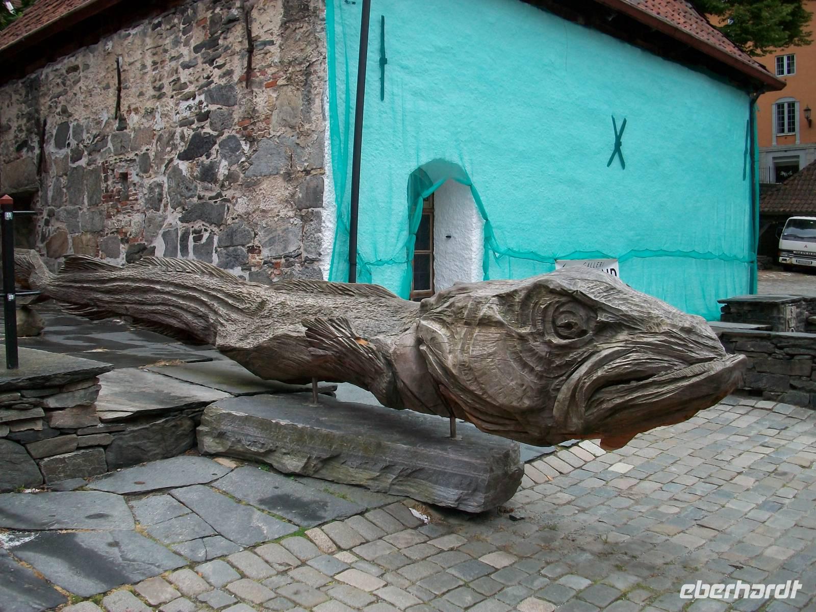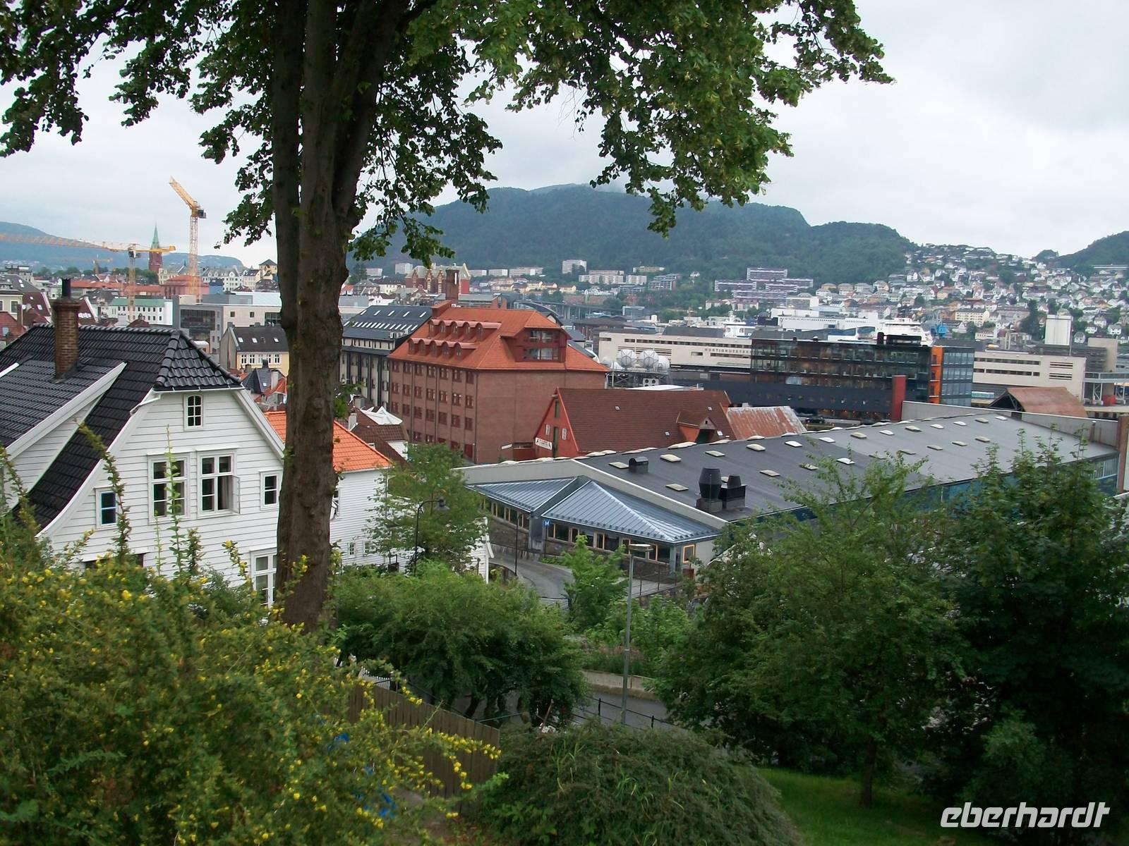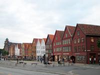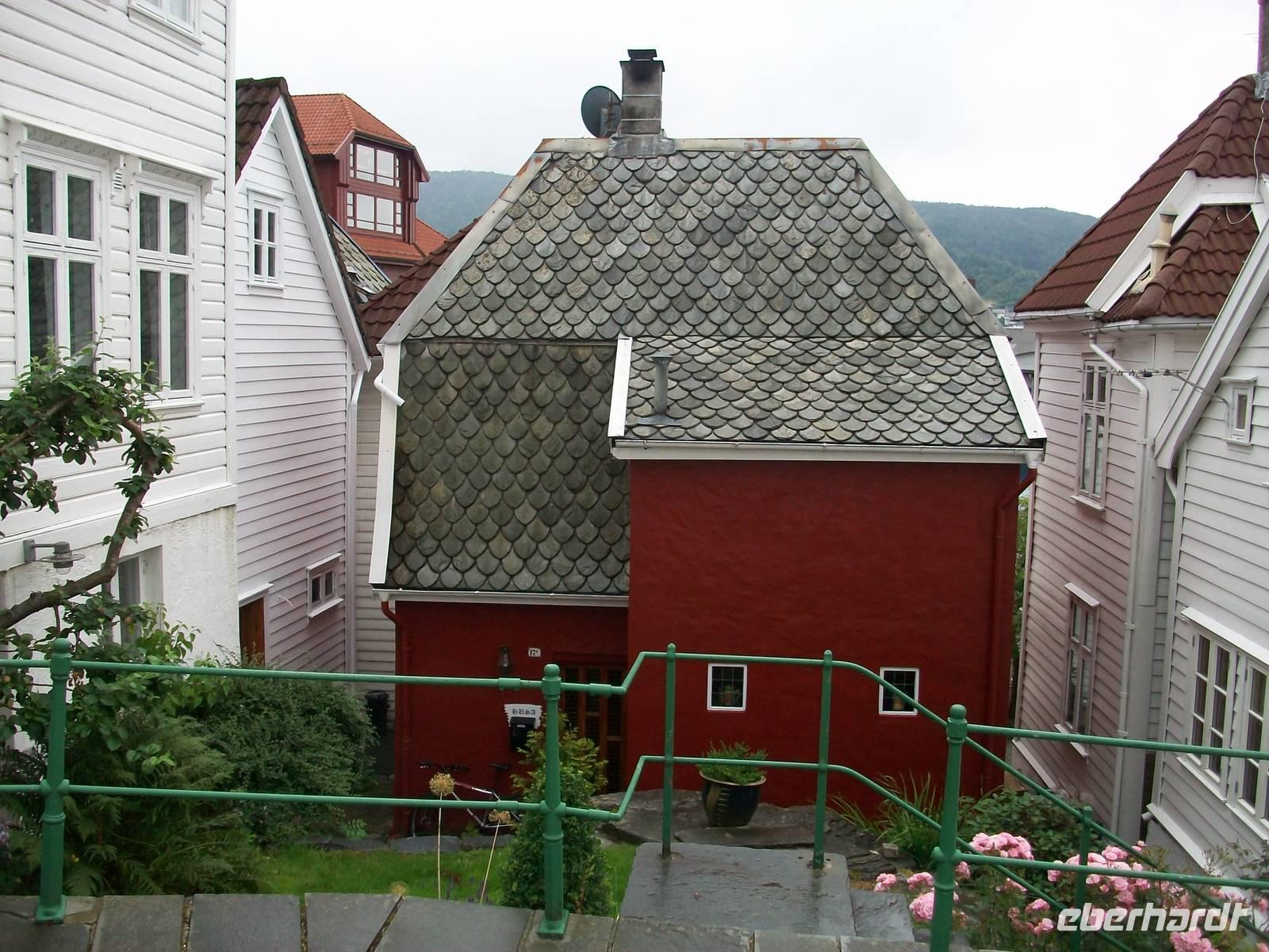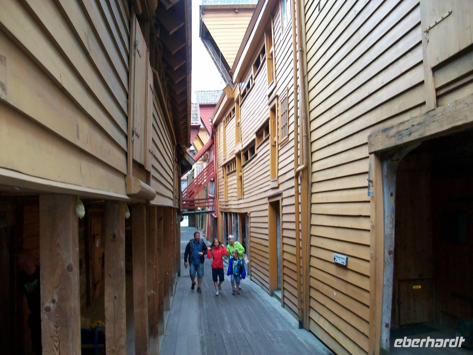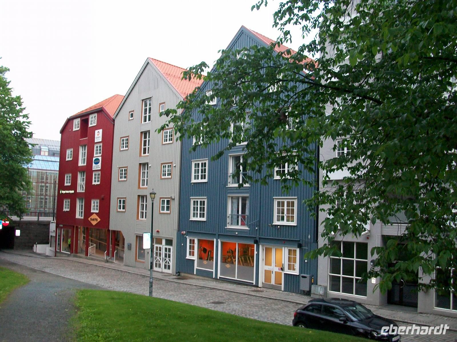 Entlang gepflegter Straßenzüge und eleganter Häuser gelangen wir über den Hafen in einen der ältesten Stadtteile von Bergen. Karin, unsere Führerin, begleitet uns nun bei einem Rundgang durch diese alten Holzgebäude mit dem schönen Anstrich und dem gepflegten Blumenschmuck. Es ist eine ruhige Gegend; als wir weiter fahren, kommen wir wieder am quirligen Hafen vorbei und sehen die Häuserreihe des historischen Kaufmannsviertels Bryggen. Die Häuser haben einen verschiedenen Anstrich und stehen zumeist auch ziemlich schief weil der Untergrund nicht sehr stabil ist.