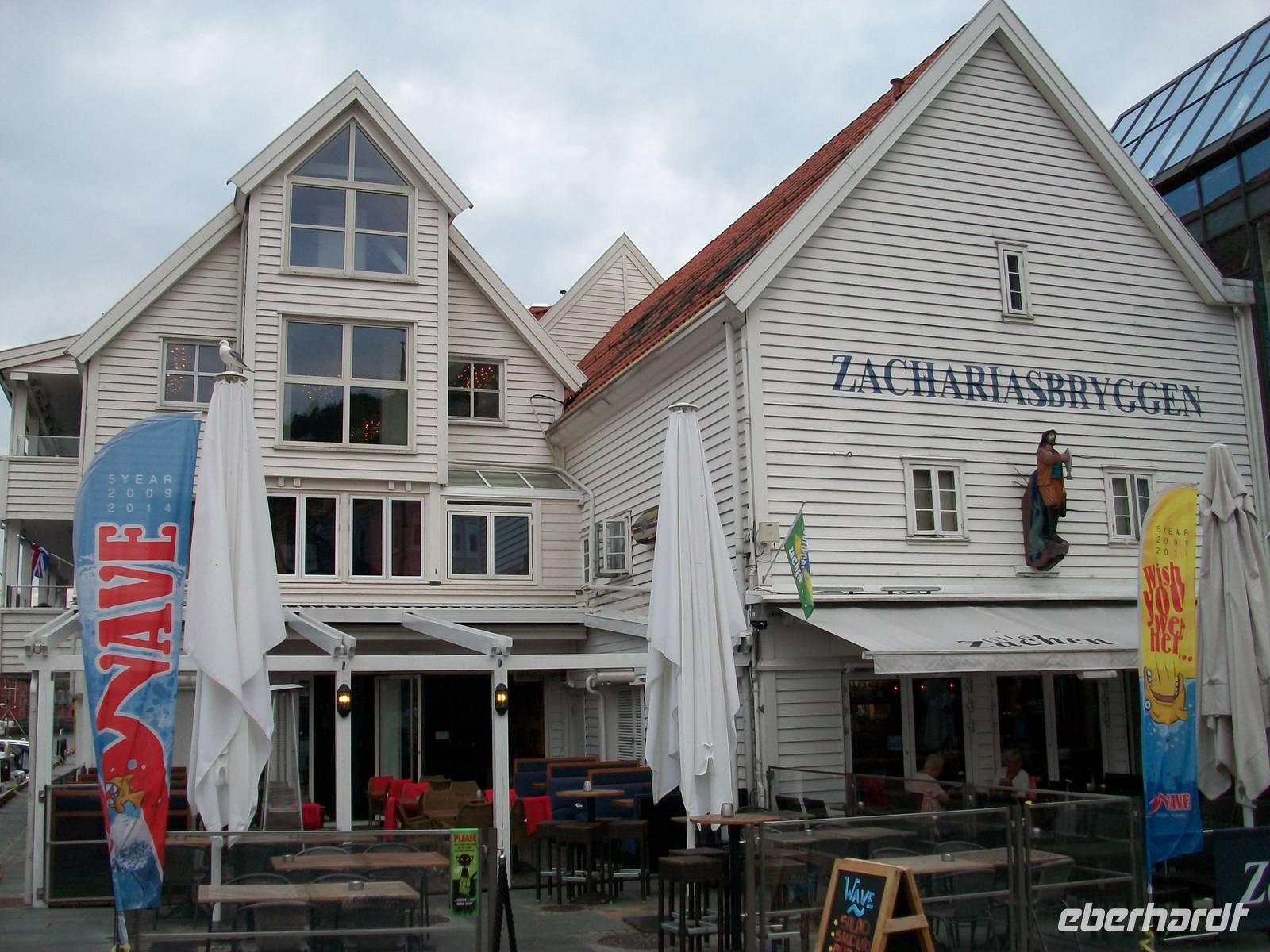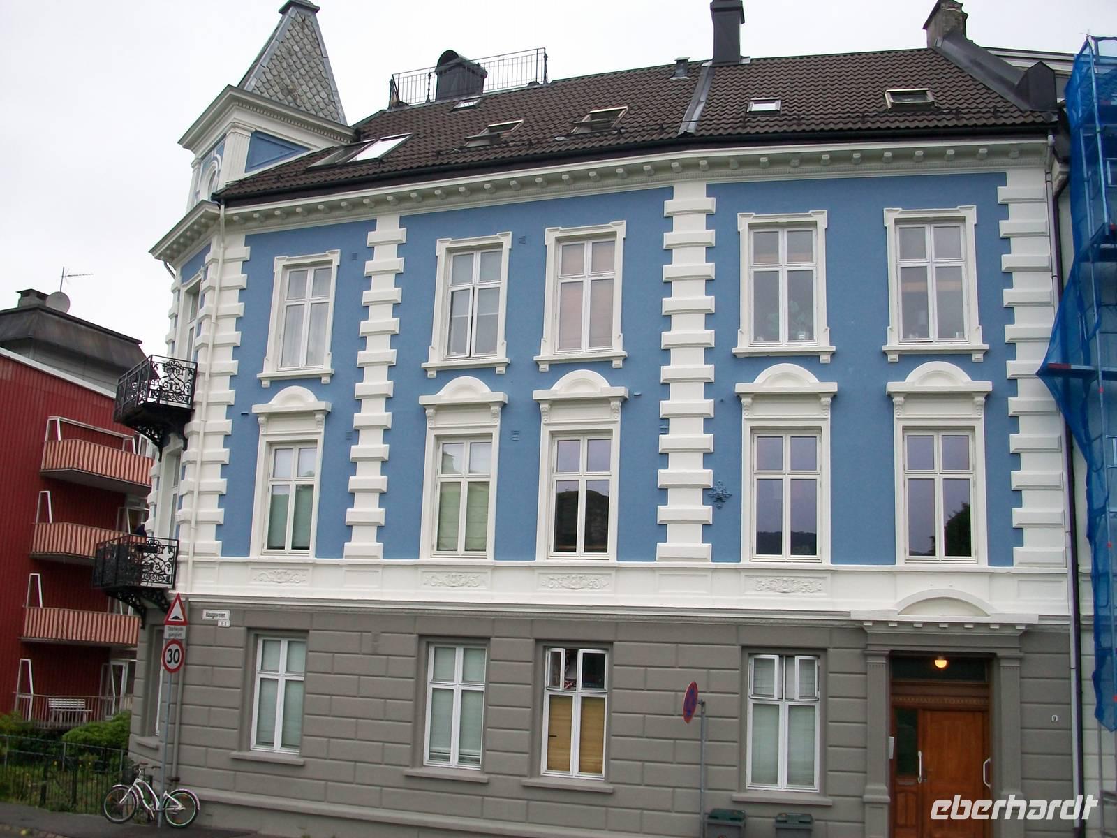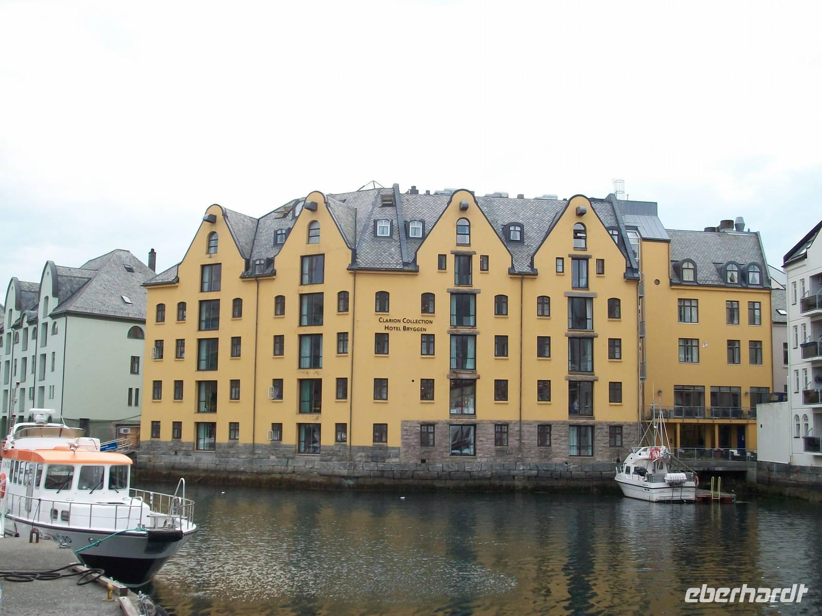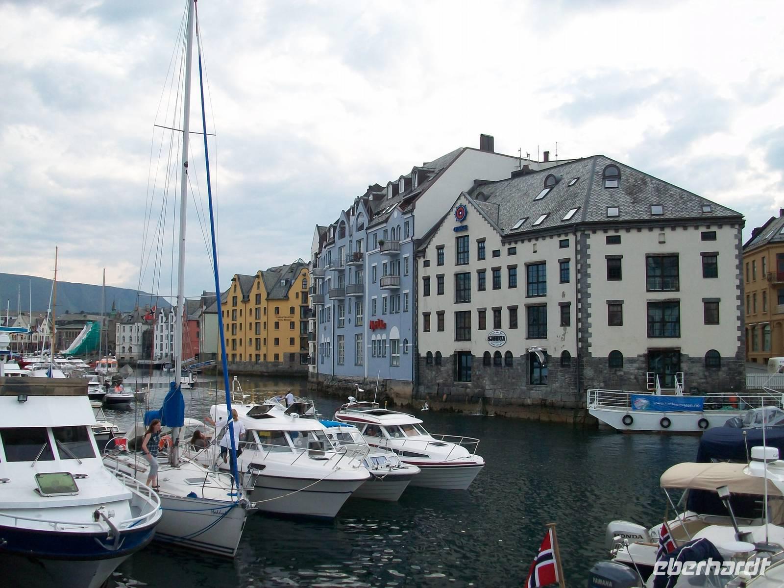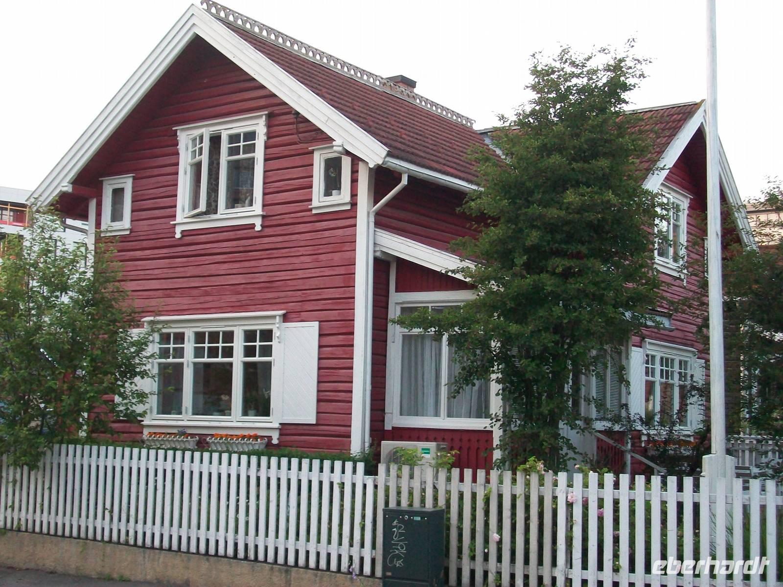 Entlang gepflegter Straßenzüge und eleganter Häuser gelangen wir über den Hafen in einen der ältesten Stadtteile von Bergen. Karin, unsere Führerin, begleitet uns nun bei einem Rundgang durch diese alten Holzgebäude mit dem schönen Anstrich und dem gepflegten Blumenschmuck. Es ist eine ruhige Gegend; als wir weiter fahren, kommen wir wieder am quirligen Hafen vorbei und sehen die Häuserreihe des historischen Kaufmannsviertels Bryggen. Die Häuser haben einen verschiedenen Anstrich und stehen zumeist auch ziemlich schief weil der Untergrund nicht sehr stabil ist.