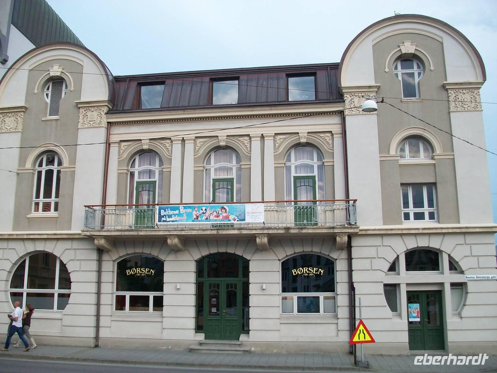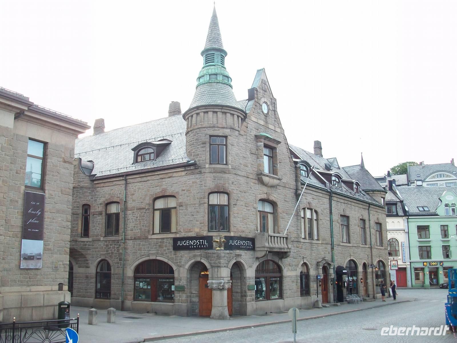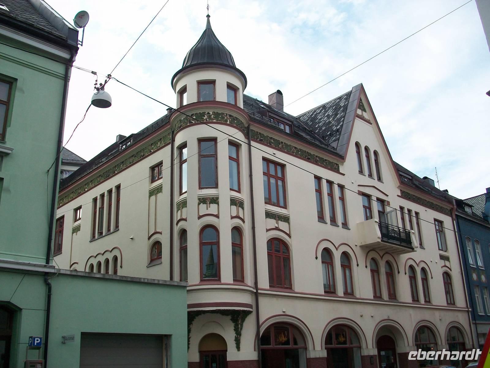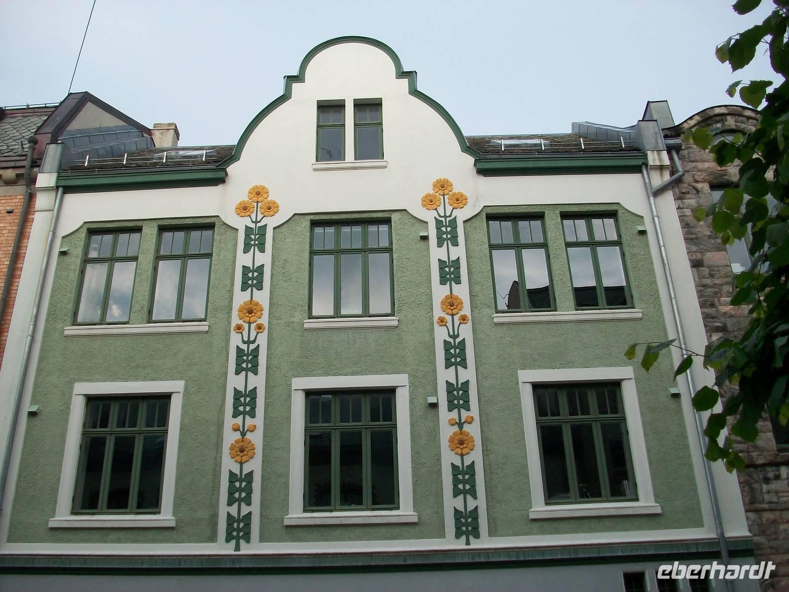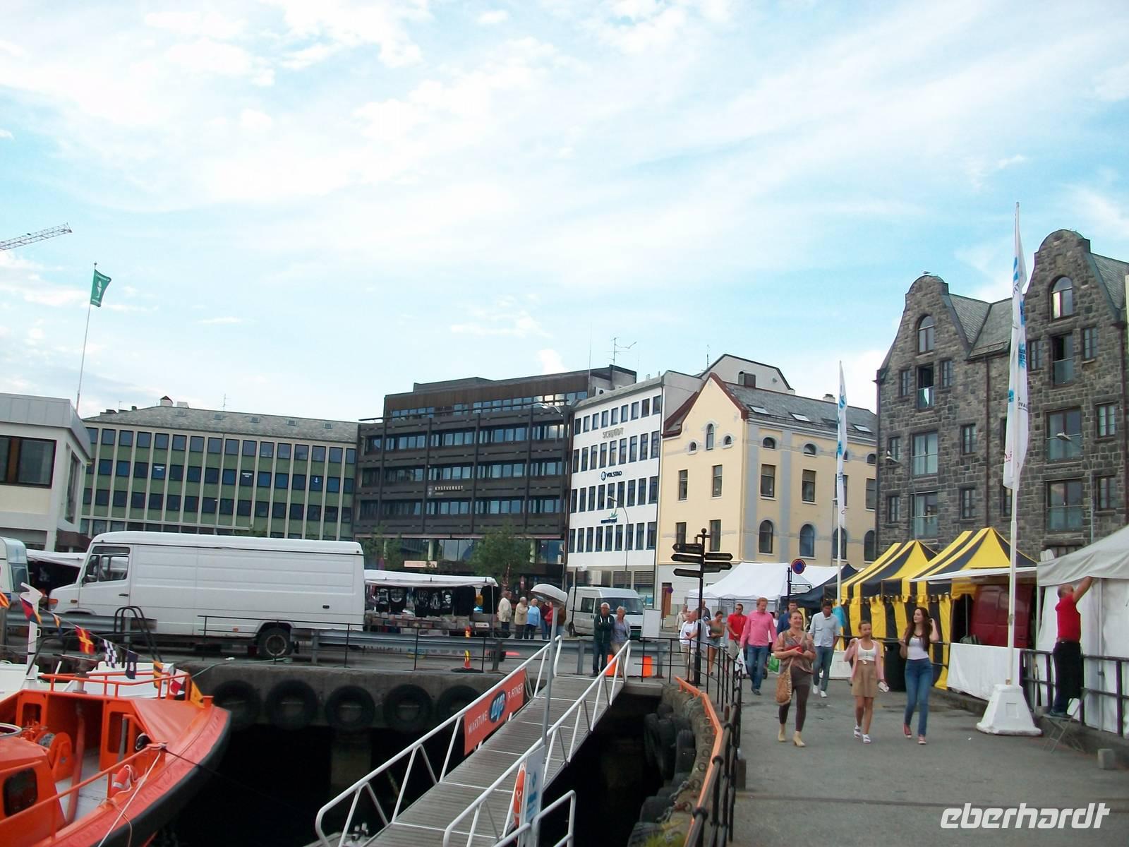 Entlang gepflegter Straßenzüge und eleganter Häuser gelangen wir über den Hafen in einen der ältesten Stadtteile von Bergen. Karin, unsere Führerin, begleitet uns nun bei einem Rundgang durch diese alten Holzgebäude mit dem schönen Anstrich und dem gepflegten Blumenschmuck. Es ist eine ruhige Gegend; als wir weiter fahren, kommen wir wieder am quirligen Hafen vorbei und sehen die Häuserreihe des historischen Kaufmannsviertels Bryggen. Die Häuser haben einen verschiedenen Anstrich und stehen zumeist auch ziemlich schief weil der Untergrund nicht sehr stabil ist.