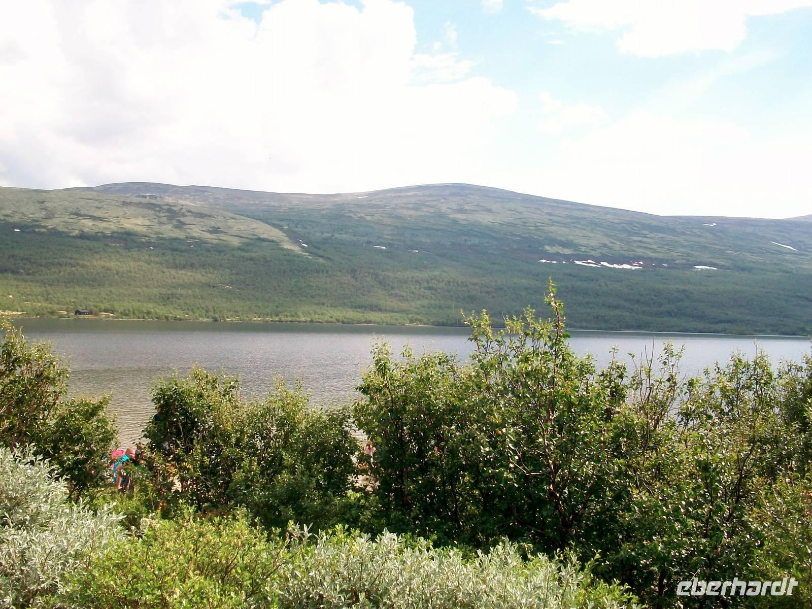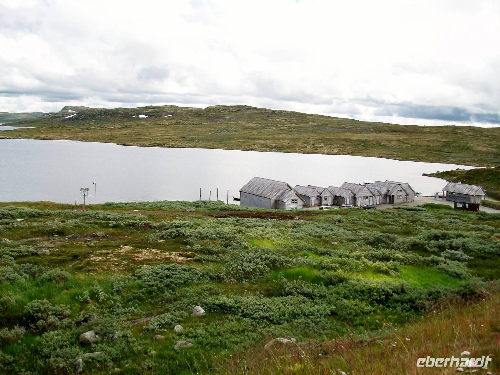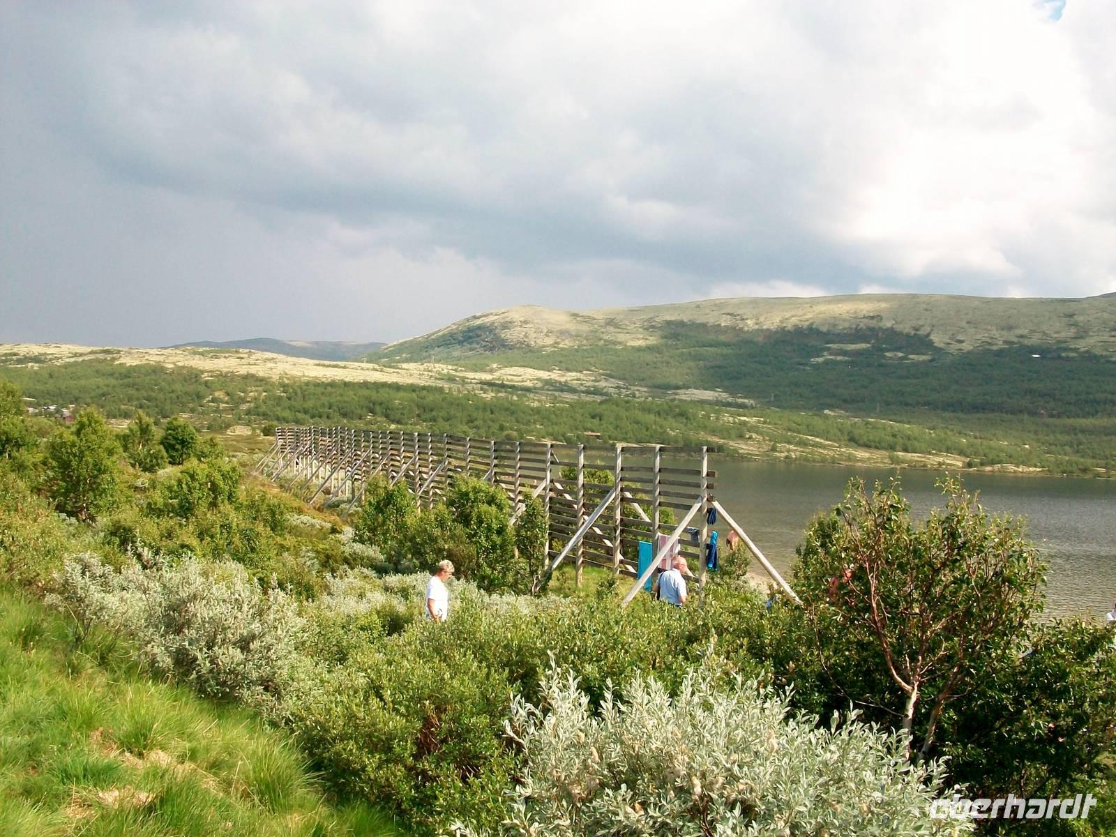 Dann steigen wir erneut an, lassen einmal mehr die Baumgrenze hinter uns und sind nun in der beeindruckenden Hochebene der Hardangervidda unterwegs. Weit geht der Blick bis zu den Bergen, kleine Flüsse bahnen sich ihren Weg durch die Fjellheide mit der typischen und spärlichen Vegetation dieser Gegend. Nun ist auch wieder die Sonne hervorgekommen, sie wird uns nun noch den Rest des Tages begleiten.