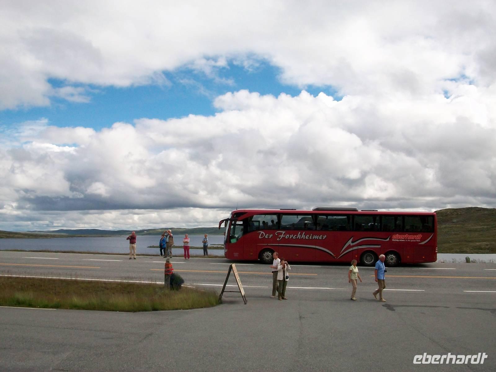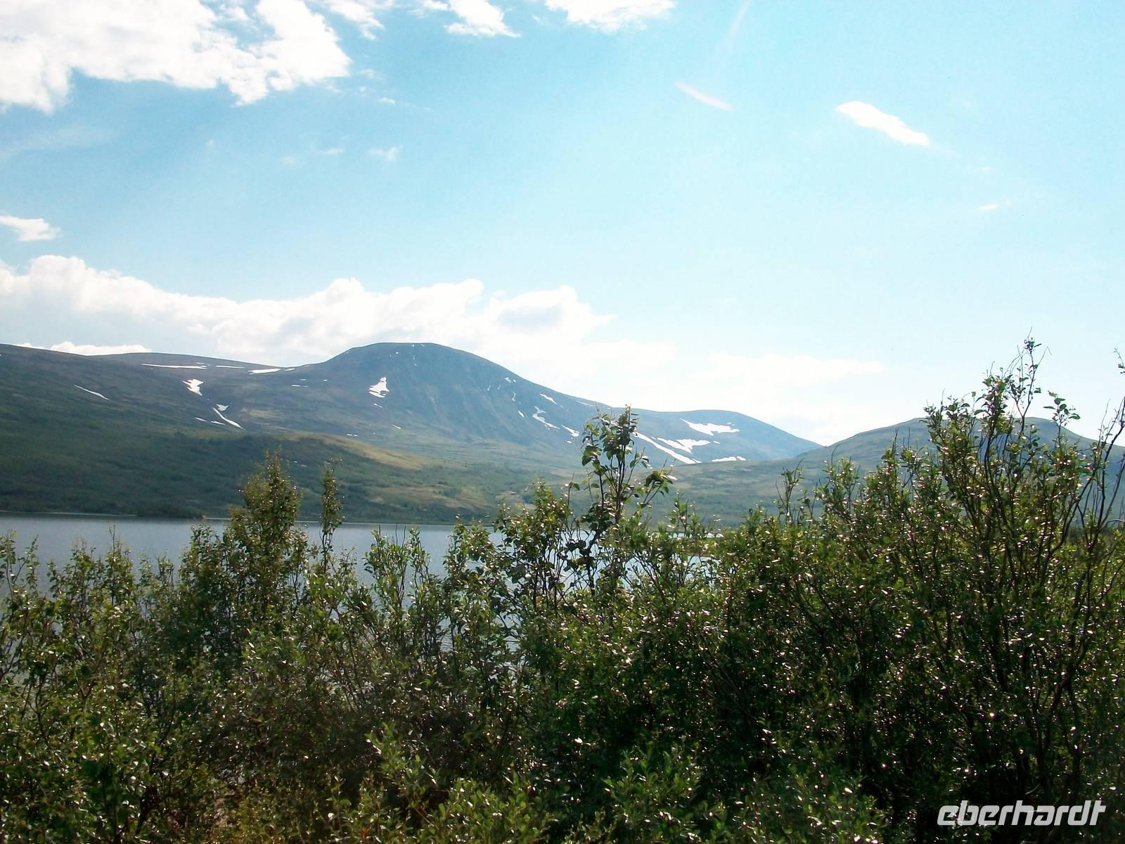 Danach steigen wir mit unserem Bus an, bald tritt der Baumbestand zurück; wir gelangen in die Birkenzone und wenig später ist nur noch der niedrige Bewuchs einer spärlichen Vegetation zu sehen. Entlang von kleineren Seen in denen sich die Berge widerspiegeln, dort haben sich noch Schneereste erhalten, verläuft die wunderschöne Fahrt.