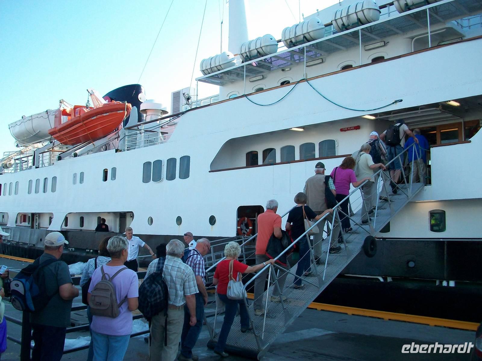 Doch dann müssen wir aufbrechen; nur kurze Zeit und wir sind am Hafen angelangt, am Kai ist schon unser Schiff festgemacht. Es gibt nun noch einige kleinere Formalitäten zu erledigen, doch dann können wir an Bord gehen.