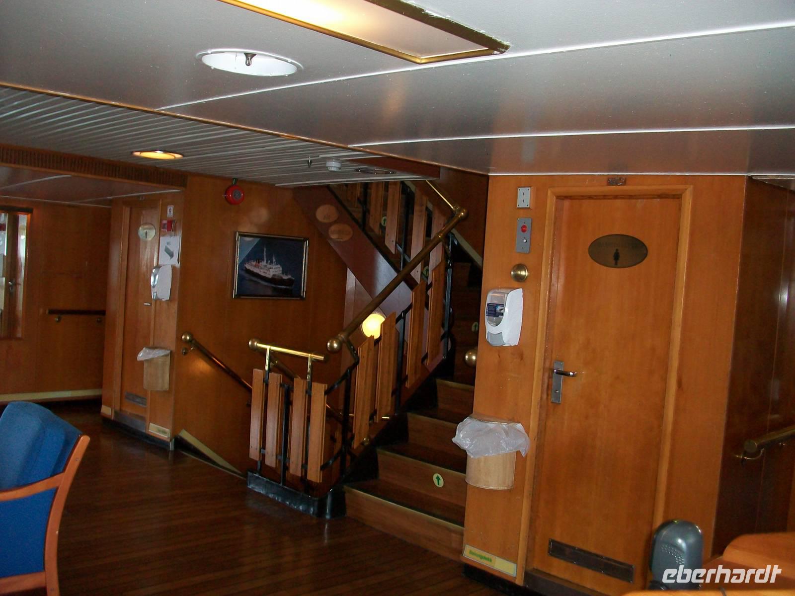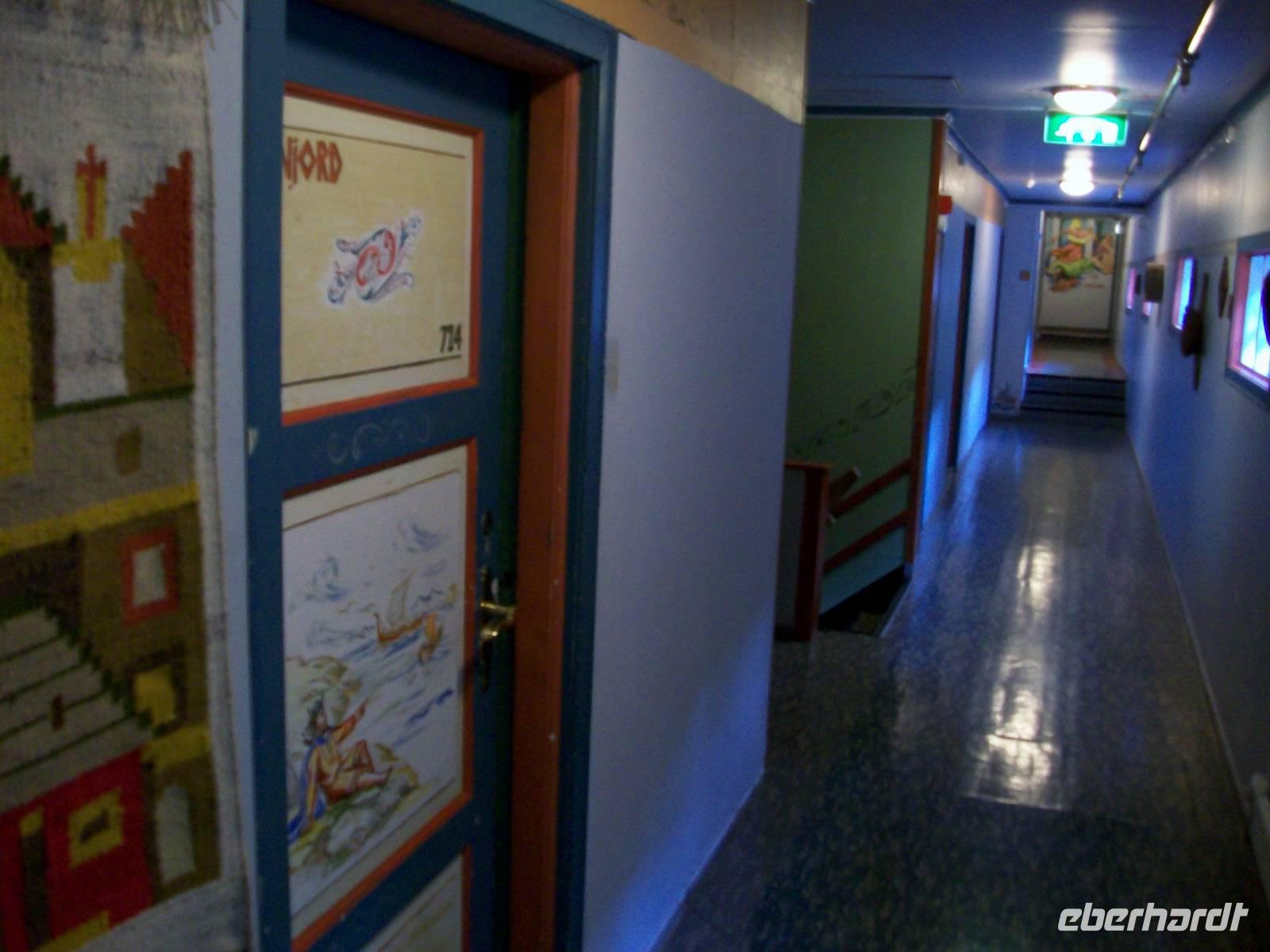 Unsere Fähre liegt schon bereit, groß wie ein Hochhaus, dieser Anblick ist immer wieder beeindruckend. Wir brauchen auch gar nicht lange warten, bald können wir an Bord gehen und über die lange Gangway geht es sacht hinauf zur Rezeption. Hier werden wir schon freundlich mit einem kleinen Getränk begrüßt, dann können wir die Kabinen beziehen.