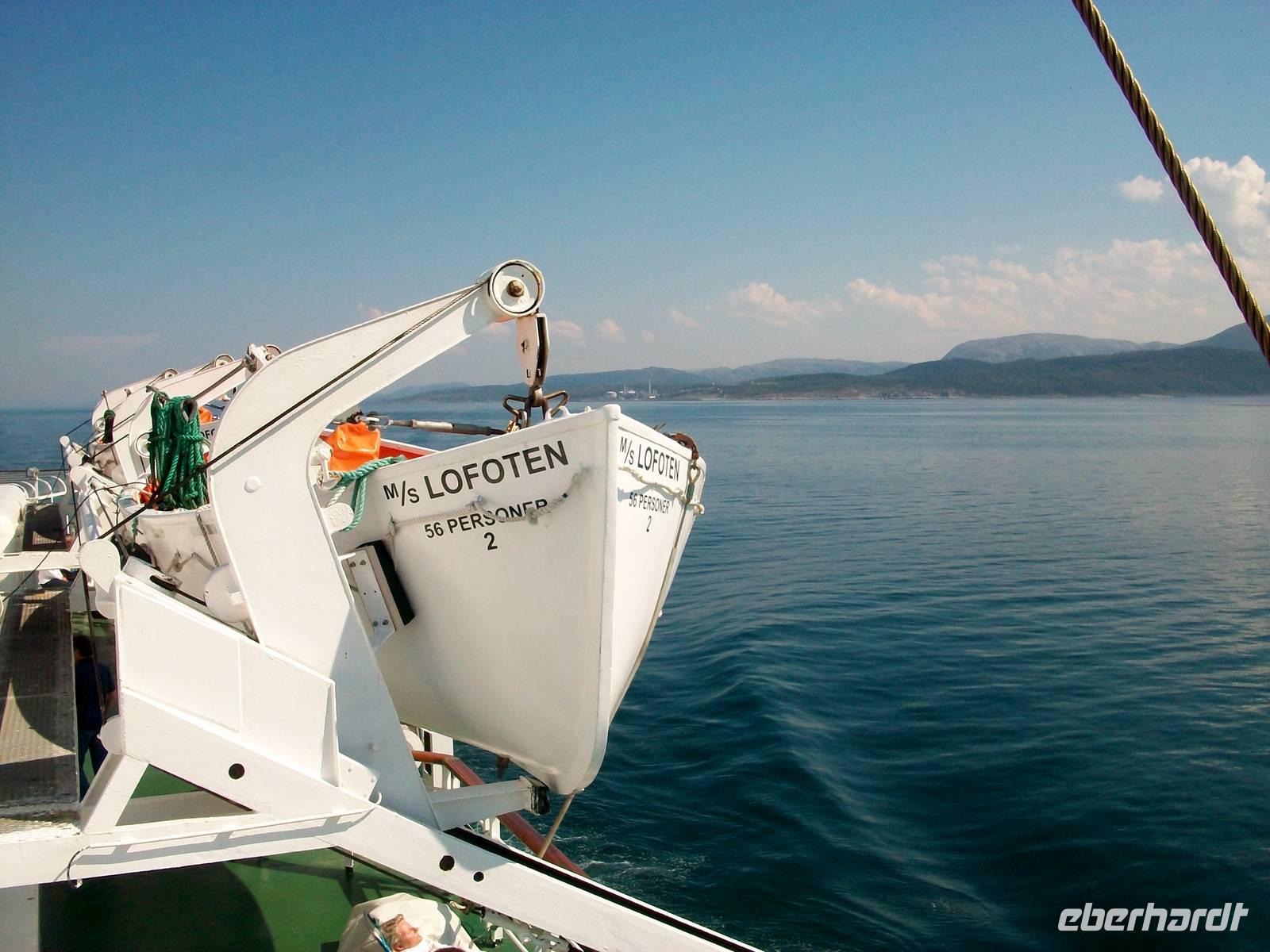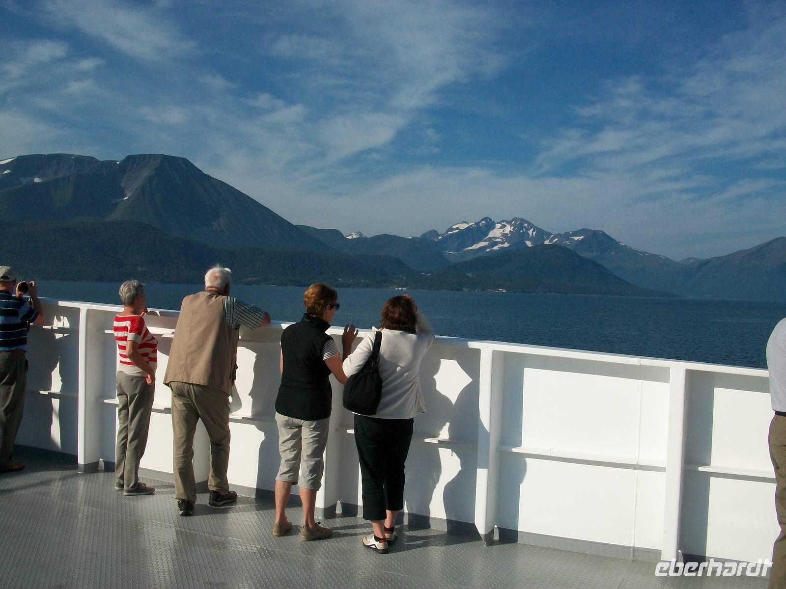 10.00 Uhr. Ein lautes Hupsignal kündigt die Abfahrt an, Taue werden eingeholt, Ketten rasseln und wenig später schaukelt unser Schiff auf den Fluten des Trondheimfjords. Dazu lacht die Sonne von einem fast wolkenlosen Himmel, ein Genuss der besonderen Art steht uns nun bevor.