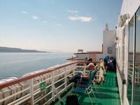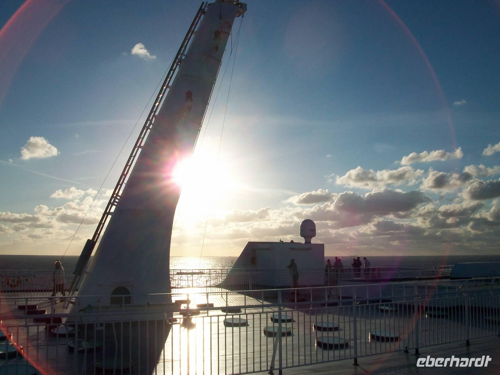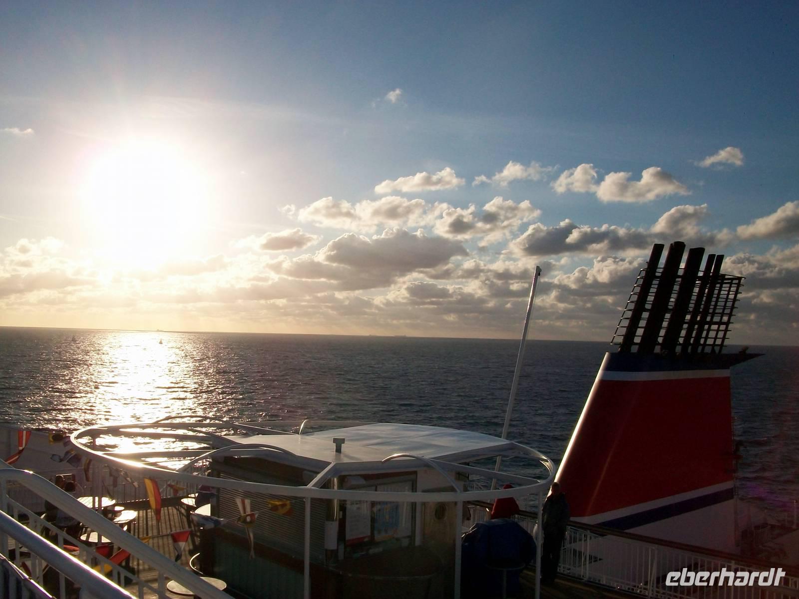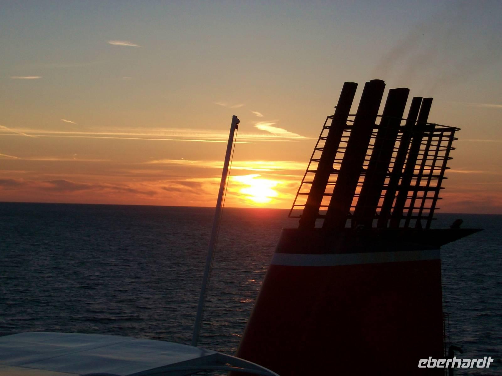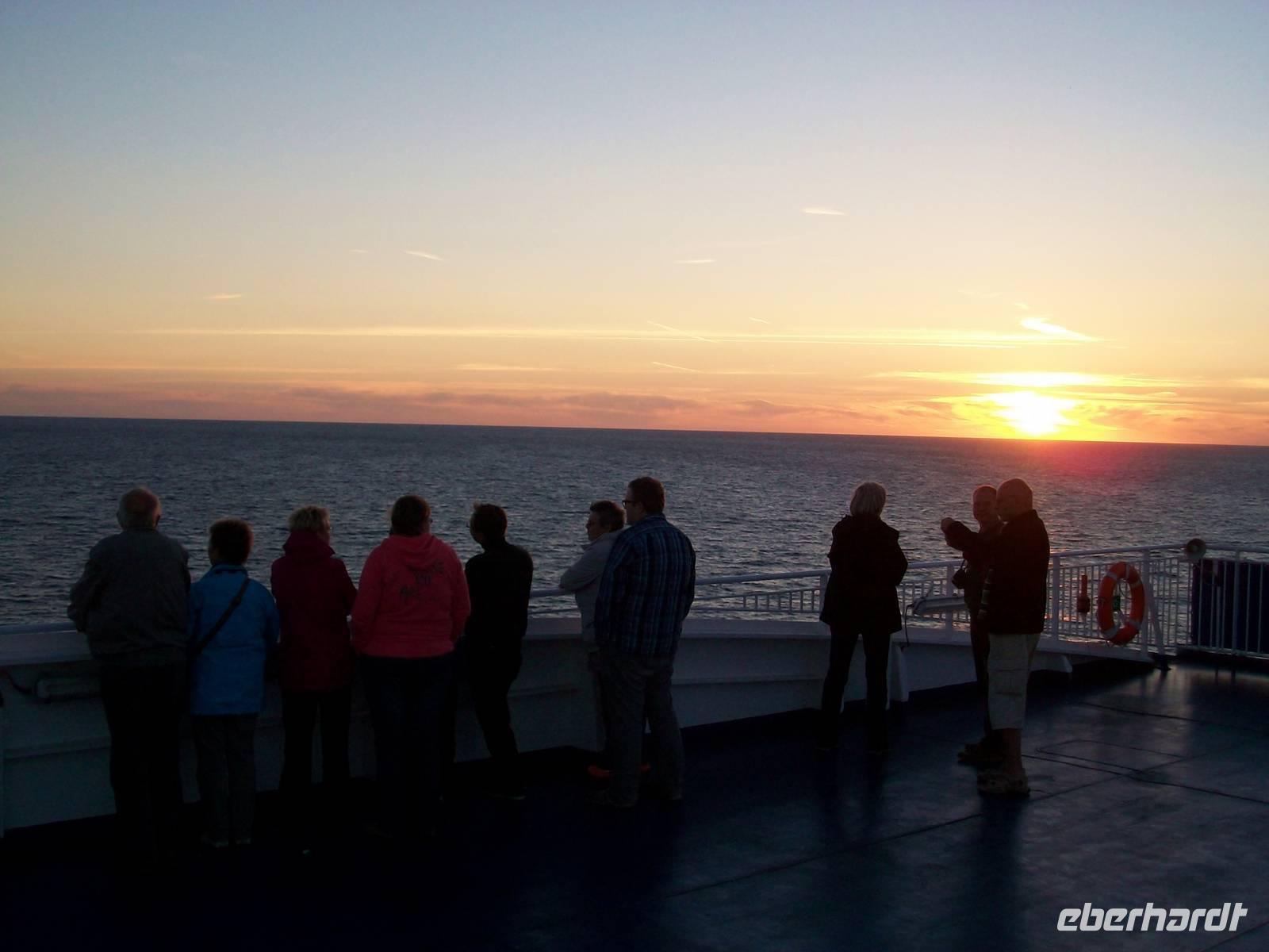 Dann ist das Buffet eröffnet und wir können die zahlreichen Leckereien genießen; in dieser Zeit legt auch das Schiff ab, wir gewinnen das Meer und nach dem Essen lohnt noch ein Spaziergang auf dem Deck bei weiterhin schönem Wetter und einem malerischen Sonnenuntergang.
