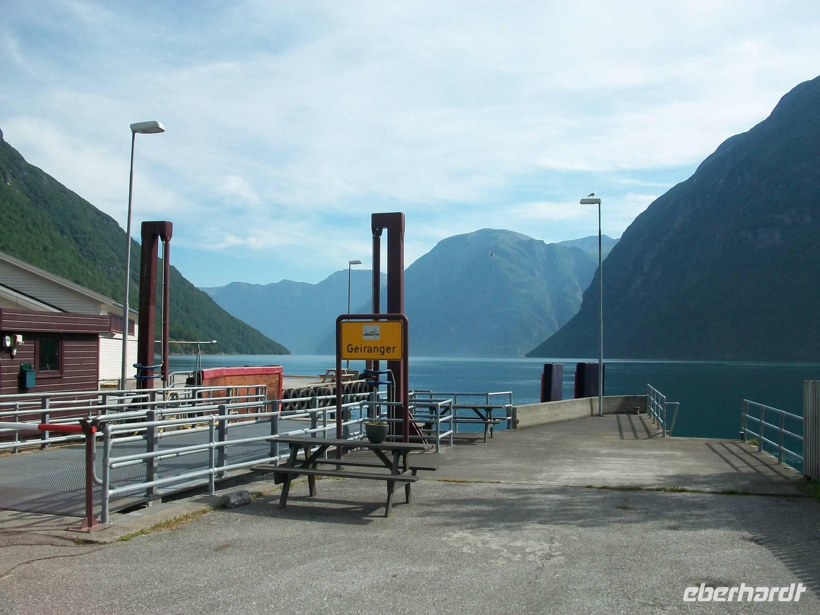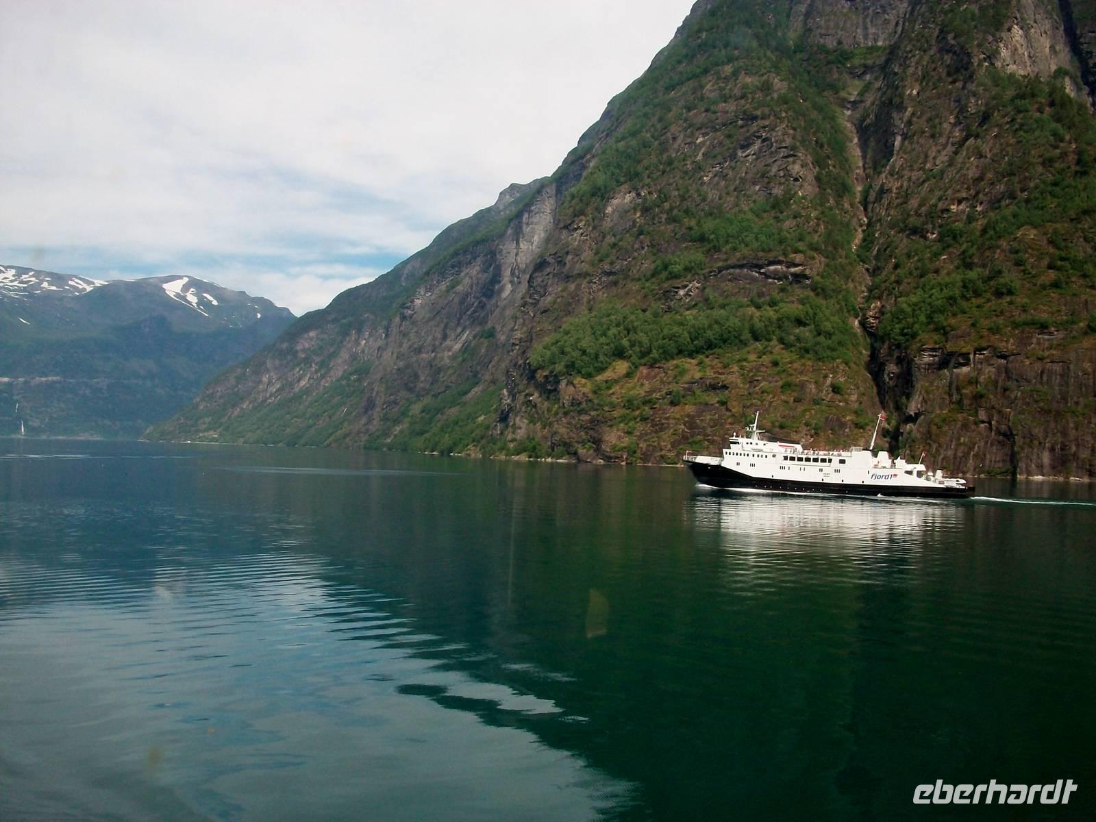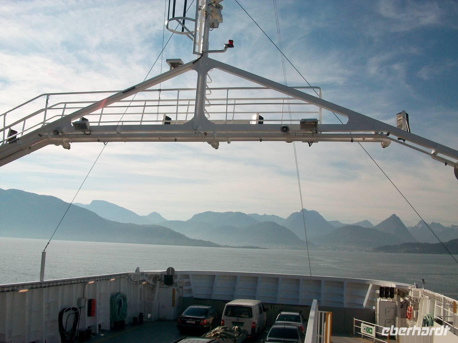 Dabei gestaltet sich das Wetter wieder schön und nach einer kurzen Wartezeit im beschaulichen Ort Hellesylt kommt auch schon unser Schiff um die Ecke gebogen. Es hat den Bauch voller Fahrzeuge und als diese an Land gelangt sind, können wir an Bord gehen. Jeder sucht sich nun ein schönes Plätzchen und wenig später geht die Fahrt los.