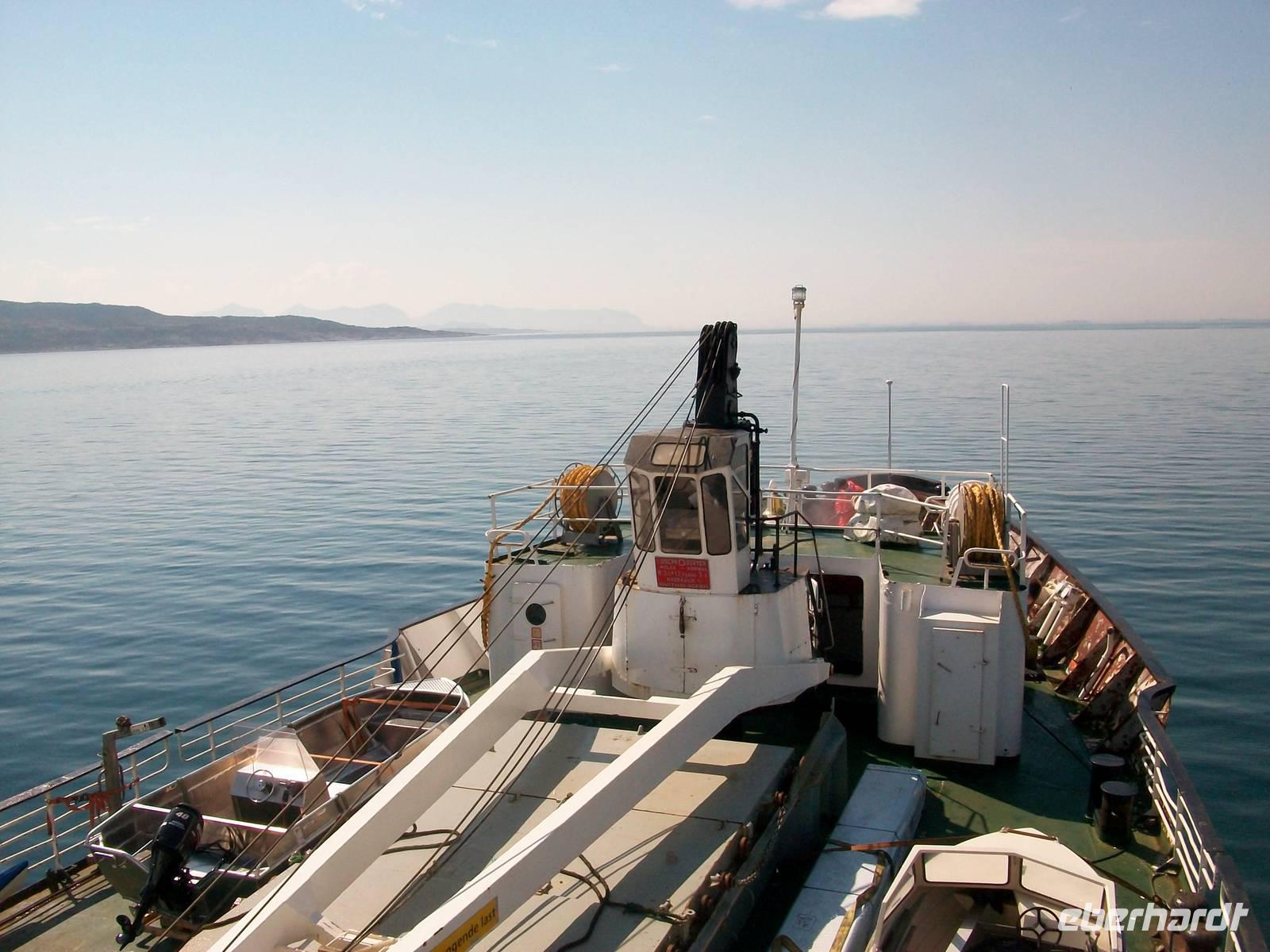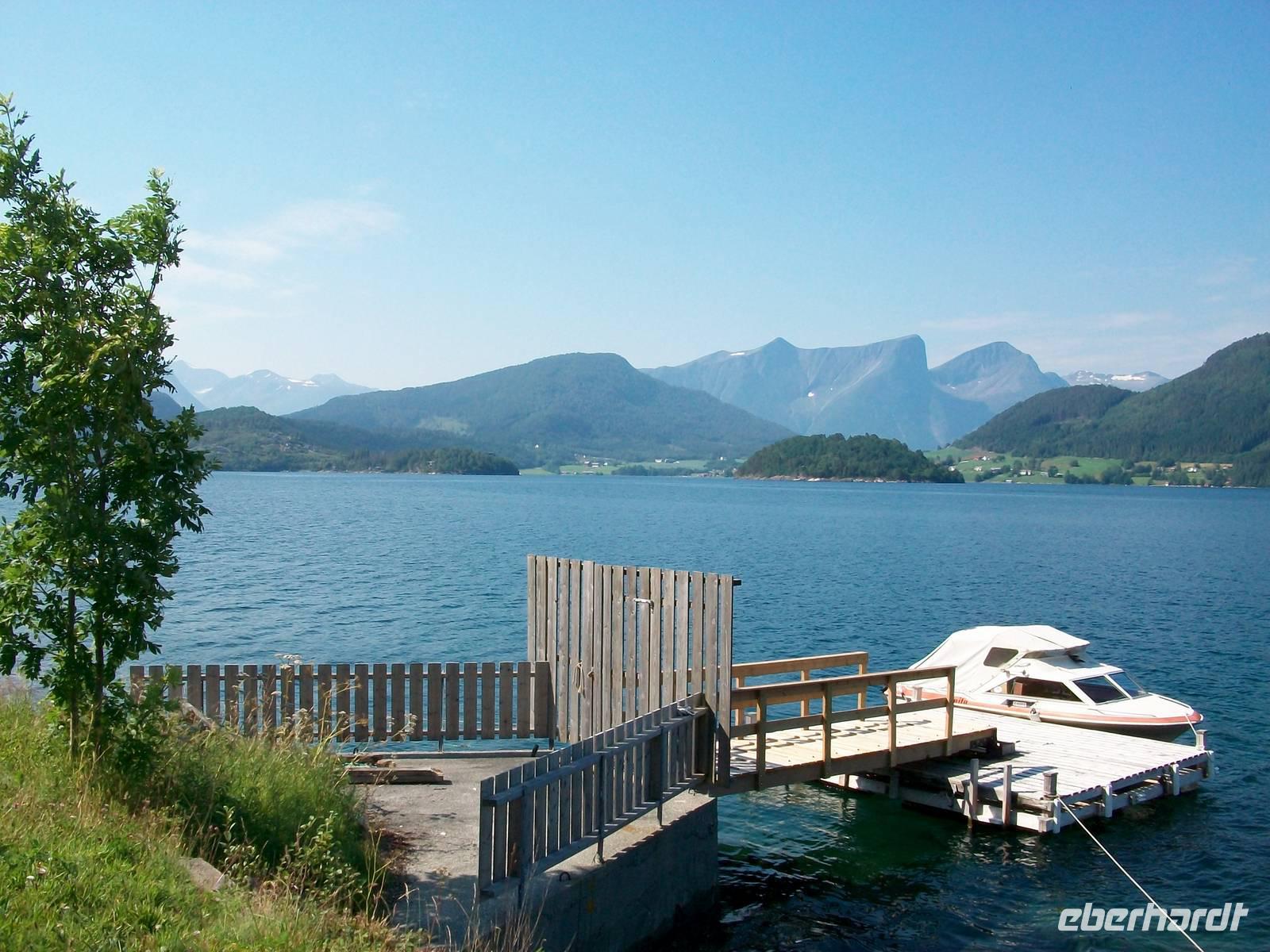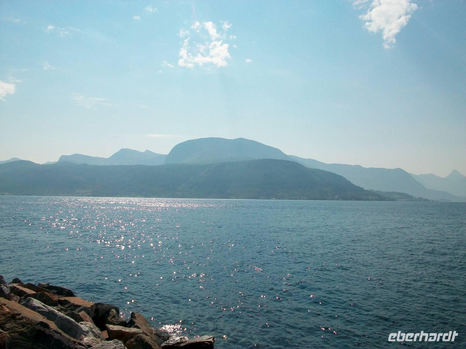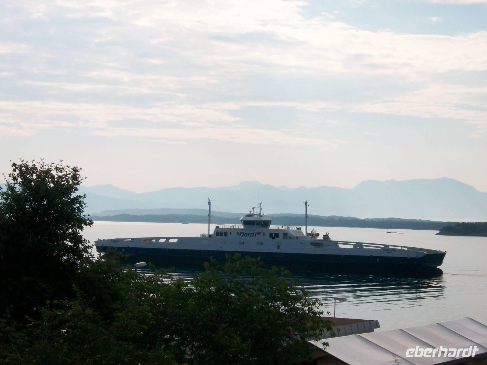 Dabei gestaltet sich das Wetter wieder schön und nach einer kurzen Wartezeit im beschaulichen Ort Hellesylt kommt auch schon unser Schiff um die Ecke gebogen. Es hat den Bauch voller Fahrzeuge und als diese an Land gelangt sind, können wir an Bord gehen. Jeder sucht sich nun ein schönes Plätzchen und wenig später geht die Fahrt los.