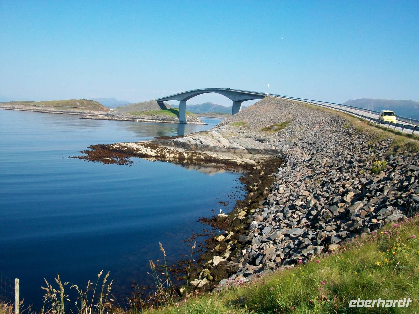 Es war für die norwegischen Ingenieure sicher nicht einfach eine solche Verbindung zu entwerfen; über zahlreiche Brücken schlängelt sich die Atlantikstraße. Dabei gibt es wunderschöne Ausblicke auf die zerklüftete Schärenküste mit einer spärlichen Vegetation. Von einem Hügel den wir zu Fuß erklimmen zeigt sich uns ein wunderschönes Panorama.
