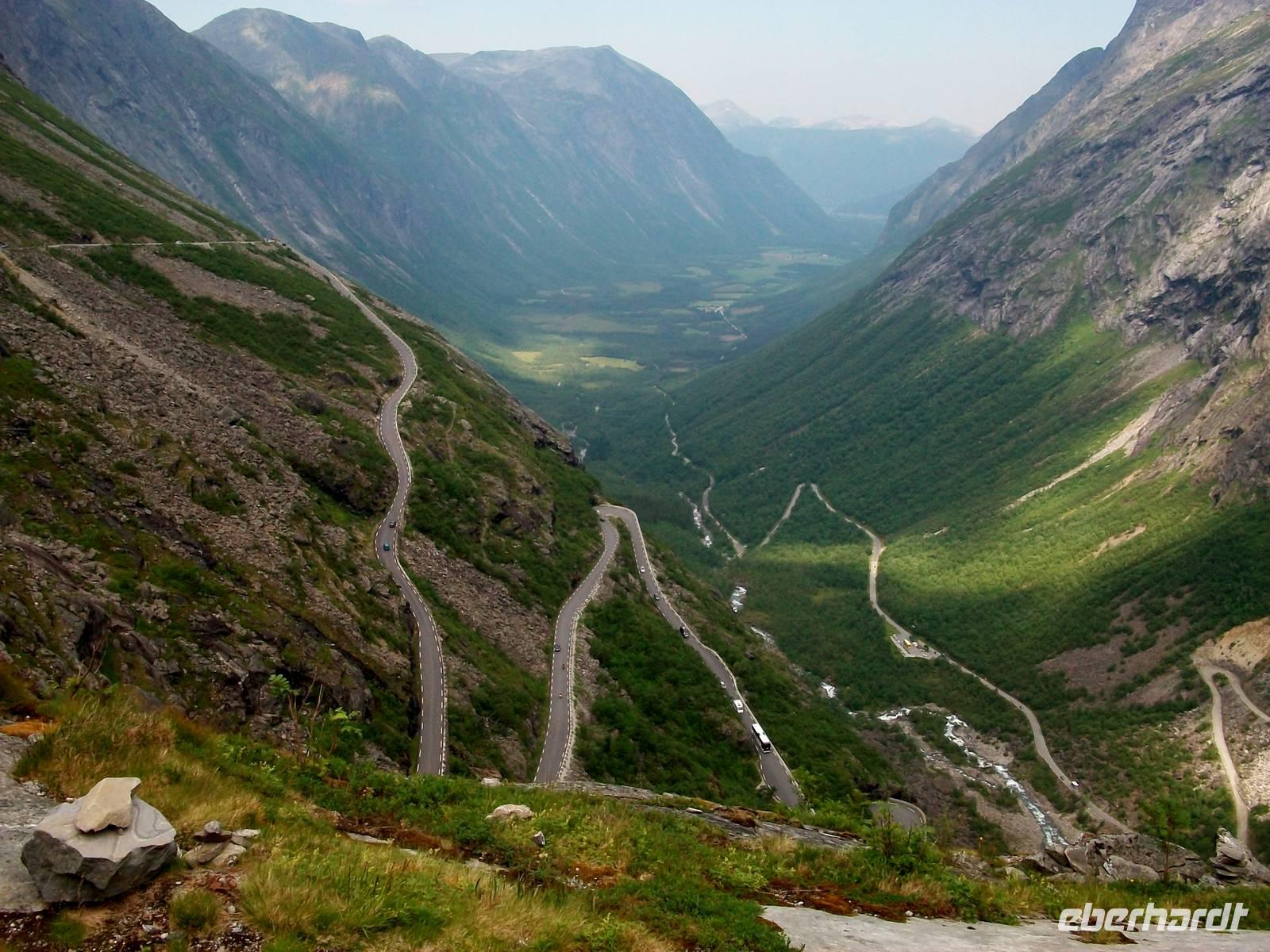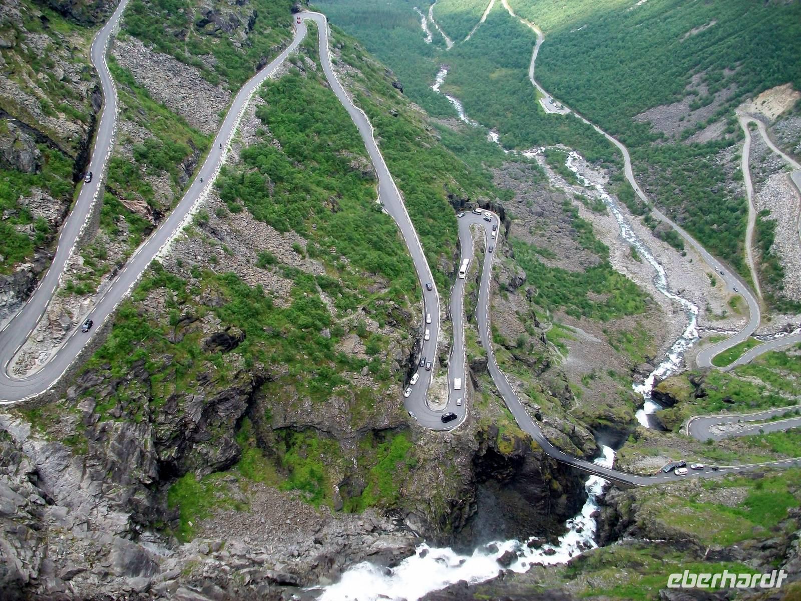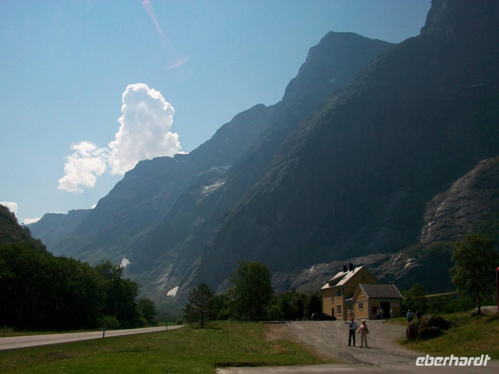 Gegen Mittag gelangen wir zur Trollwand; sie steigt senkrecht einen Kilometer an und hier werden wir uns erst einmal bei einem Imbiss stärken. Es ist angenehm warm und gut gestärkt fahren wir nun dem unbestrittenen Höhepunkt des heutigen Tages entgegen. Durch ein Tal gelangen wir einer weiteren Felswand immer näher. An dieser Wand sollen einst mächtige Riesen, die Bergtrolle, hinaufgestiegen sein, deshalb nennt man sie die Trollstigen. Bei einem kurzen Stopp davor halten wir den Atem an; eine Serpentinenstraße schlängelt sich dort hinauf, ihr werden wir in den nächste Minuten folgen.