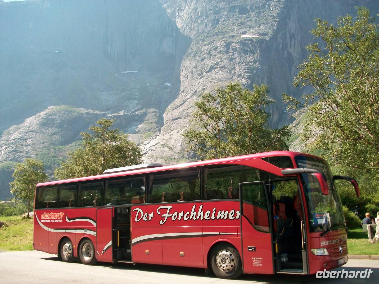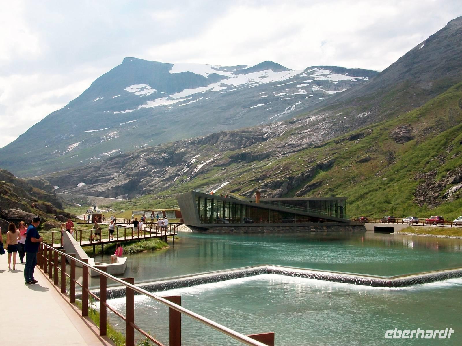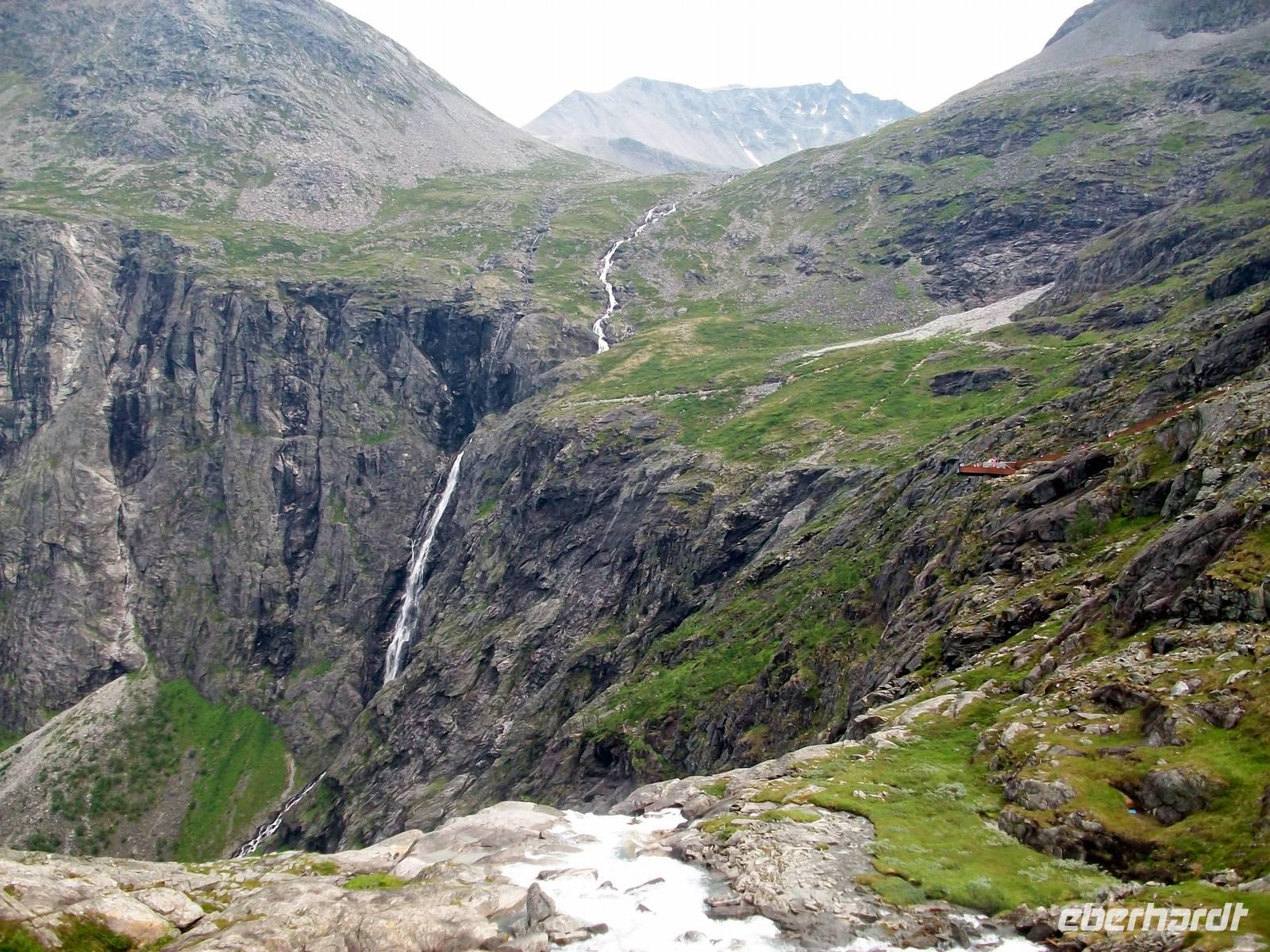 Gegen Mittag gelangen wir zur Trollwand; sie steigt senkrecht einen Kilometer an und hier werden wir uns erst einmal bei einem Imbiss stärken. Es ist angenehm warm und gut gestärkt fahren wir nun dem unbestrittenen Höhepunkt des heutigen Tages entgegen. Durch ein Tal gelangen wir einer weiteren Felswand immer näher. An dieser Wand sollen einst mächtige Riesen, die Bergtrolle, hinaufgestiegen sein, deshalb nennt man sie die Trollstigen. Bei einem kurzen Stopp davor halten wir den Atem an; eine Serpentinenstraße schlängelt sich dort hinauf, ihr werden wir in den nächste Minuten folgen.