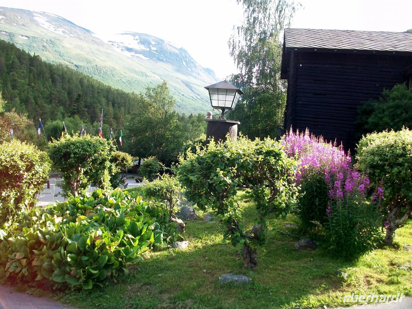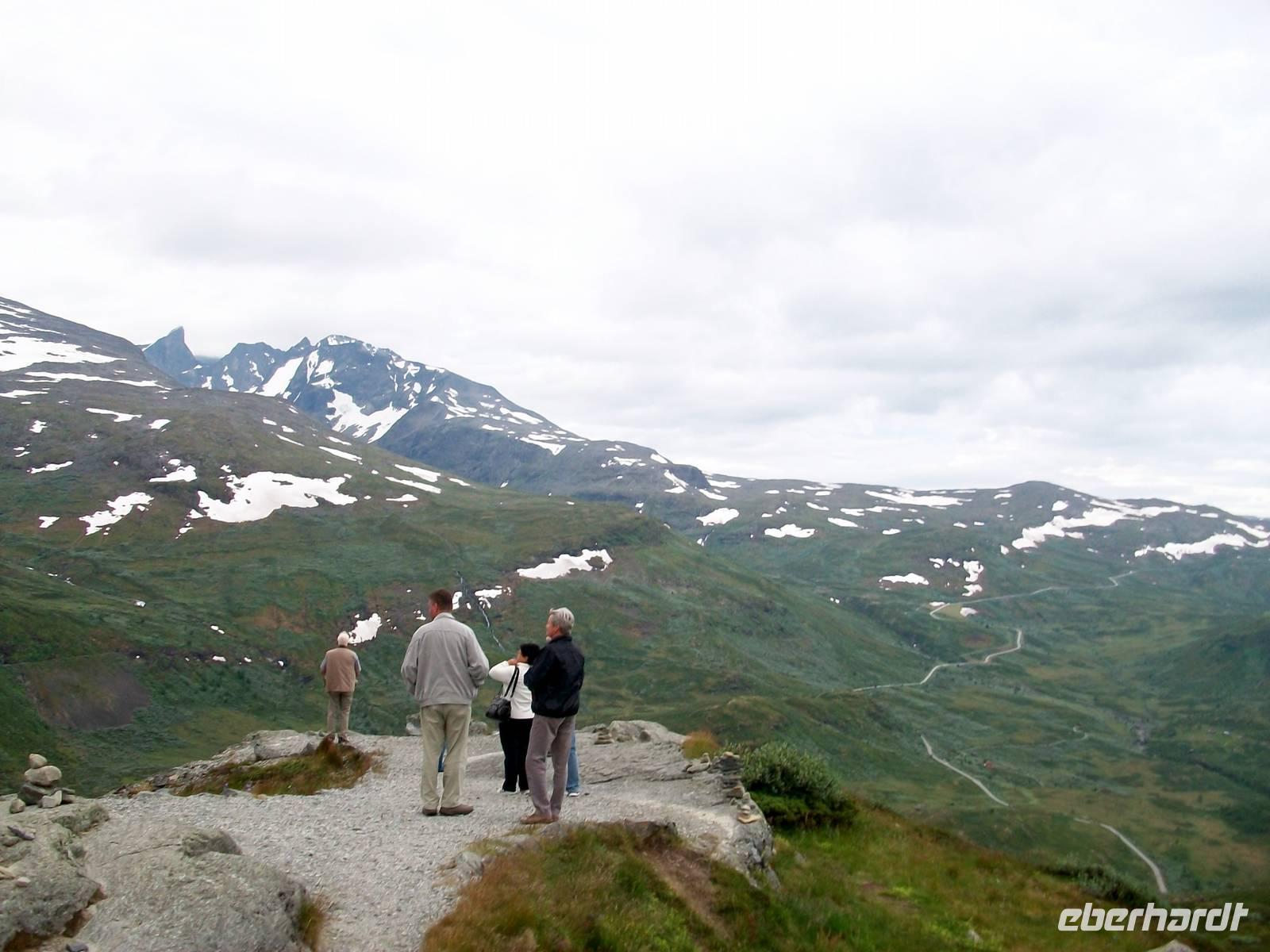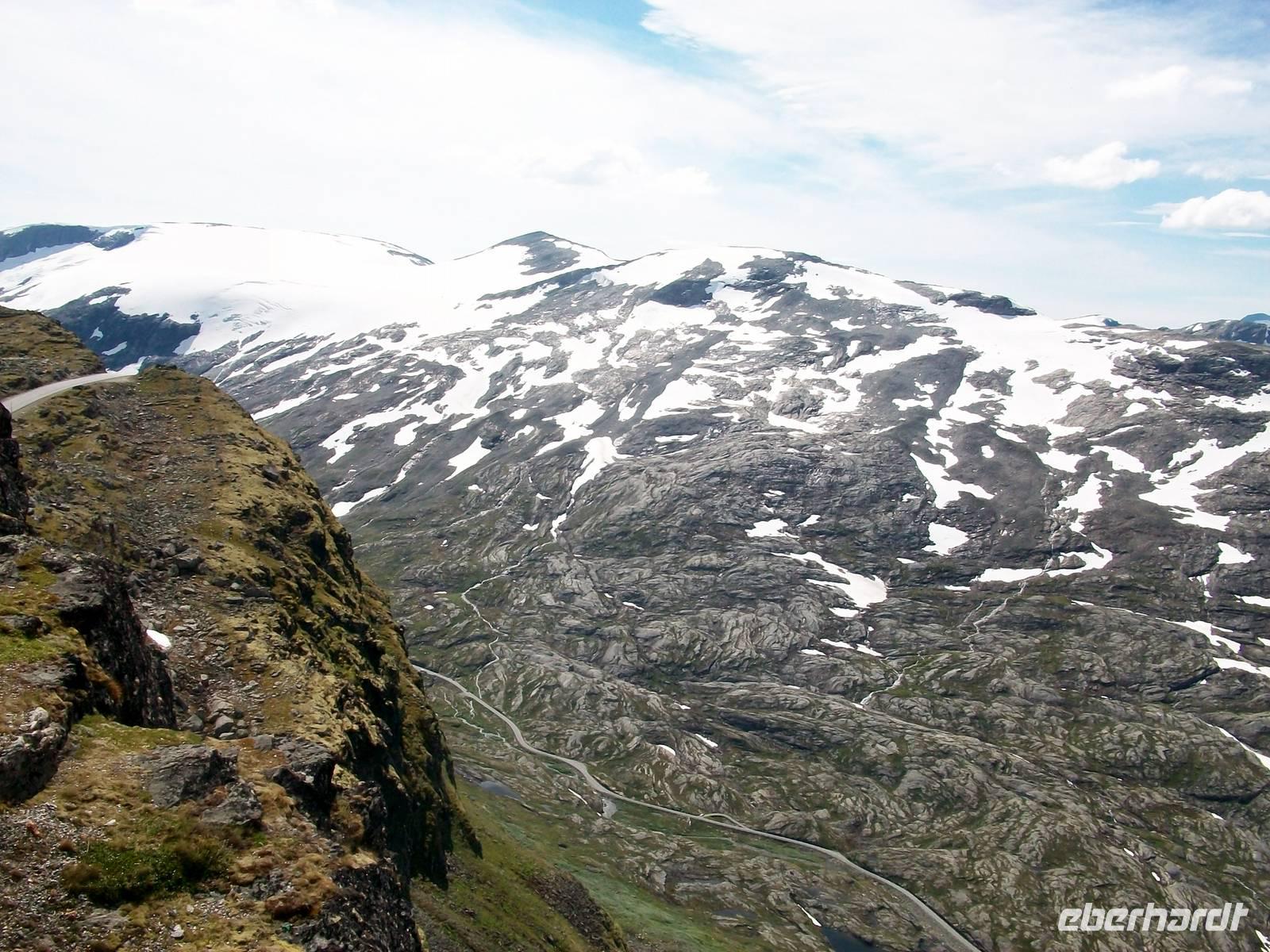 Zunächst aber steht bei unsere Fahrt dahin eine weitere phantastische Naturlandschaft auf dem Programm. Schnell steigt die Straße an und wir gelangen ein weiteres Mal in eine Fjelllandschaft. Es ist das Sognefjell, ein bevorzugtes Ziel für die skandinavischen Skifreunde. Als wir dann oben anlangen ist selbst jetzt im Sommer noch viel Schnee zu sehen der nur langsam abschmilzt.