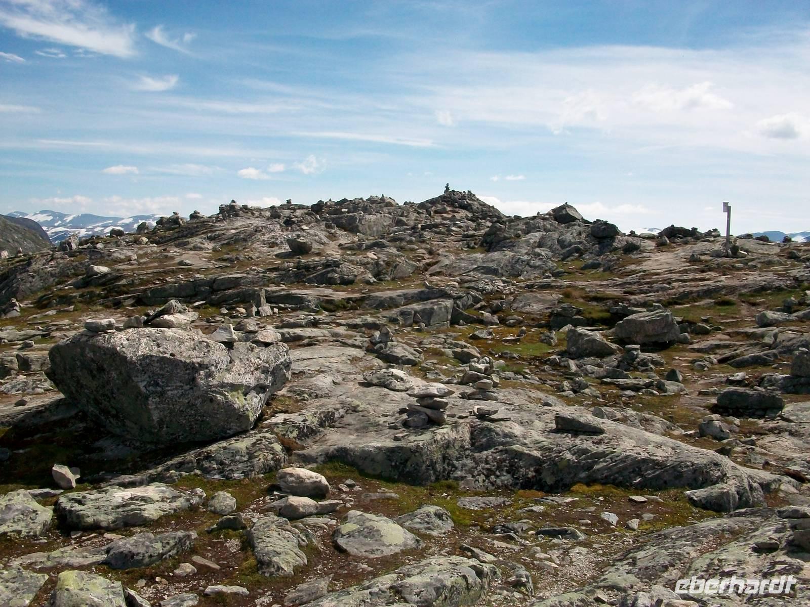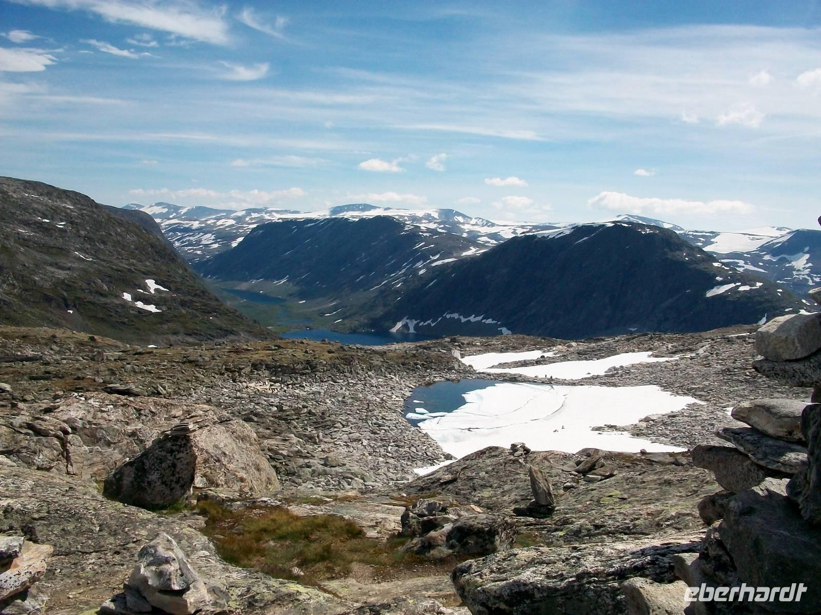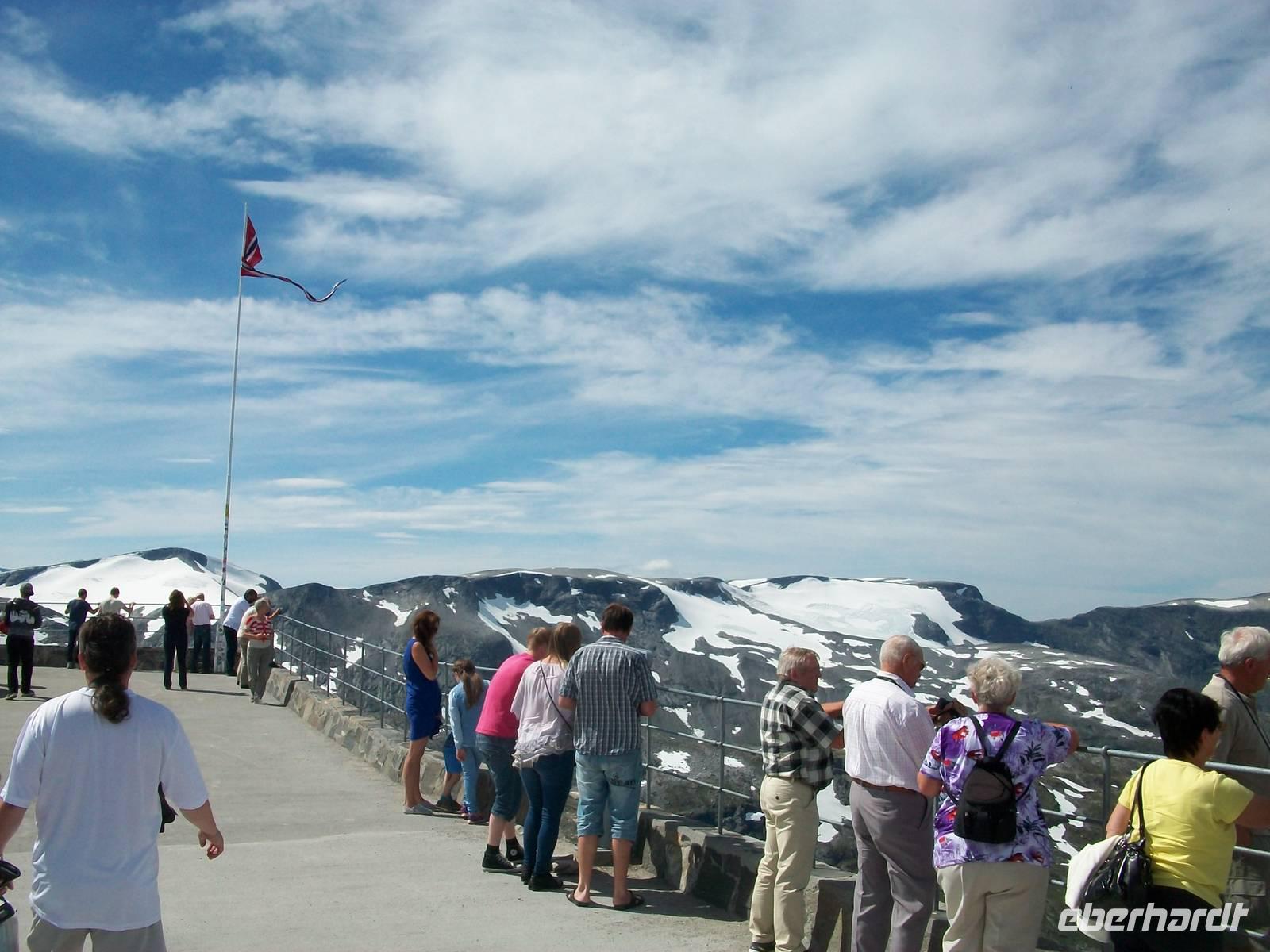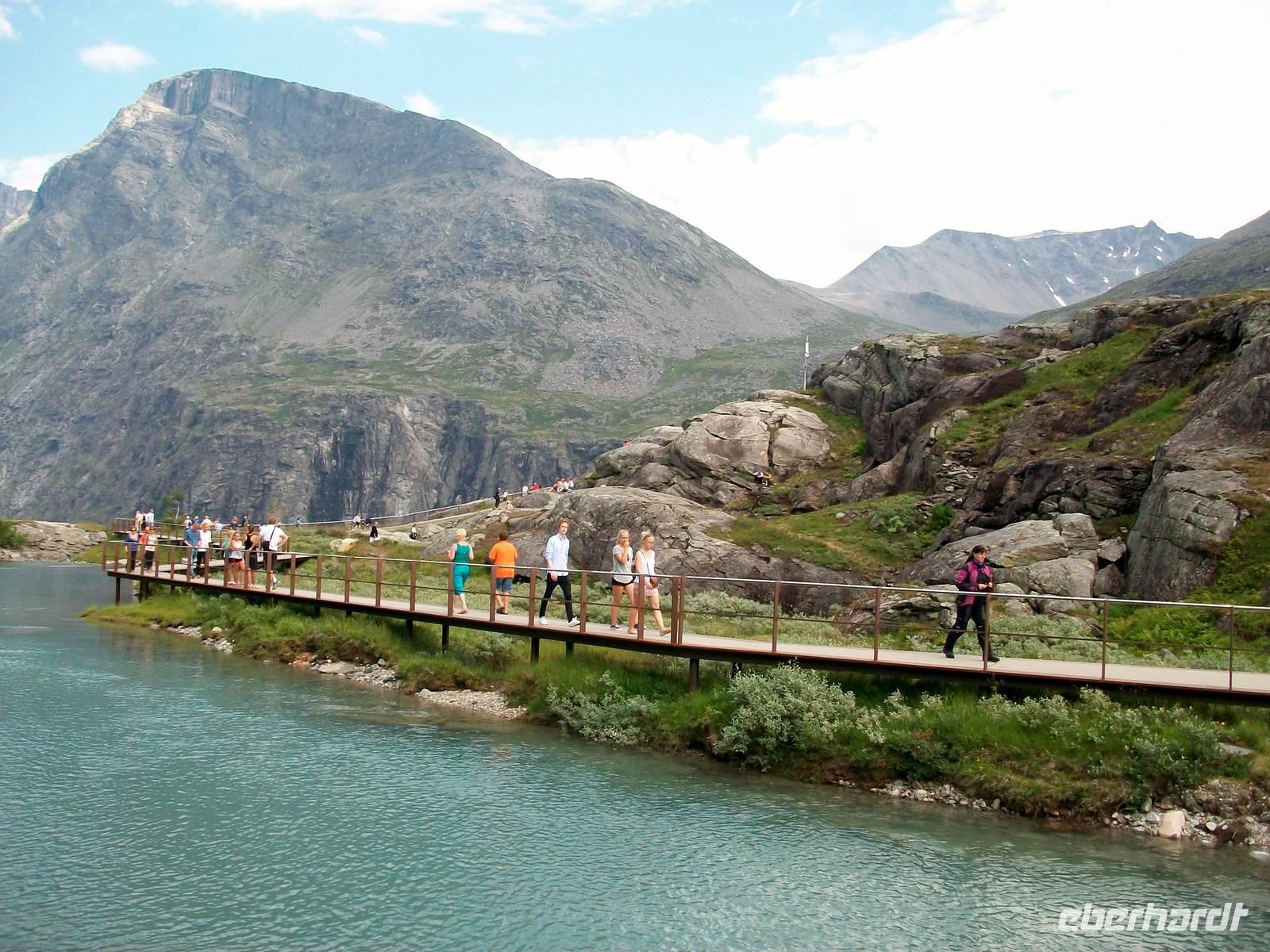Zunächst aber steht bei unsere Fahrt dahin eine weitere phantastische Naturlandschaft auf dem Programm. Schnell steigt die Straße an und wir gelangen ein weiteres Mal in eine Fjelllandschaft. Es ist das Sognefjell, ein bevorzugtes Ziel für die skandinavischen Skifreunde. Als wir dann oben anlangen ist selbst jetzt im Sommer noch viel Schnee zu sehen der nur langsam abschmilzt.