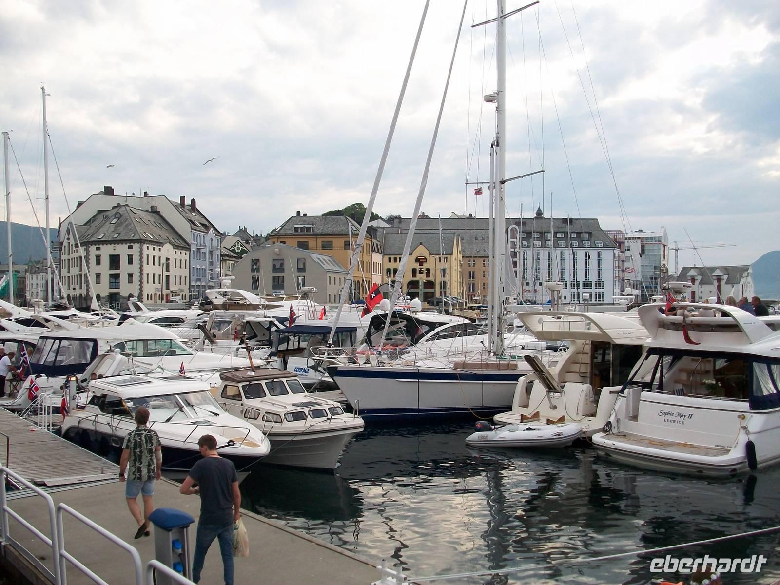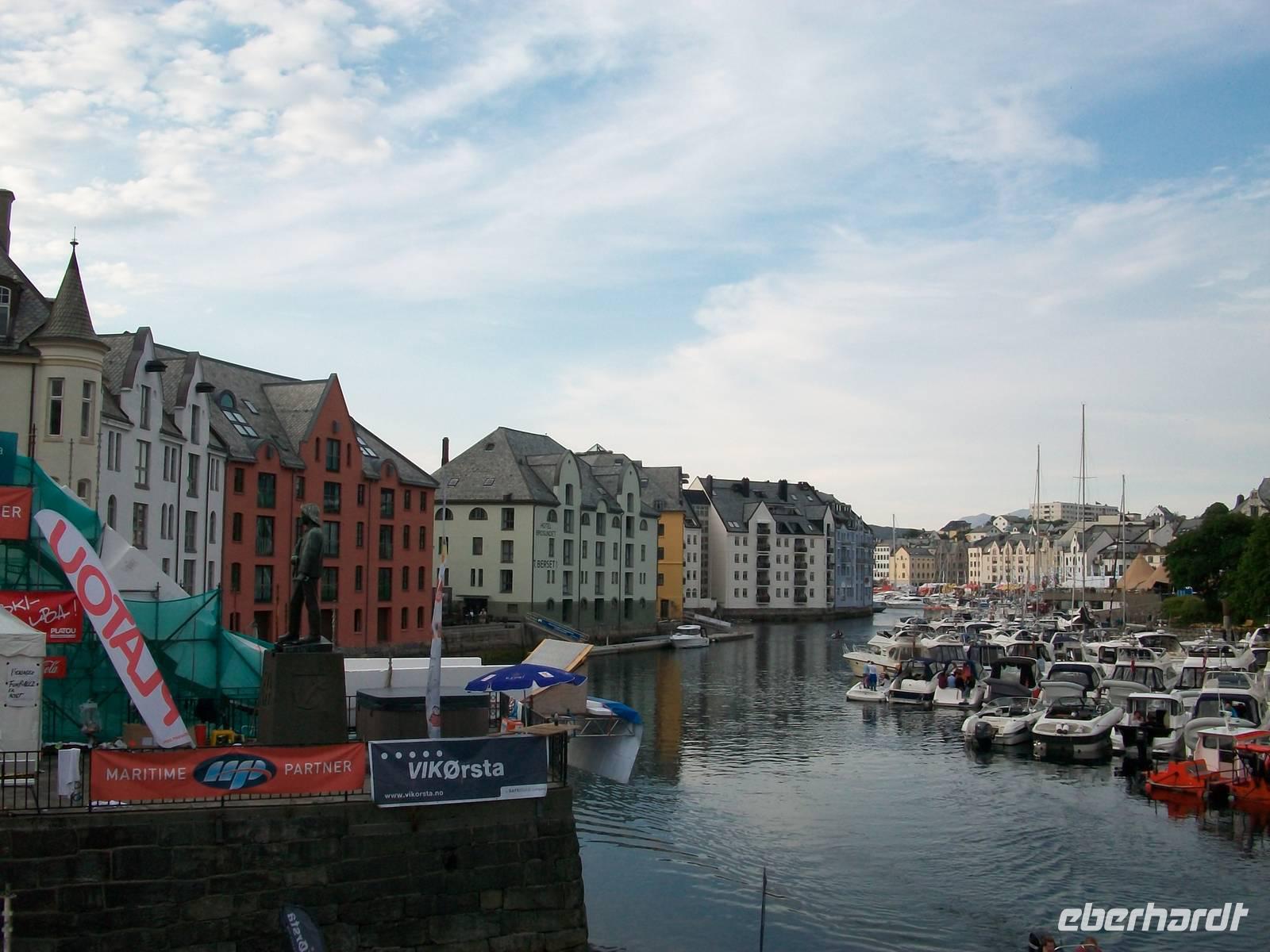 Der Ort Ålesund liegt auf verschiedenen Inseln, besonders schön ist der Blick vom Hausberg hinunter, er steigt gleich hinter unserm Hotel an und ein Spaziergang hinauf bringt eine letzte schöne Impression eines ereignisreichen Tages.