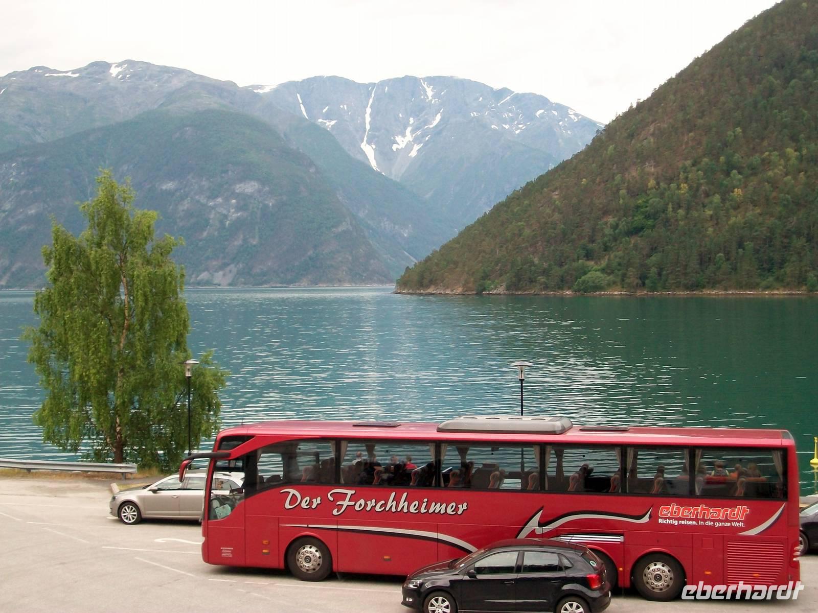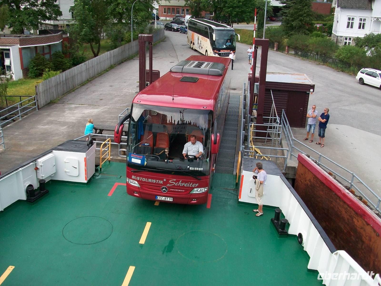 Doch dann müssen wir weiter, die Fähre dürfen wir nicht verpassen! Viele Serpentinen bringen uns wieder hinunter auf Meeresniveau; entlang der faszinierenden Fjordlandschaft, durch dunkle Tunnel und über hohe Brücken langen wir 8.40 Uhr in Kaupanger an, hier beginnt unsere nächste Kreuzfahrt.
