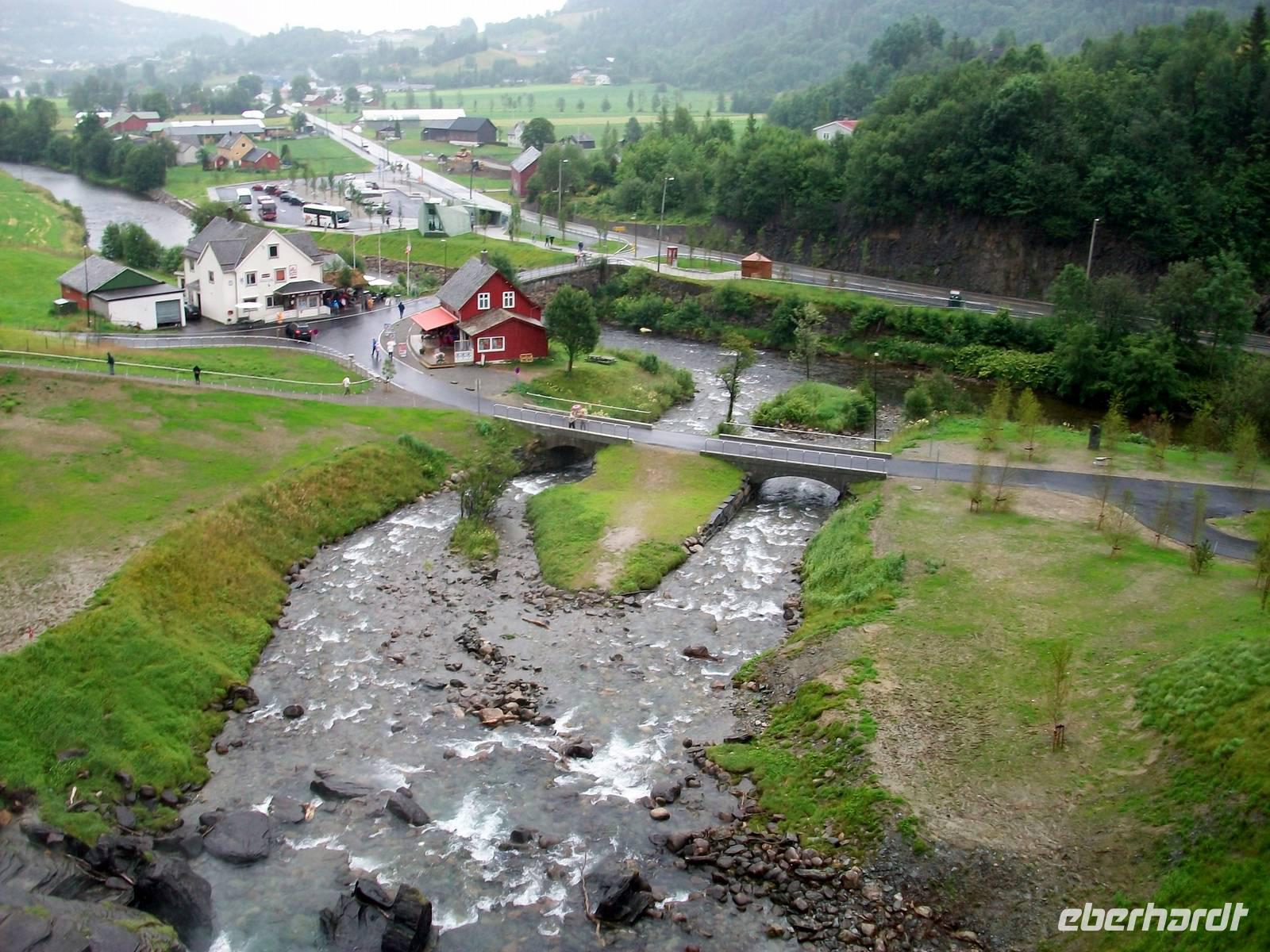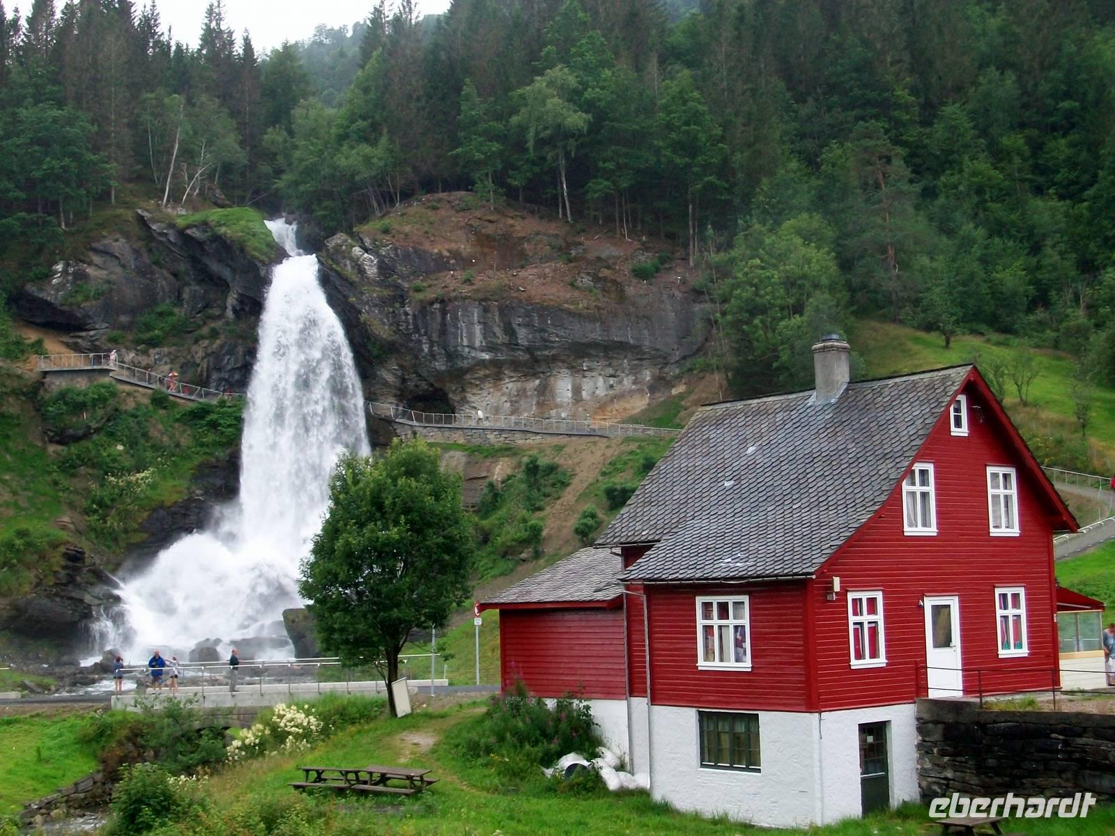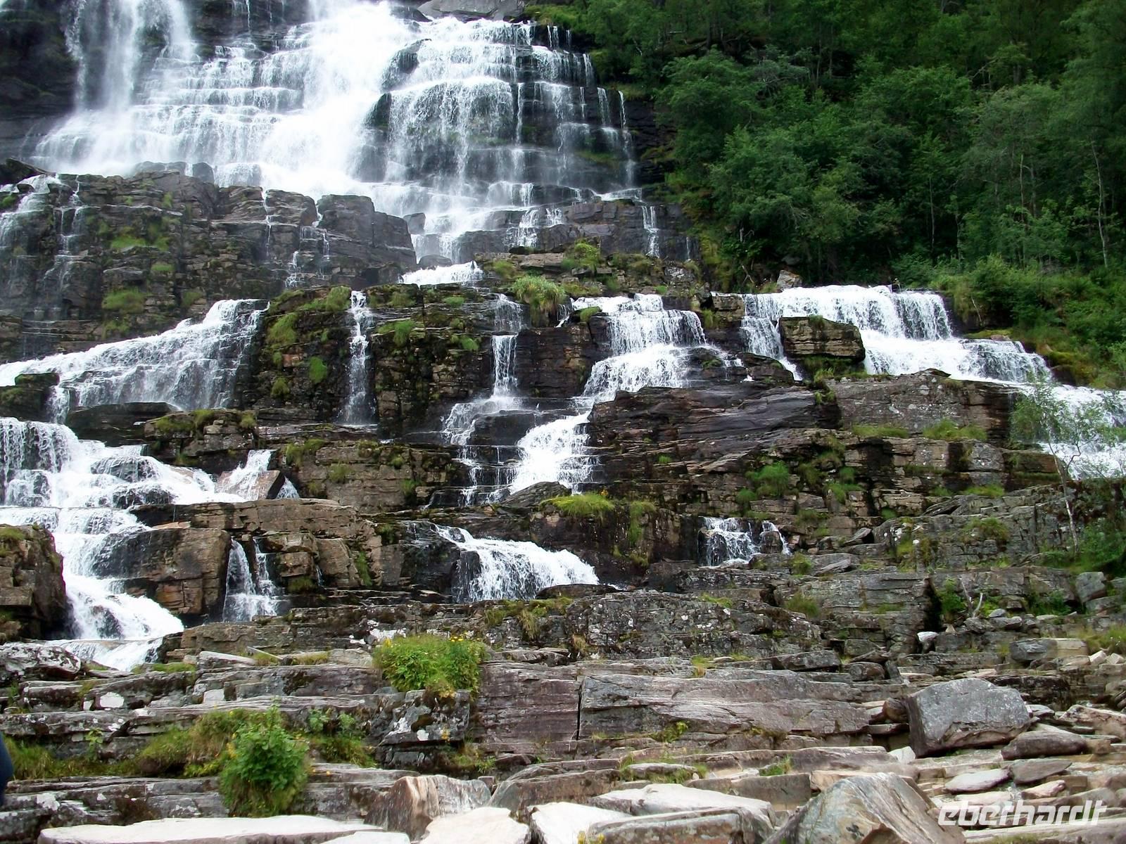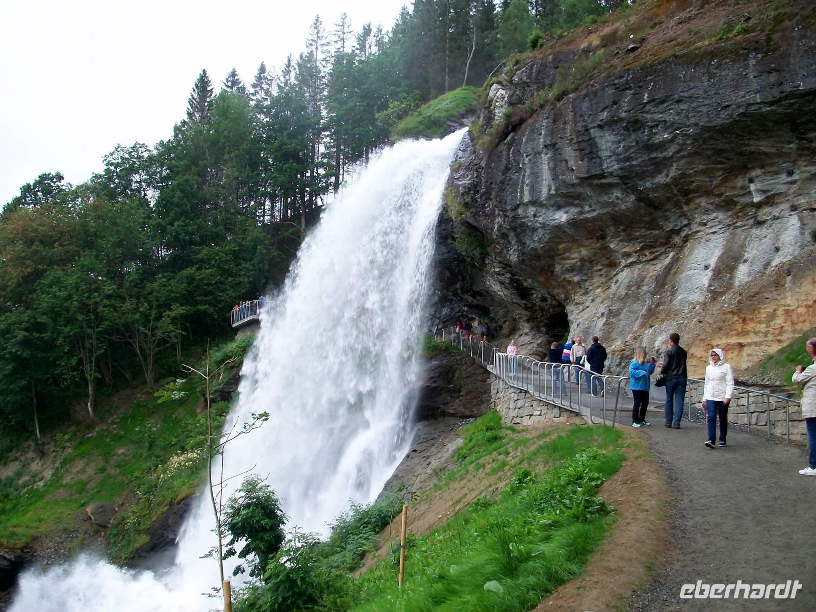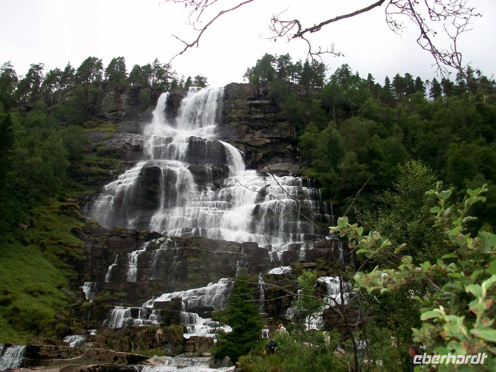 Doch auf unserer Fahrt in Richtung Bergen haben wir noch einen Höhepunkt vor uns, wir wollen einen Wasserfall besuchen. Es ist der Twindefossen dessen Wasser man Wunderkräfte zuschreibt. Doch zunächst öffnet Petrus seine himmlischen Schleusen und er lässt einen kräftigen Schauer auf uns herab. Doch das währt nicht lange, als wir am Wasserfall ankommen, hat der Regen aufgehört und wir kommen in den ungetrübten Genuss dieses Naturschauspiels. Das Wasser kommt aus über hundert Metern herabgestürzt und bildet dabei zahlreiche Kaskaden. Der feine Wasserstaub netzt dabei die Haut und das Rauschen übertönt jedes andere Geräusch.