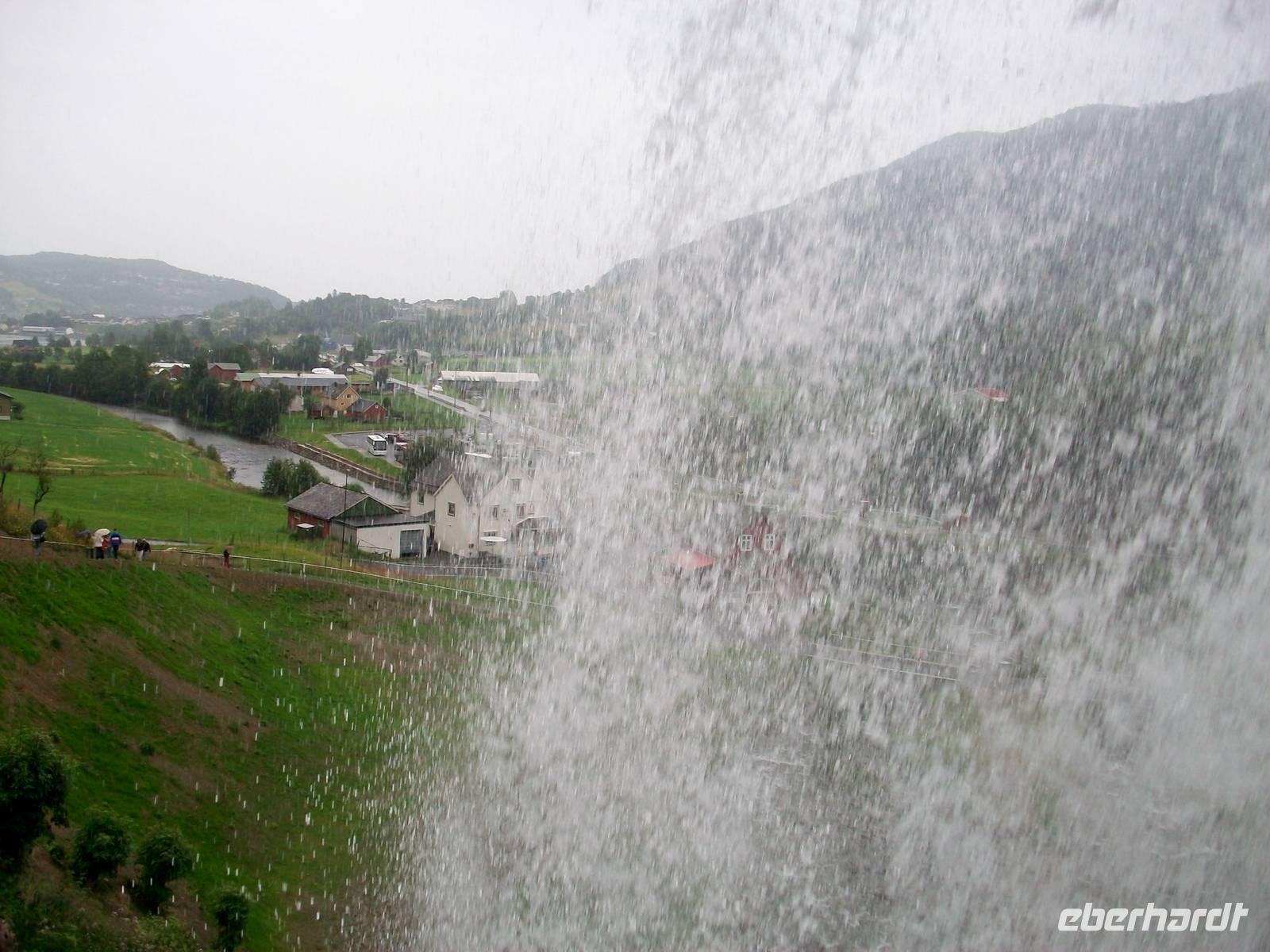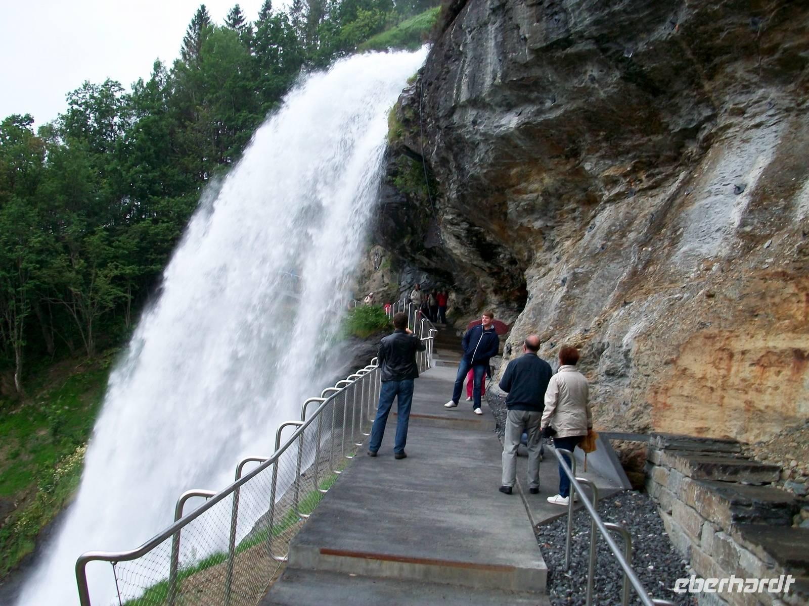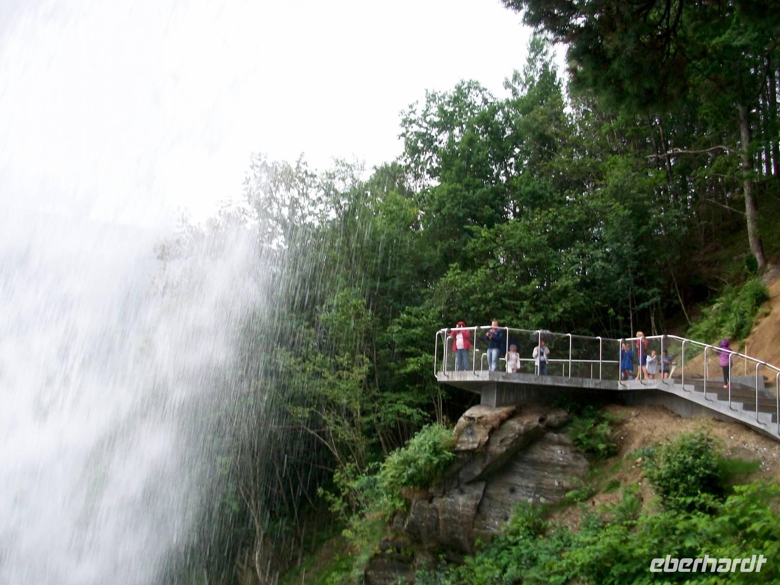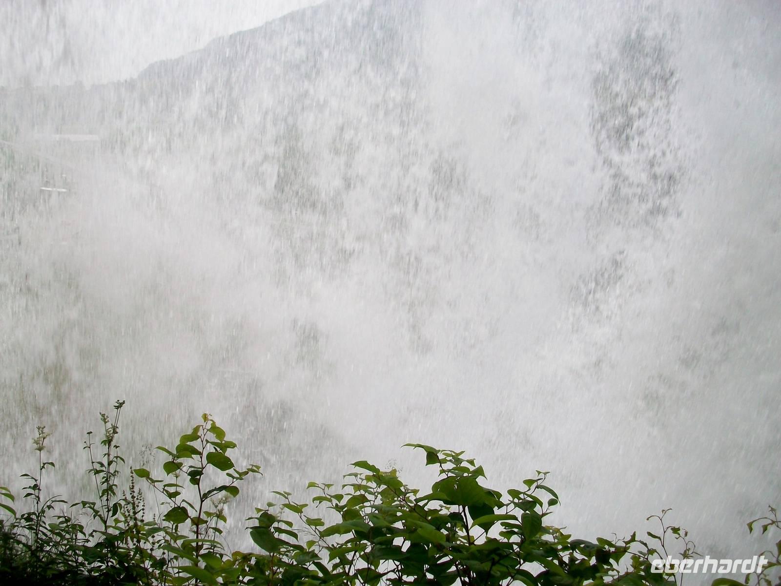 Der Fußweg hinauf zum Fall geht leicht bergan, ein mächtiges Brausen kündet von seiner Kraft und das Besondere ist, man kann dahinter treten. Das ist sehr eindrucksvoll; über dem Kopf schießt das Wasser herab und bildet einen breiten Schleier durch den man verschwommen die Straße im Tal erblickt, einfach grandios!