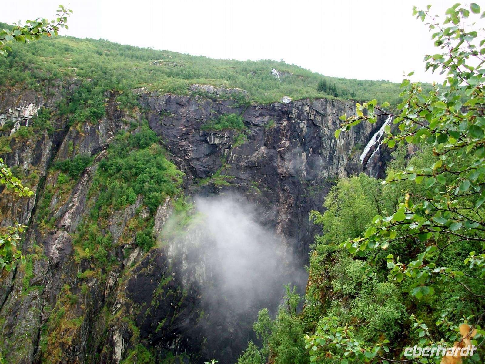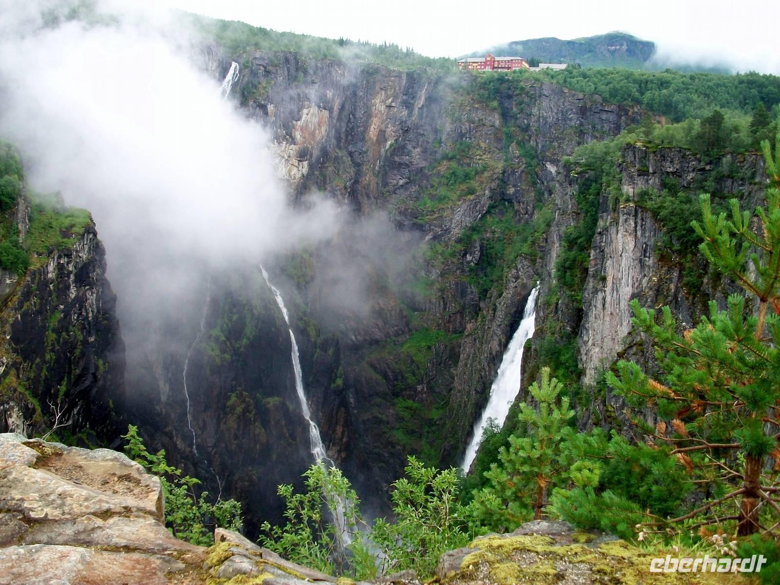 Dann geht es weiter, leider lässt Petrus im Augenblick nicht allzu viel Sicht zu, wir gelangen zum Hardangerfjord an dessen steilen Hängen wir entlangfahren und kommen den Bergen immer näher. Im Berg selbst verlaufen Kehrtunnels, wir drehen uns mehrfach im Kreis und steigen dabei schnell an. Als wir fast oben angelangt sind, sehen wir vor uns eine Nebelwolke, sie wird gebildet von einem weiteren Wasserfall, es ist der Vøringfossen. Er kommt aus fast 200 Metern und fällt mit einem mächtigen Brausen und Donnern in einen schmalen Bergkessel. Das schauen wir uns nun etwas genauer an, zuerst von der Straße und dann gelangen wir noch hinauf zum Hotel zum oberen Aussichtspunkt. Hier möchte uns Petrus aber ärgern, er sendet eine Wolke und nimmt uns damit die Sicht, schade!