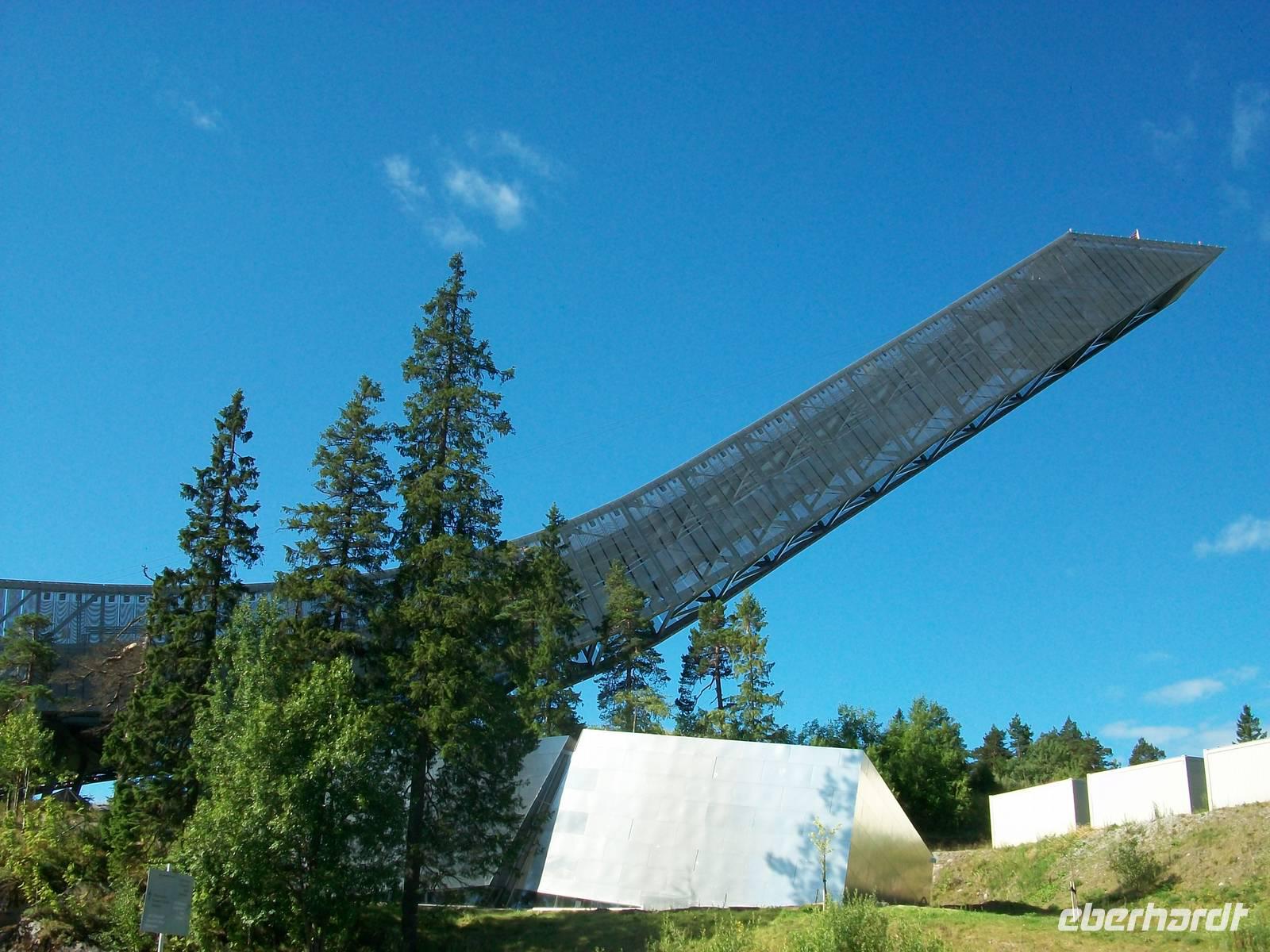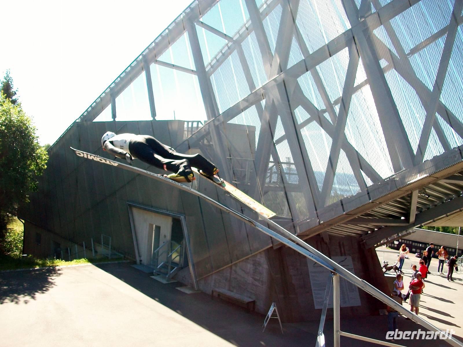 Atemberaubend ist der Blick hinunter zum Aufsprunghang, nicht weniger attraktiv ist der Blick hinauf zum modernen Sprungturm, es ist eine freitragende Konstruktion die über dem Hügel zu schweben scheint.