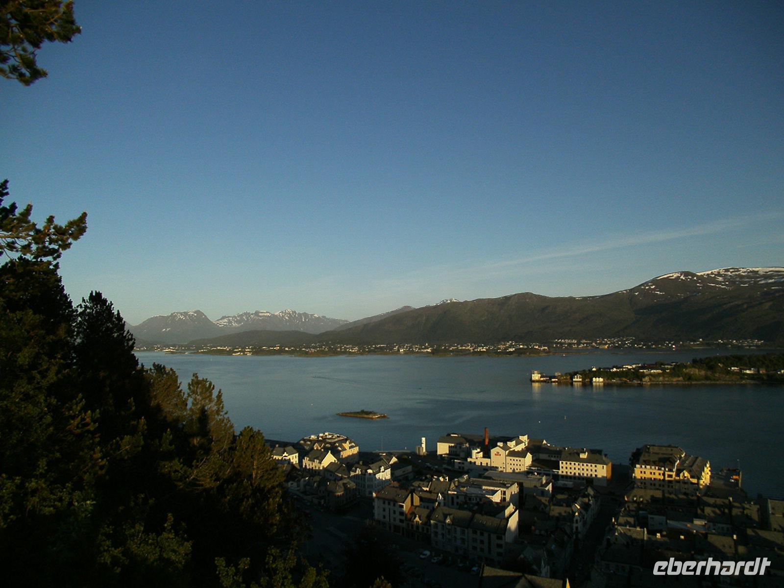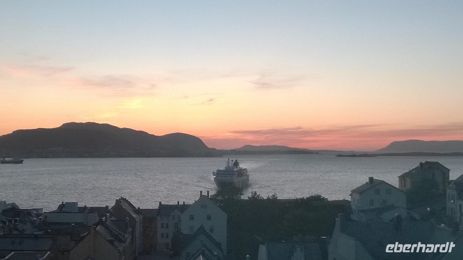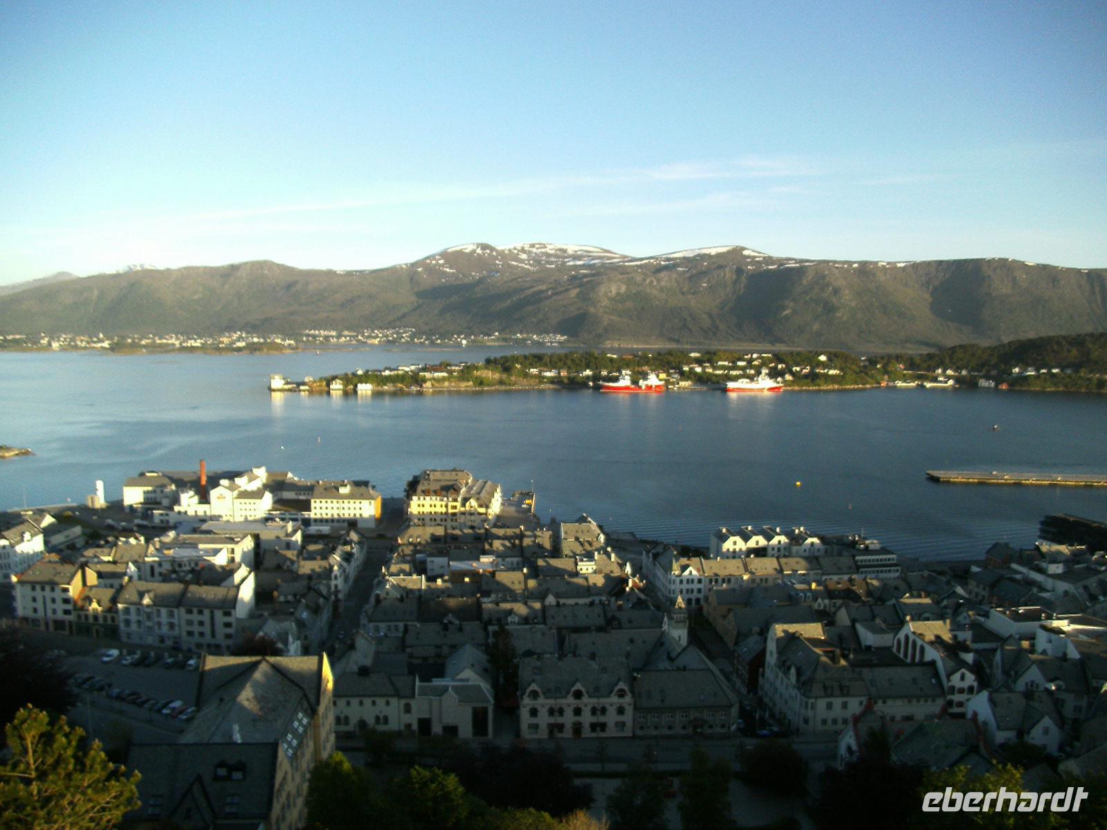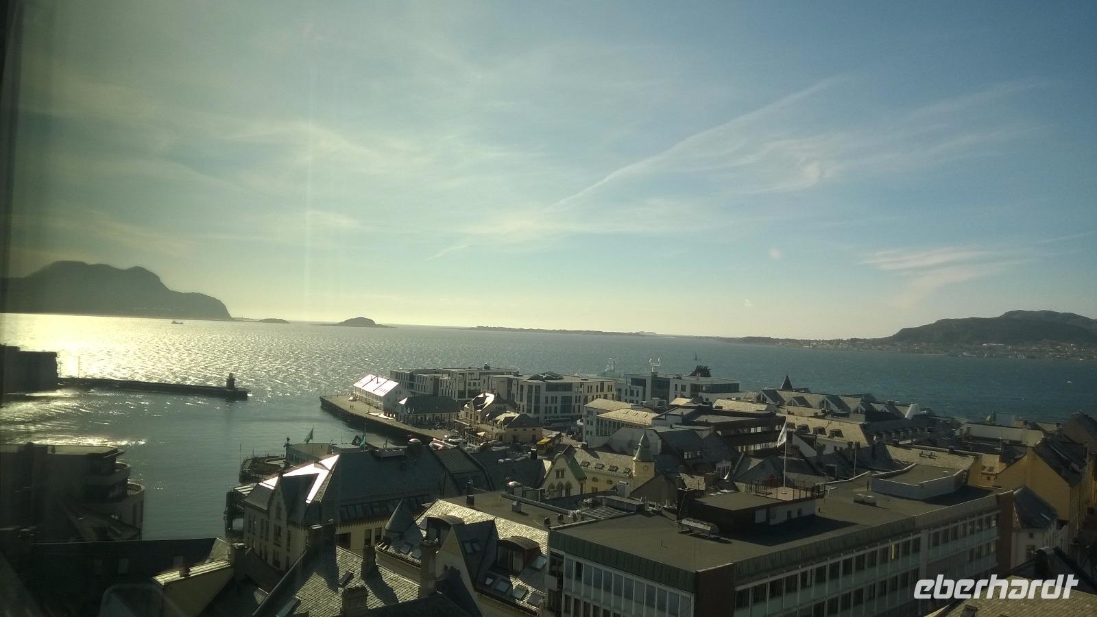 Am Abend kommen wir dann mit vielen Eindrücken in Aalesund, der Stadt des Jugendstils, an. Die Beine kann man sich hier in der Stadt vertreten und dabei all die vielen Jugendstilornamente an den Häusern bestaunen oder aber man kraxelt hoch auf den Berg hinterm Hotel und hat eine Aussicht, die wieder mal ein „Zwick mich mal, damit ich auch weiß, dass das hier Wirklichkeit ist" einfordert.