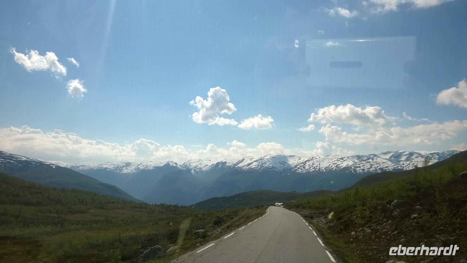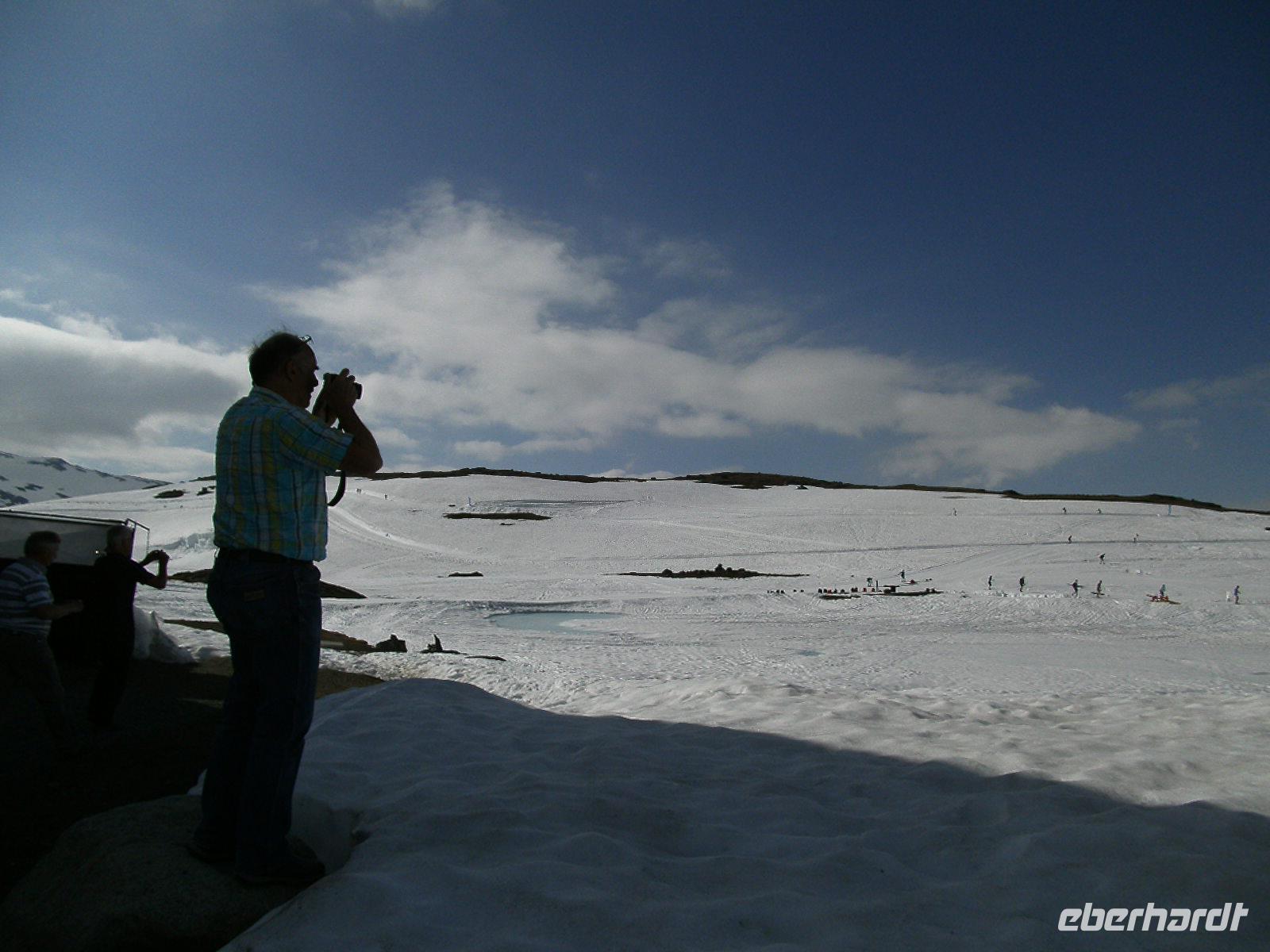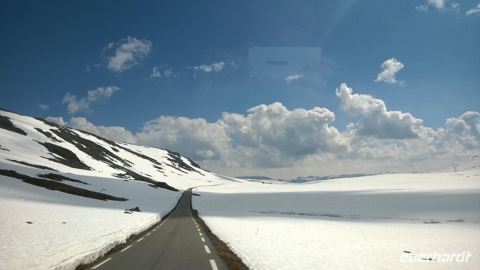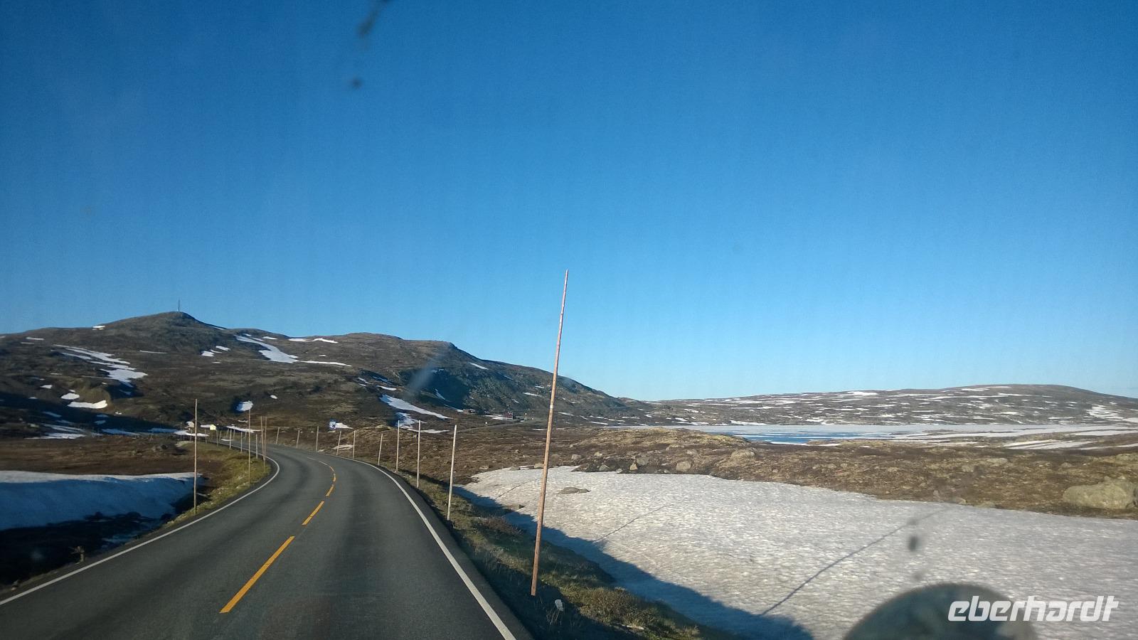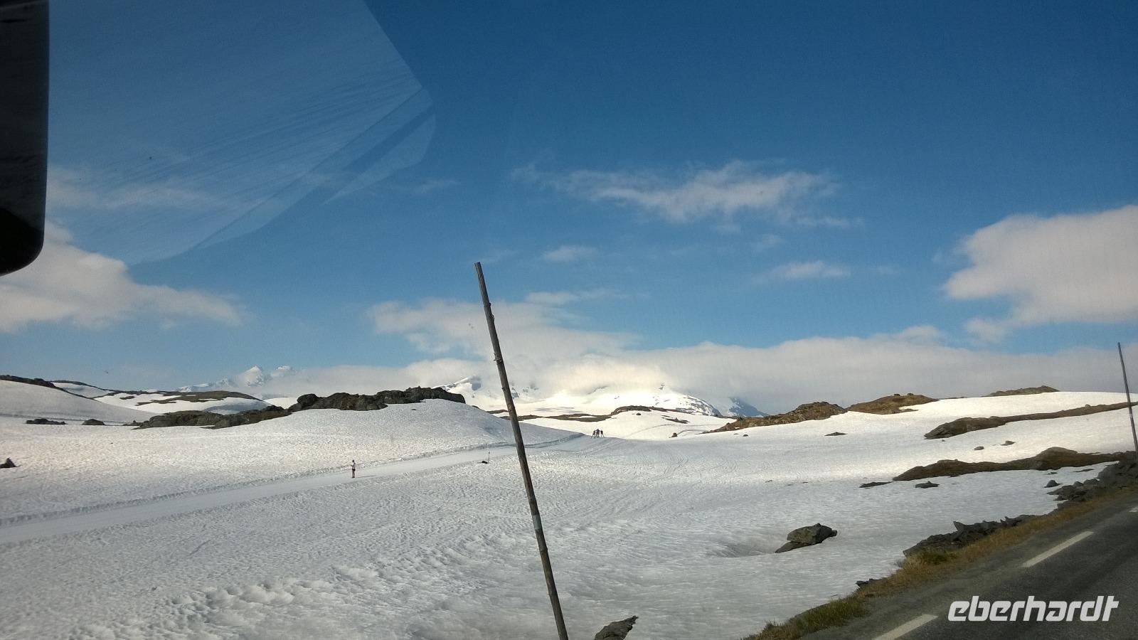 Heute führt uns unser Weg über das Sognefjell, also durchs Gebirge. Falls irgendjemand von soviel gutem Sommerwetter die Nase voll hätte, könnte er sich heute also etwas Abkühlung im Schnee verschaffen. Wir fahren vorbei an den Sommerskigebieten und sehen die Sportler beim Langlauf.