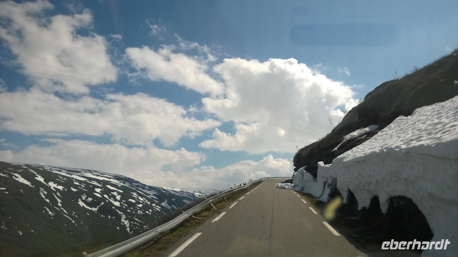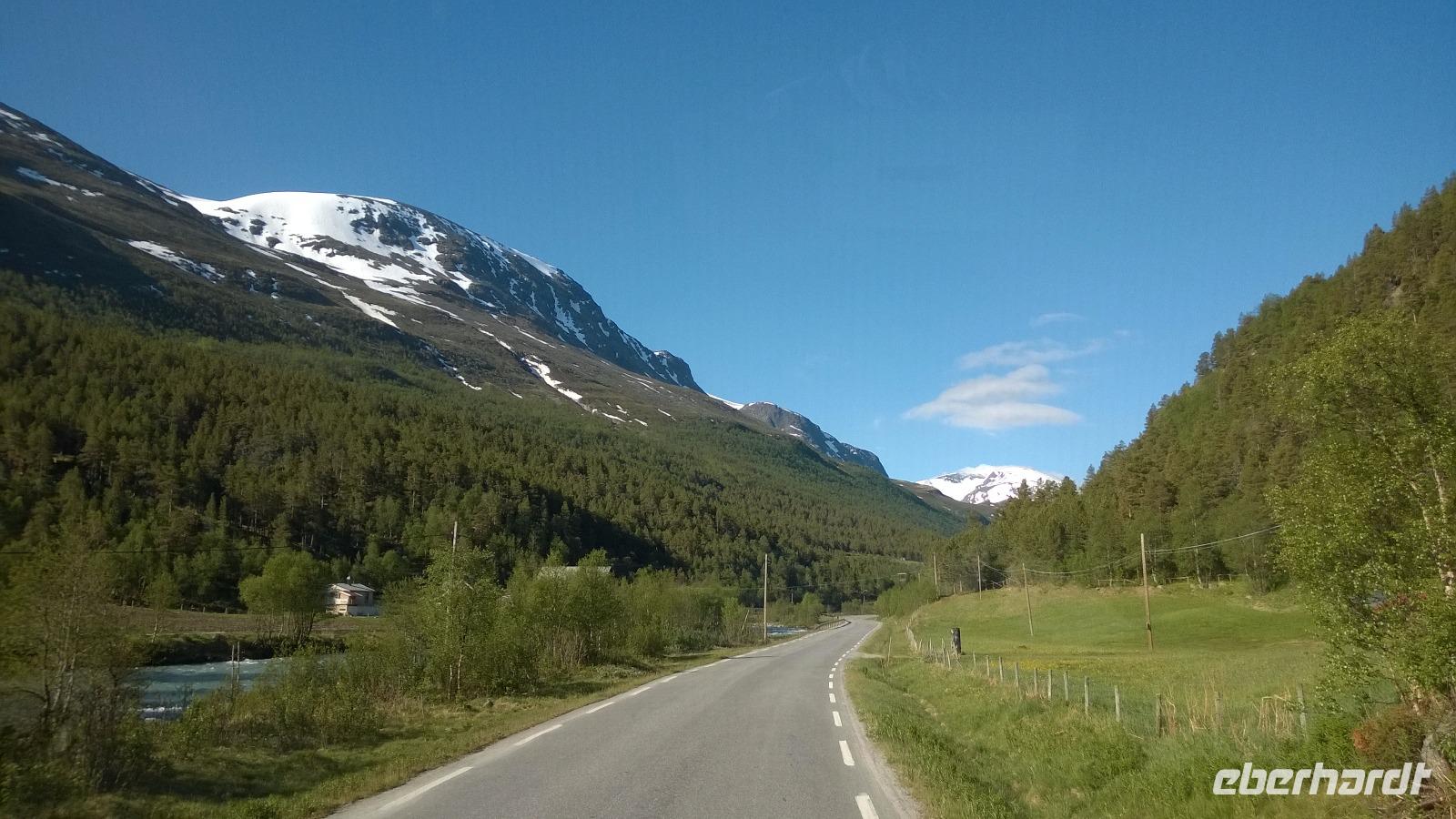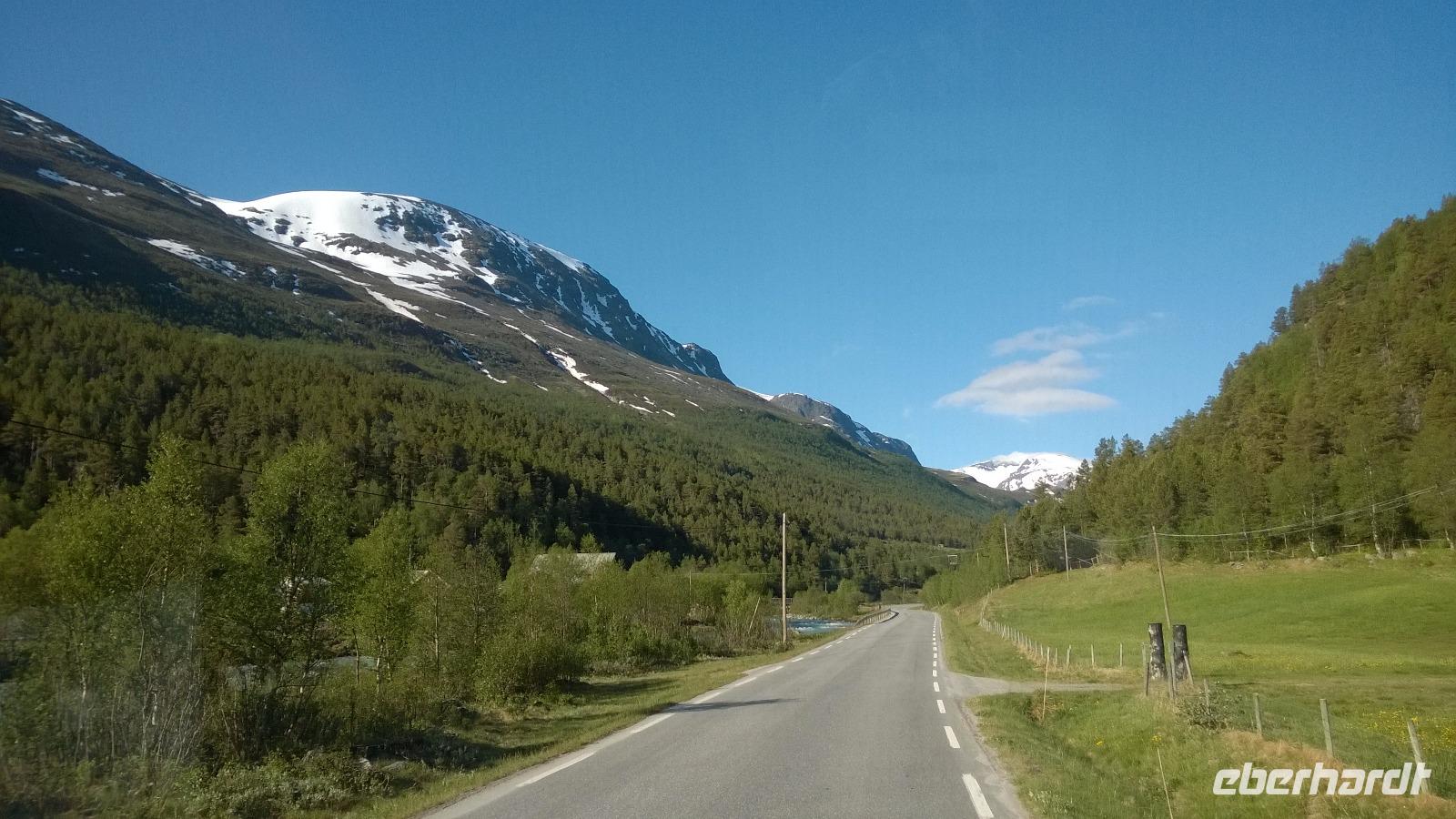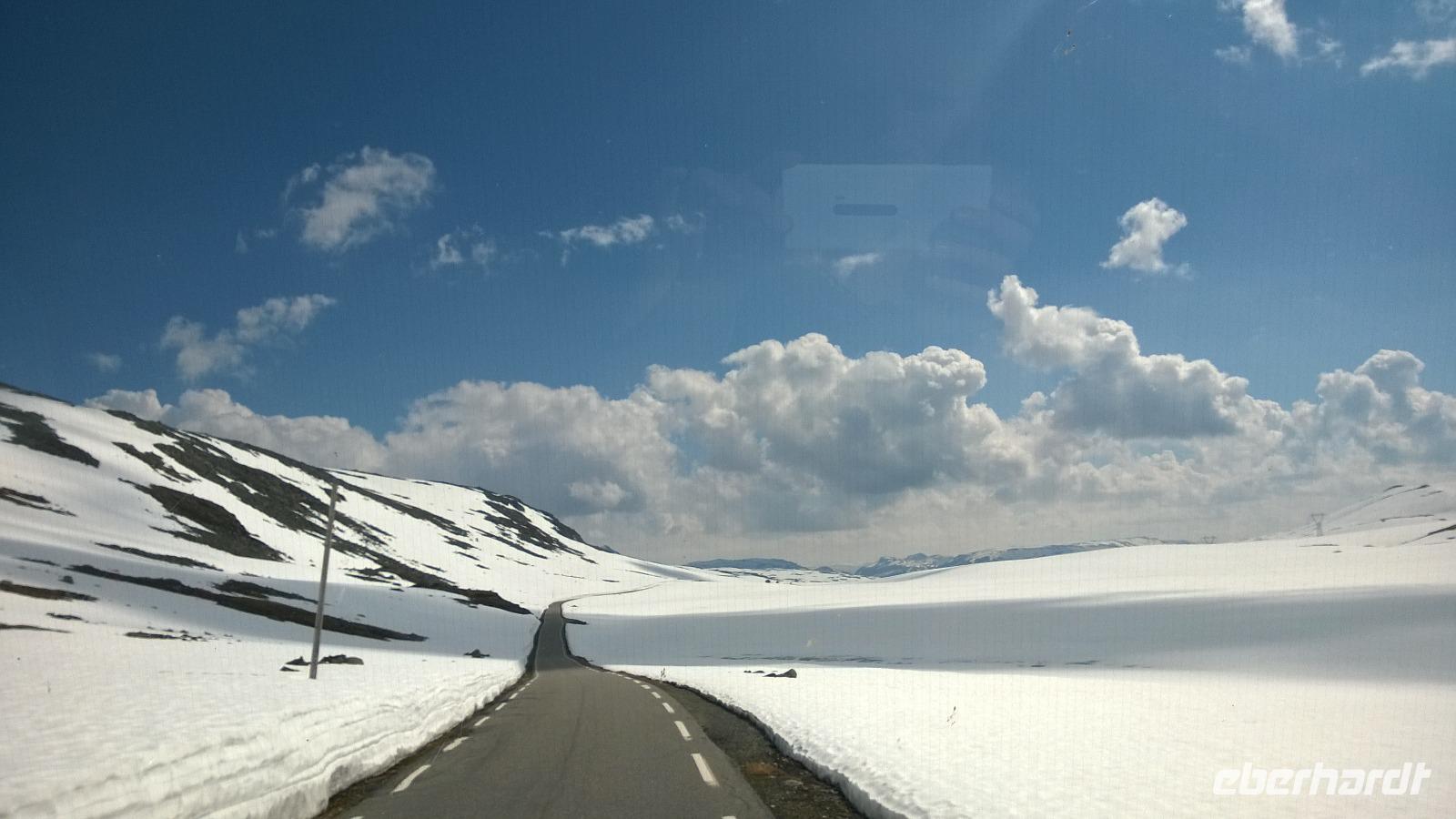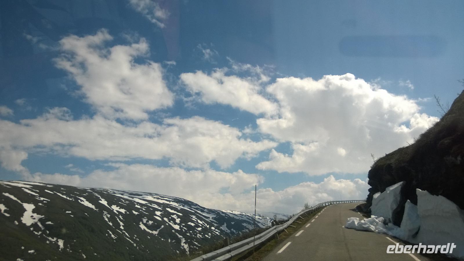 Heute führt uns unser Weg über das Sognefjell, also durchs Gebirge. Falls irgendjemand von soviel gutem Sommerwetter die Nase voll hätte, könnte er sich heute also etwas Abkühlung im Schnee verschaffen. Wir fahren vorbei an den Sommerskigebieten und sehen die Sportler beim Langlauf.