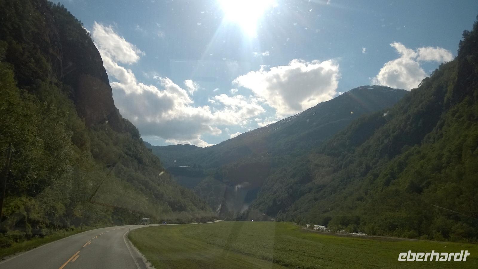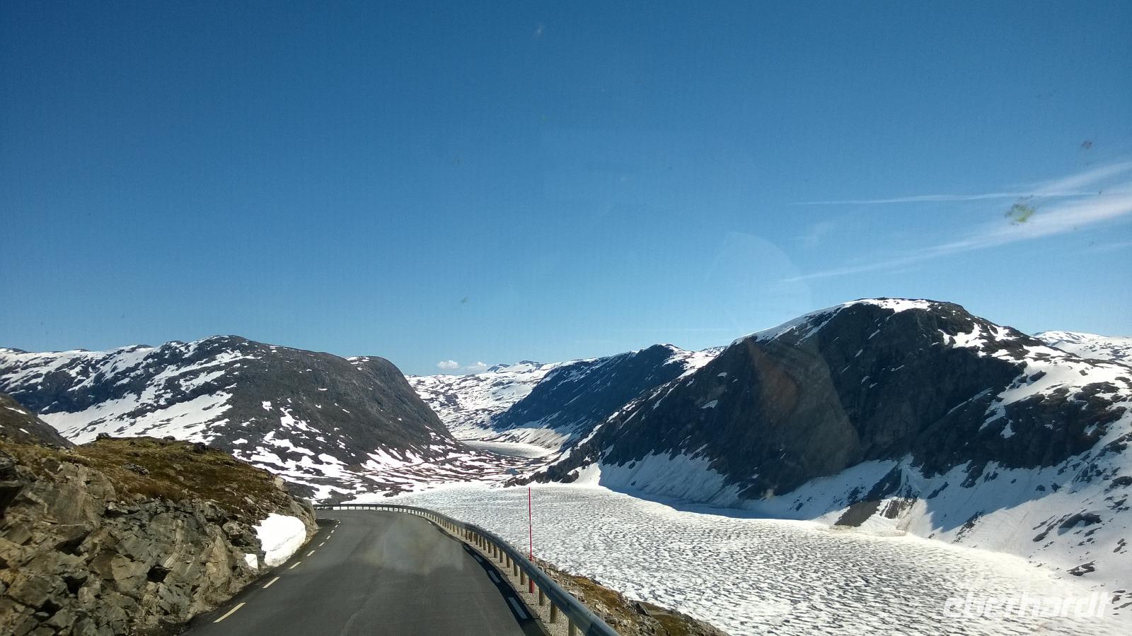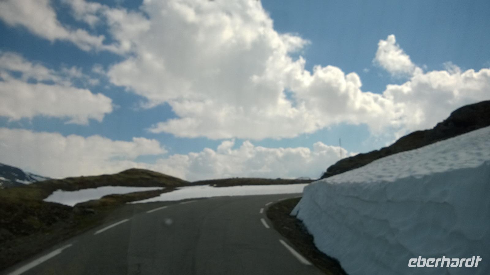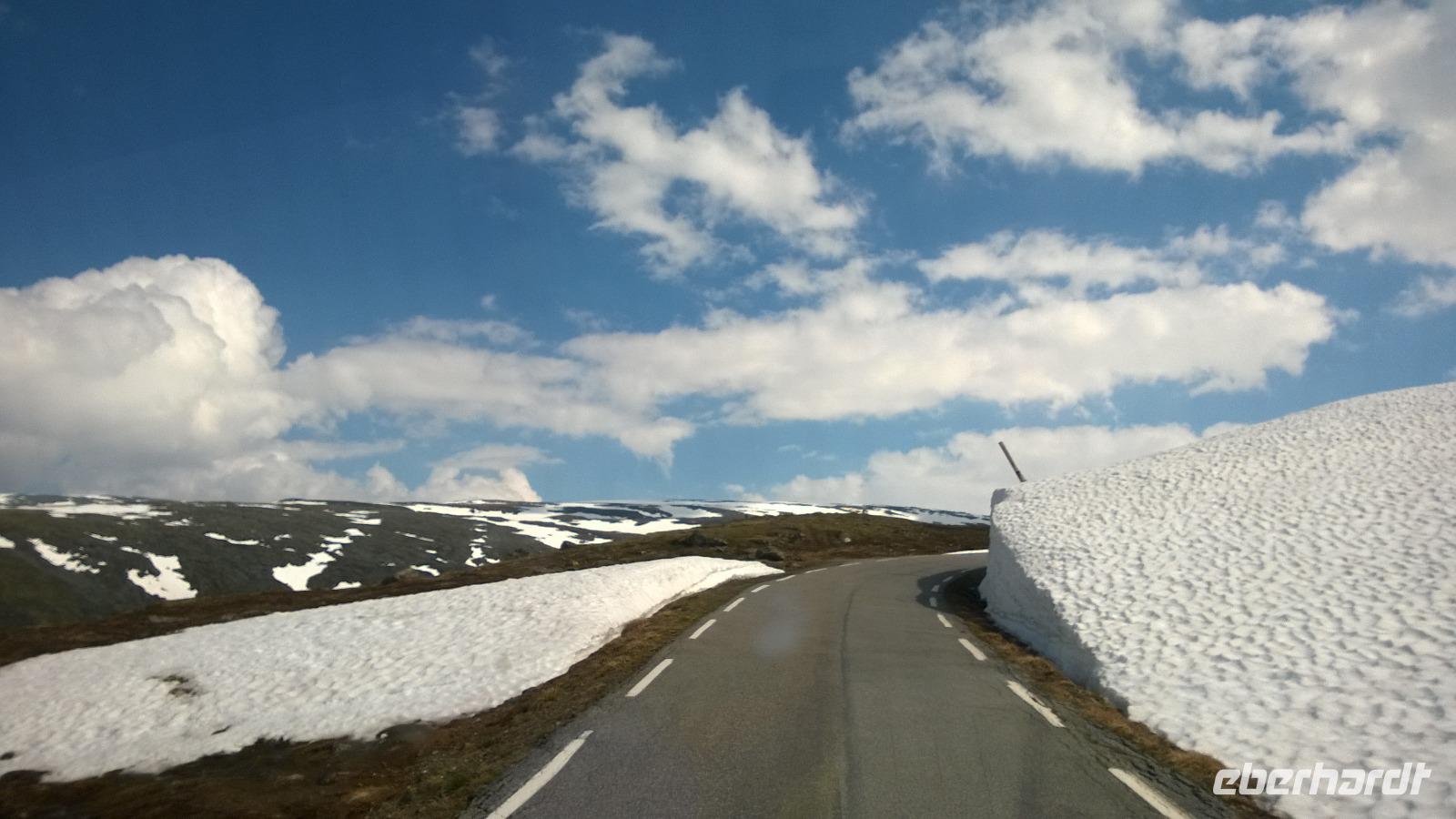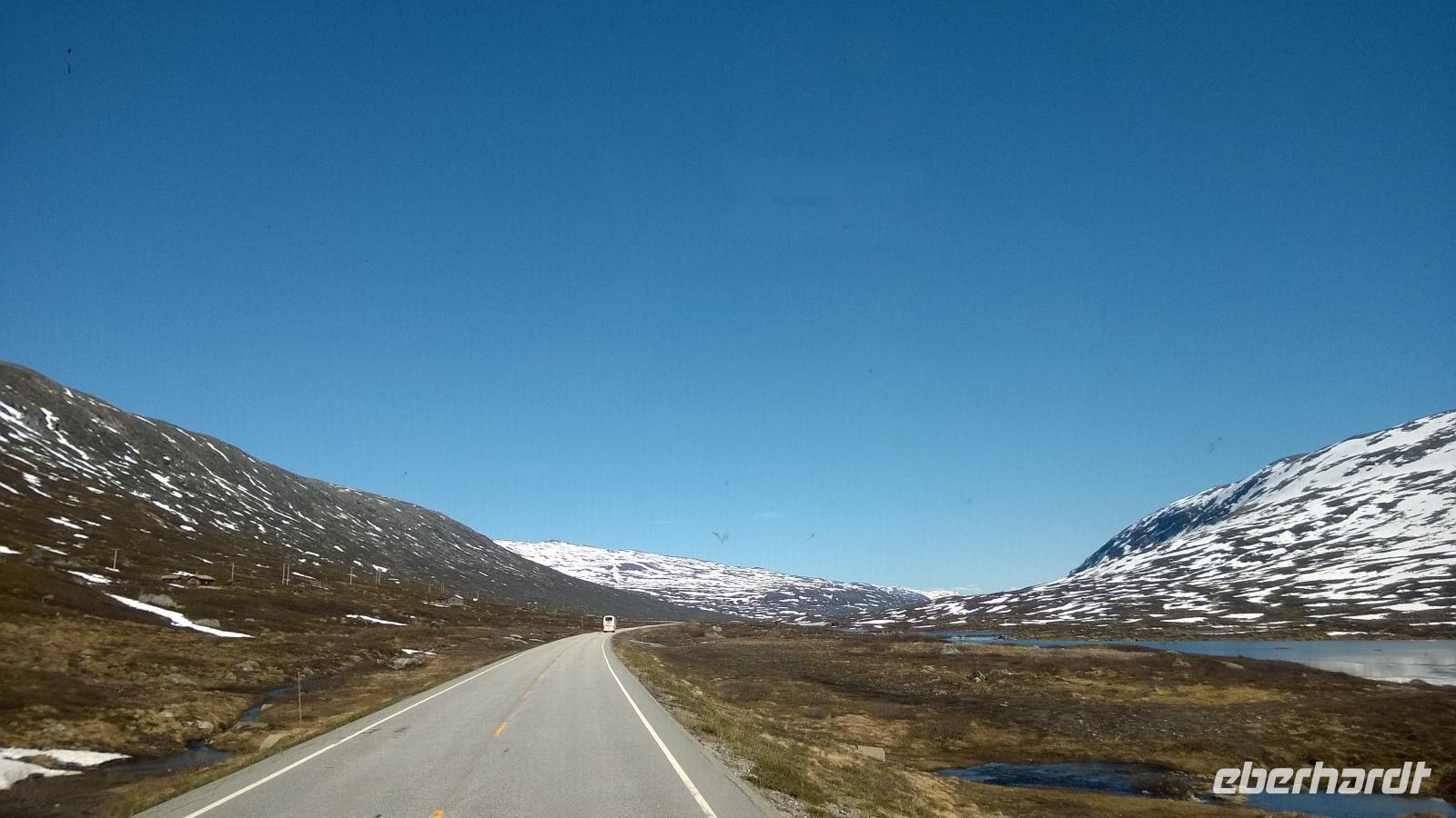 Heute führt uns unser Weg über das Sognefjell, also durchs Gebirge. Falls irgendjemand von soviel gutem Sommerwetter die Nase voll hätte, könnte er sich heute also etwas Abkühlung im Schnee verschaffen. Wir fahren vorbei an den Sommerskigebieten und sehen die Sportler beim Langlauf.