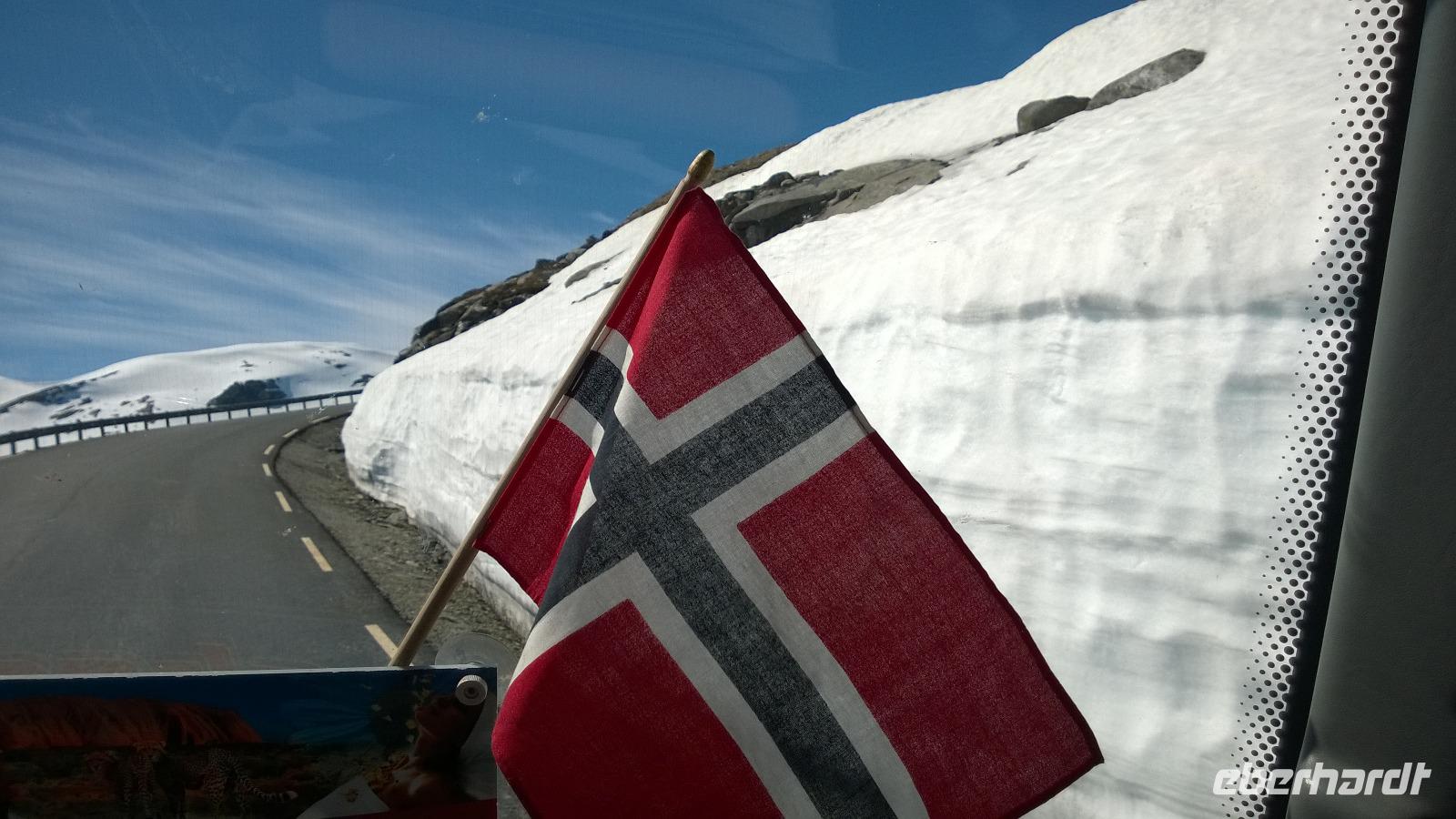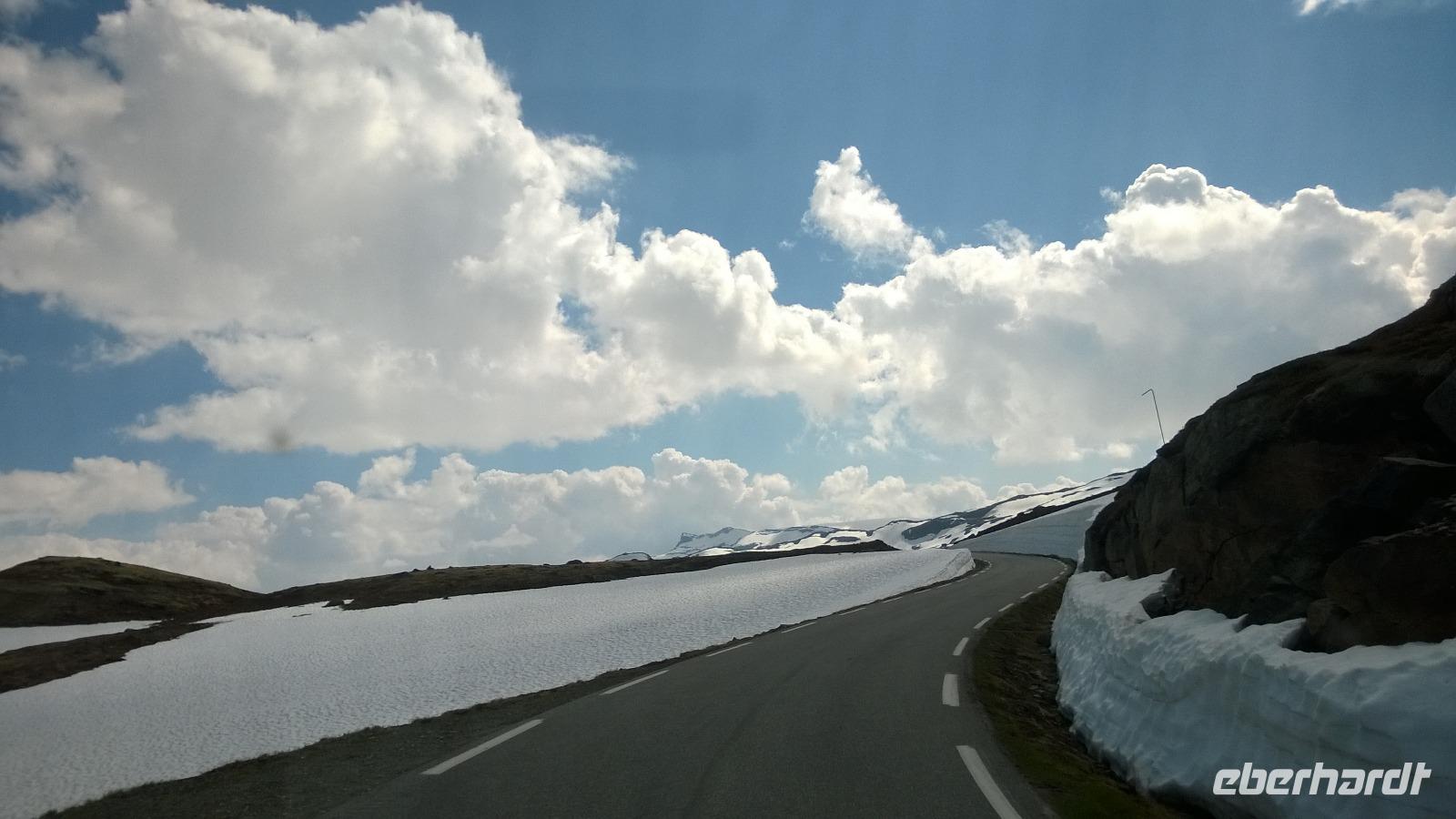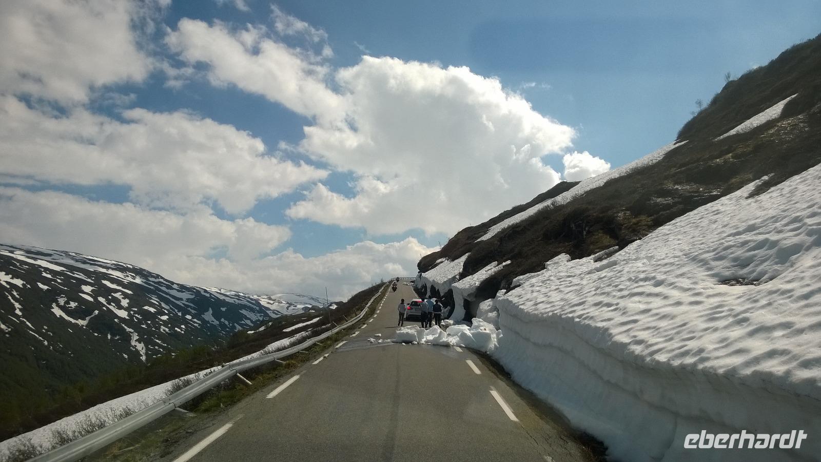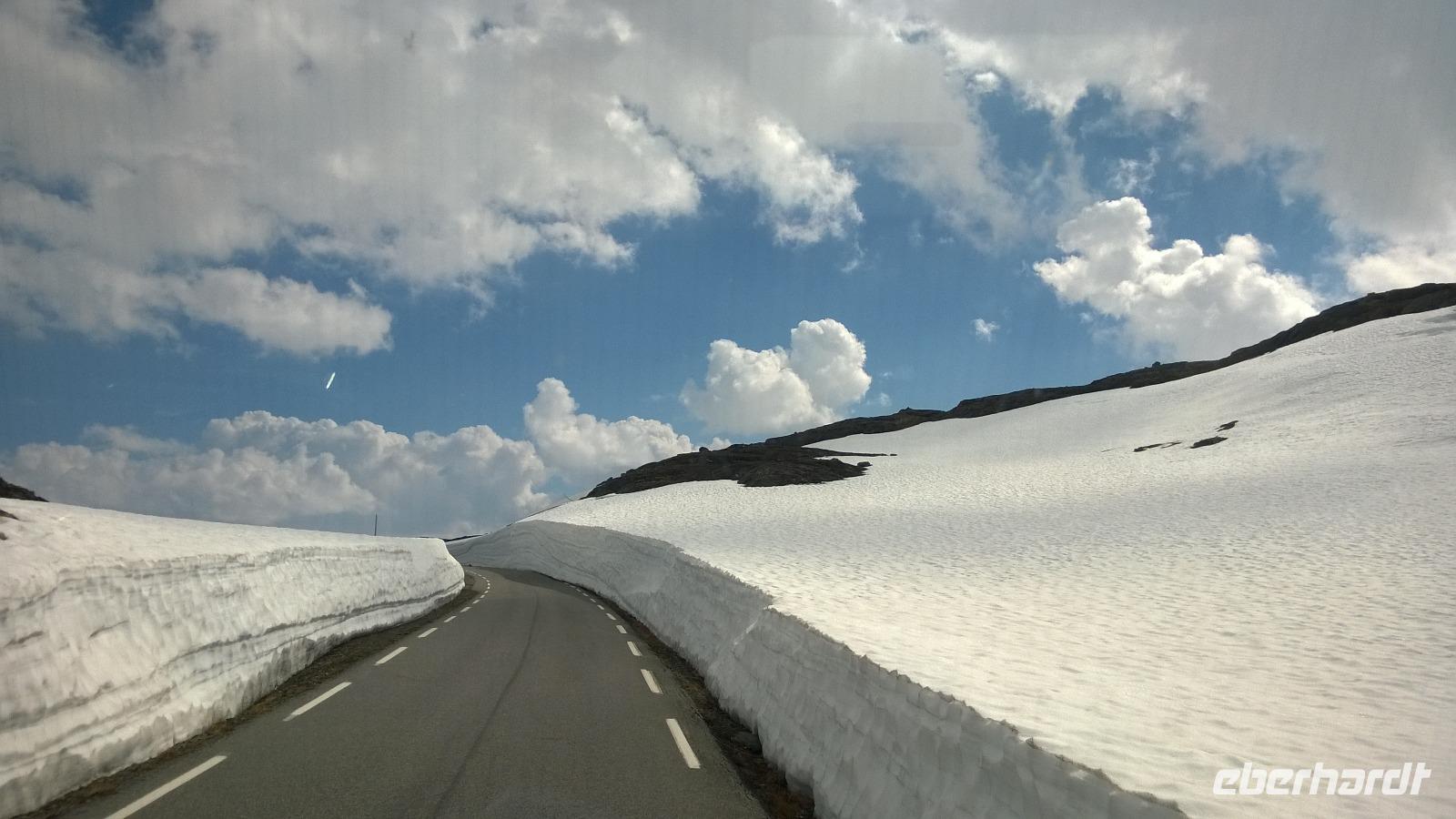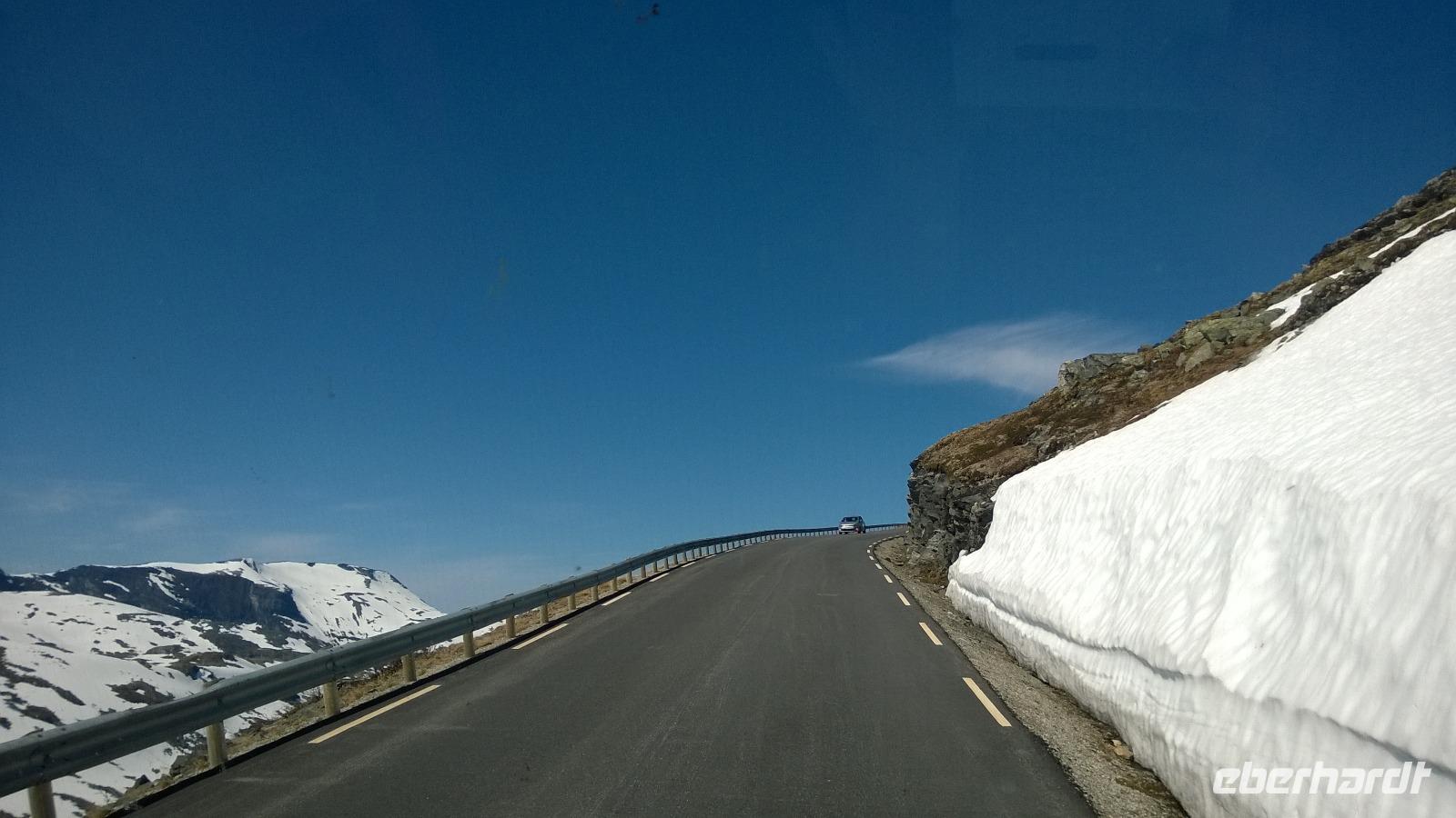 Heute führt uns unser Weg über das Sognefjell, also durchs Gebirge. Falls irgendjemand von soviel gutem Sommerwetter die Nase voll hätte, könnte er sich heute also etwas Abkühlung im Schnee verschaffen. Wir fahren vorbei an den Sommerskigebieten und sehen die Sportler beim Langlauf.