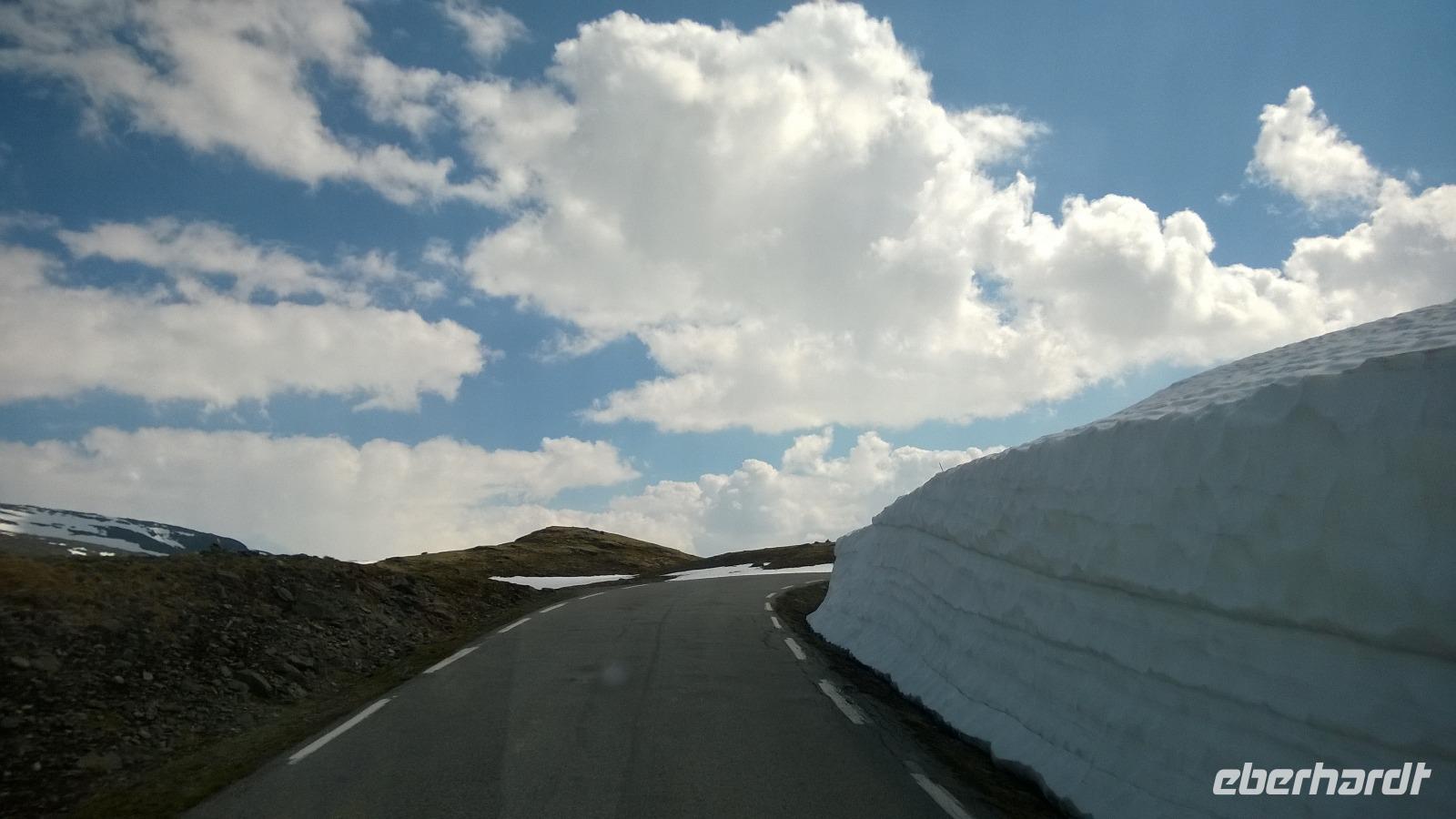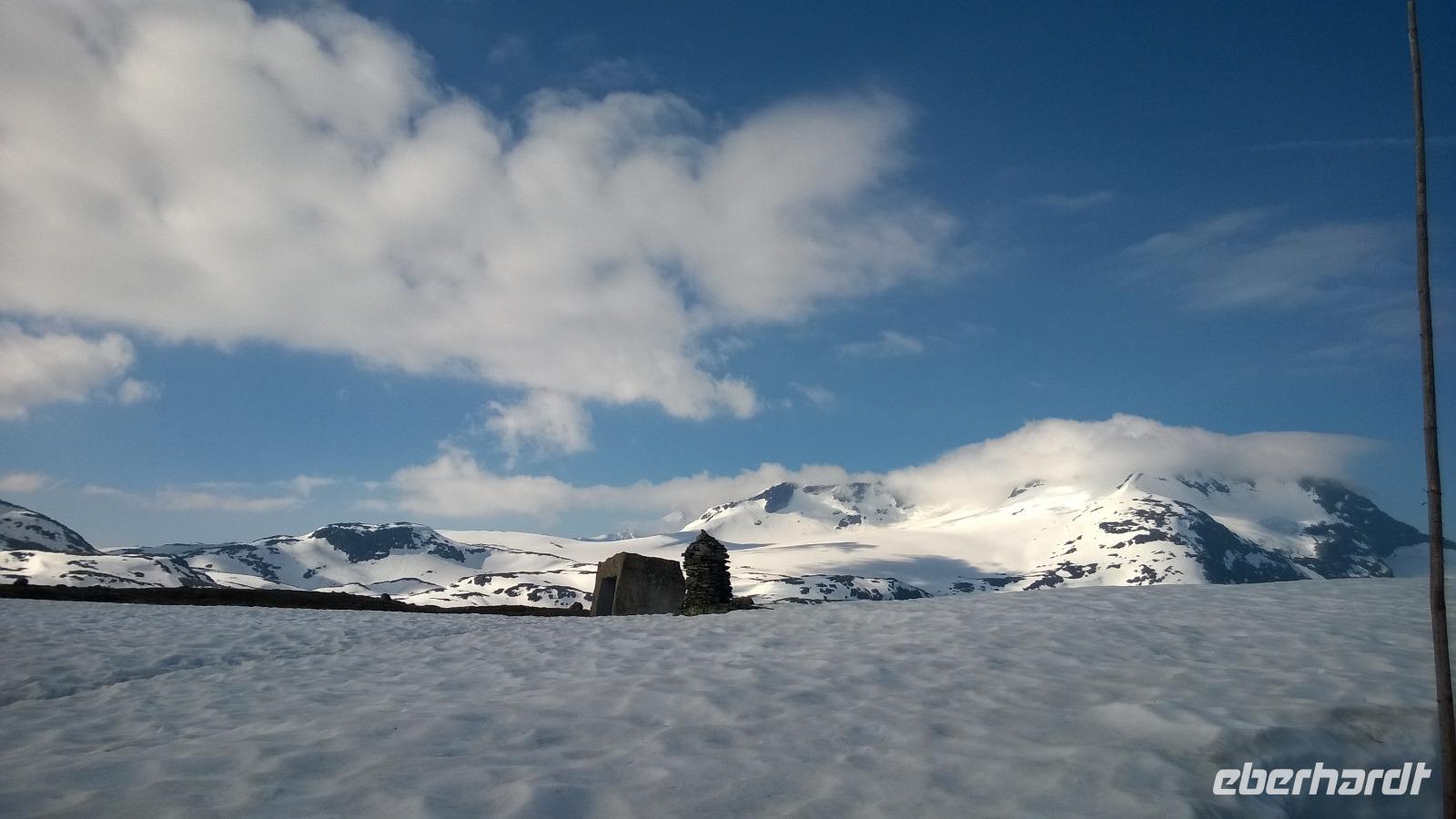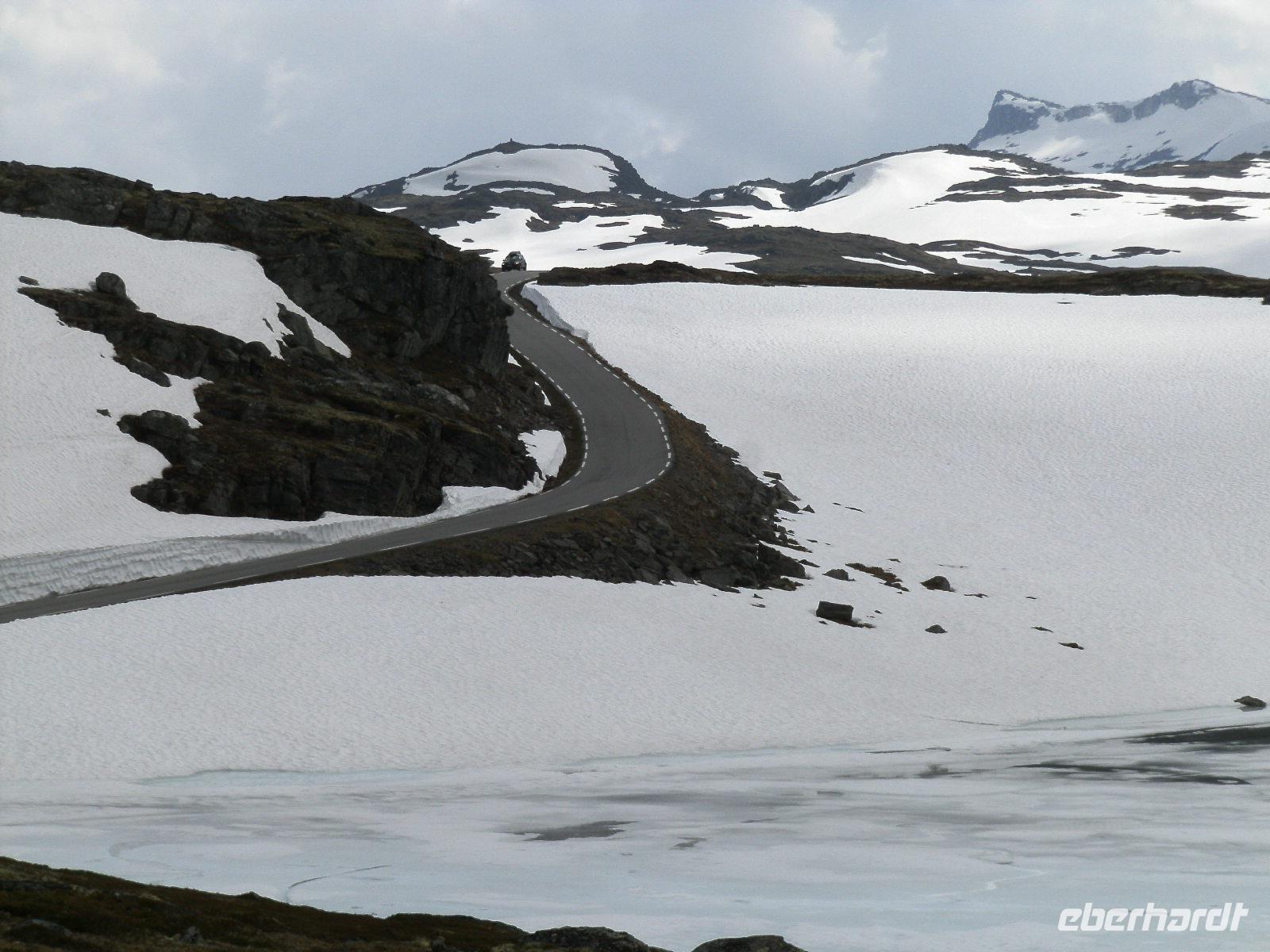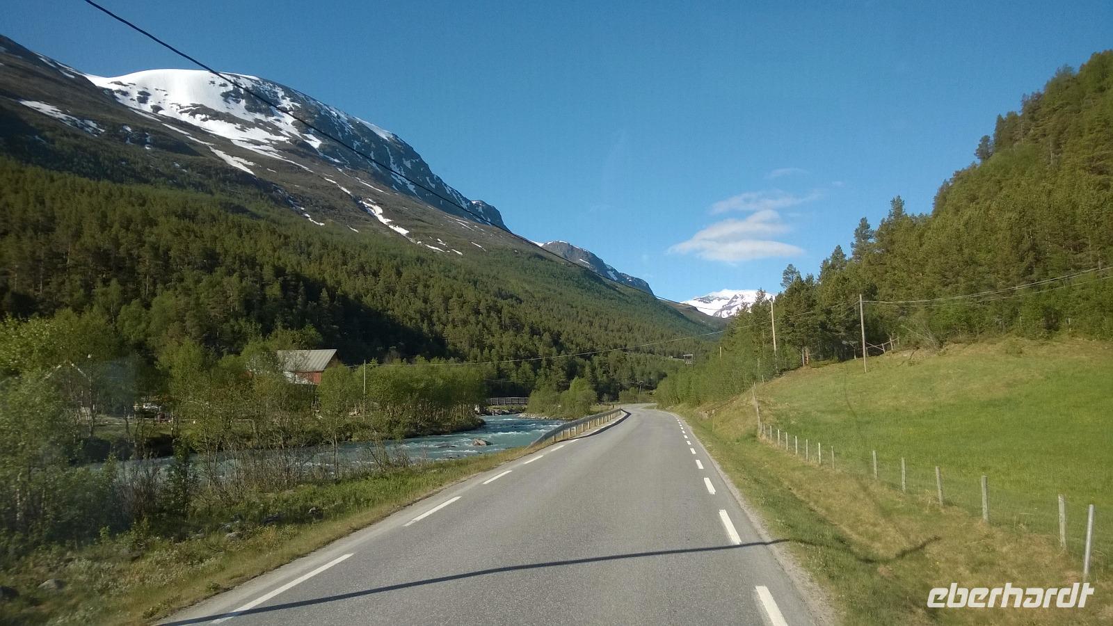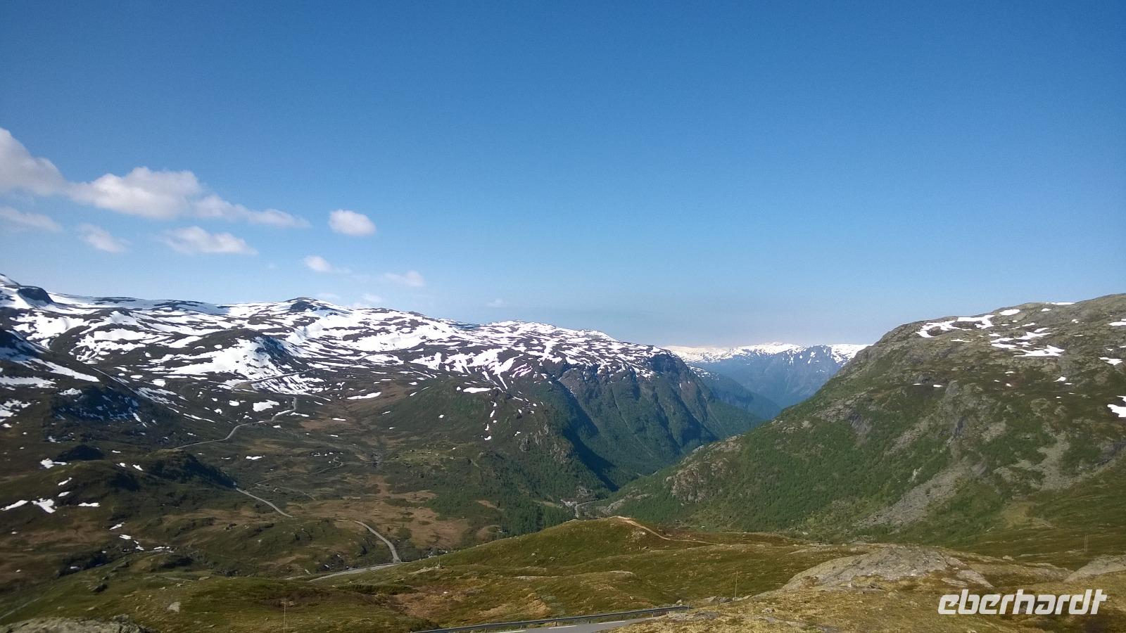Heute führt uns unser Weg über das Sognefjell, also durchs Gebirge. Falls irgendjemand von soviel gutem Sommerwetter die Nase voll hätte, könnte er sich heute also etwas Abkühlung im Schnee verschaffen. Wir fahren vorbei an den Sommerskigebieten und sehen die Sportler beim Langlauf.