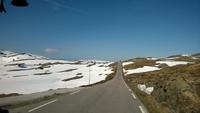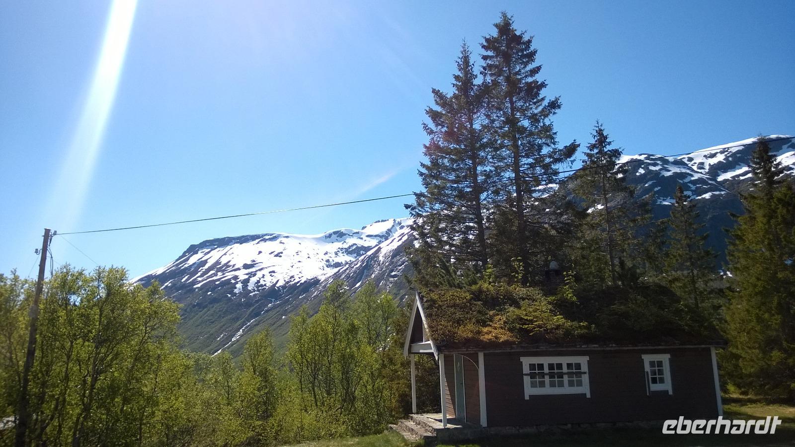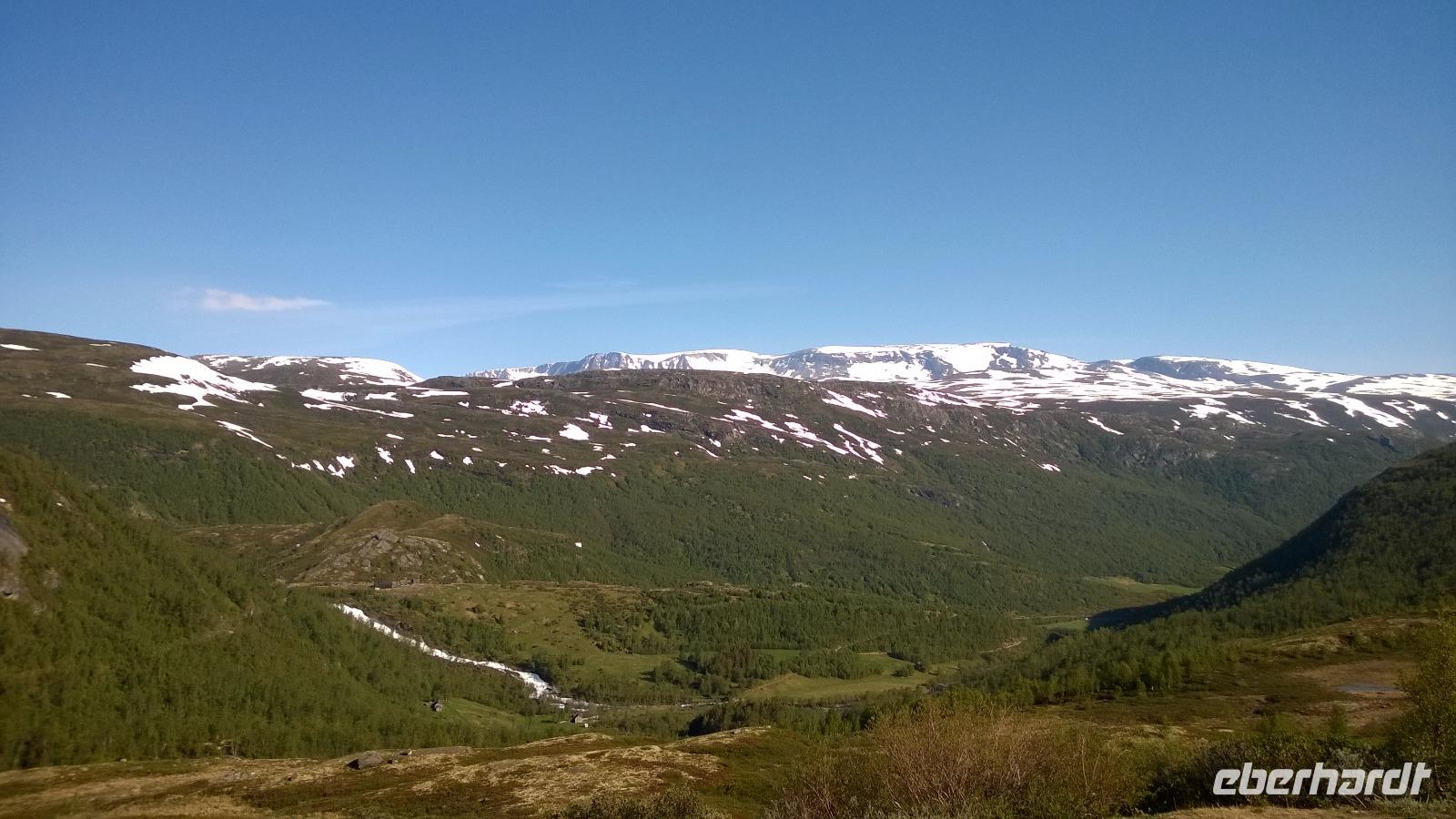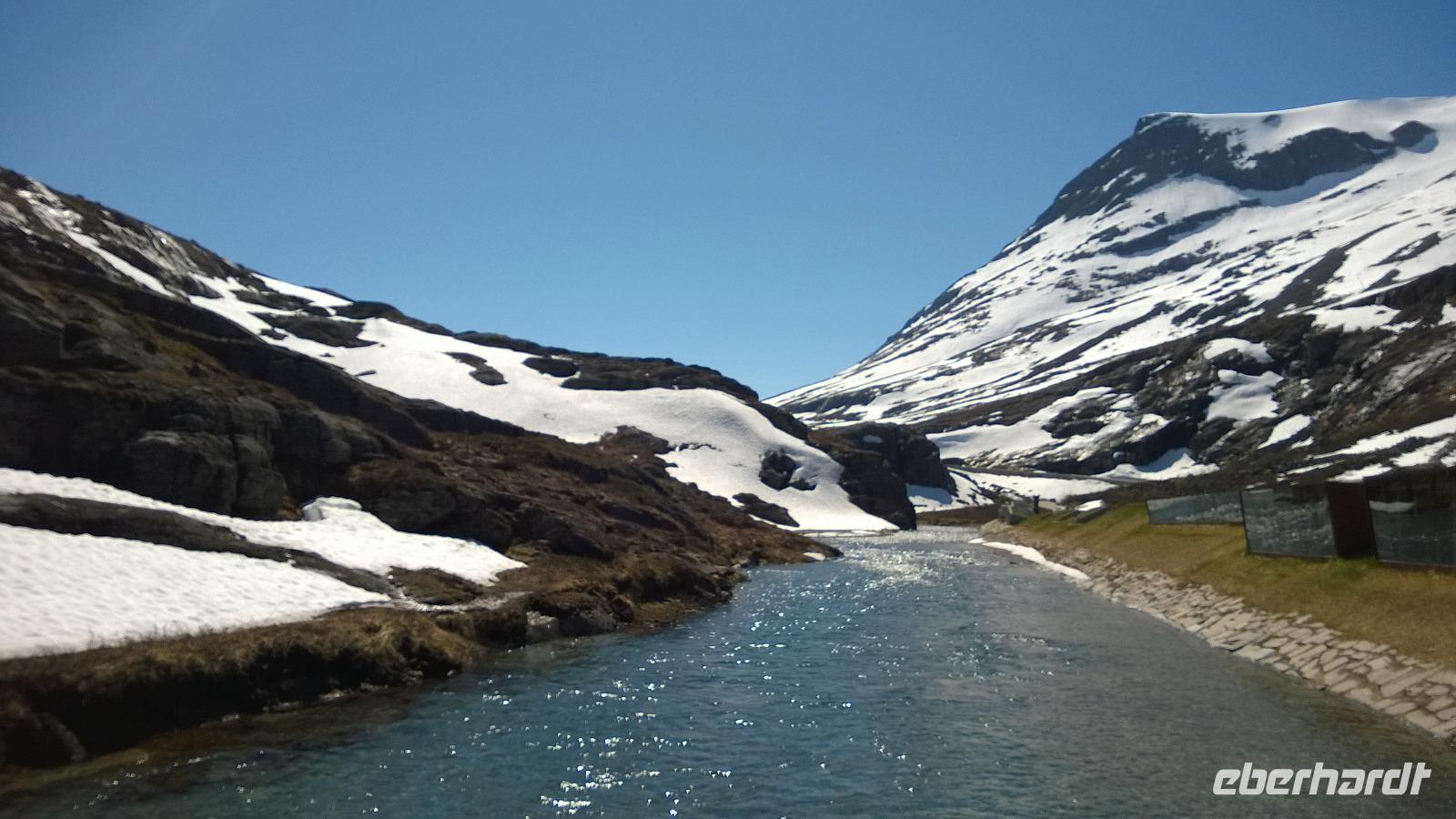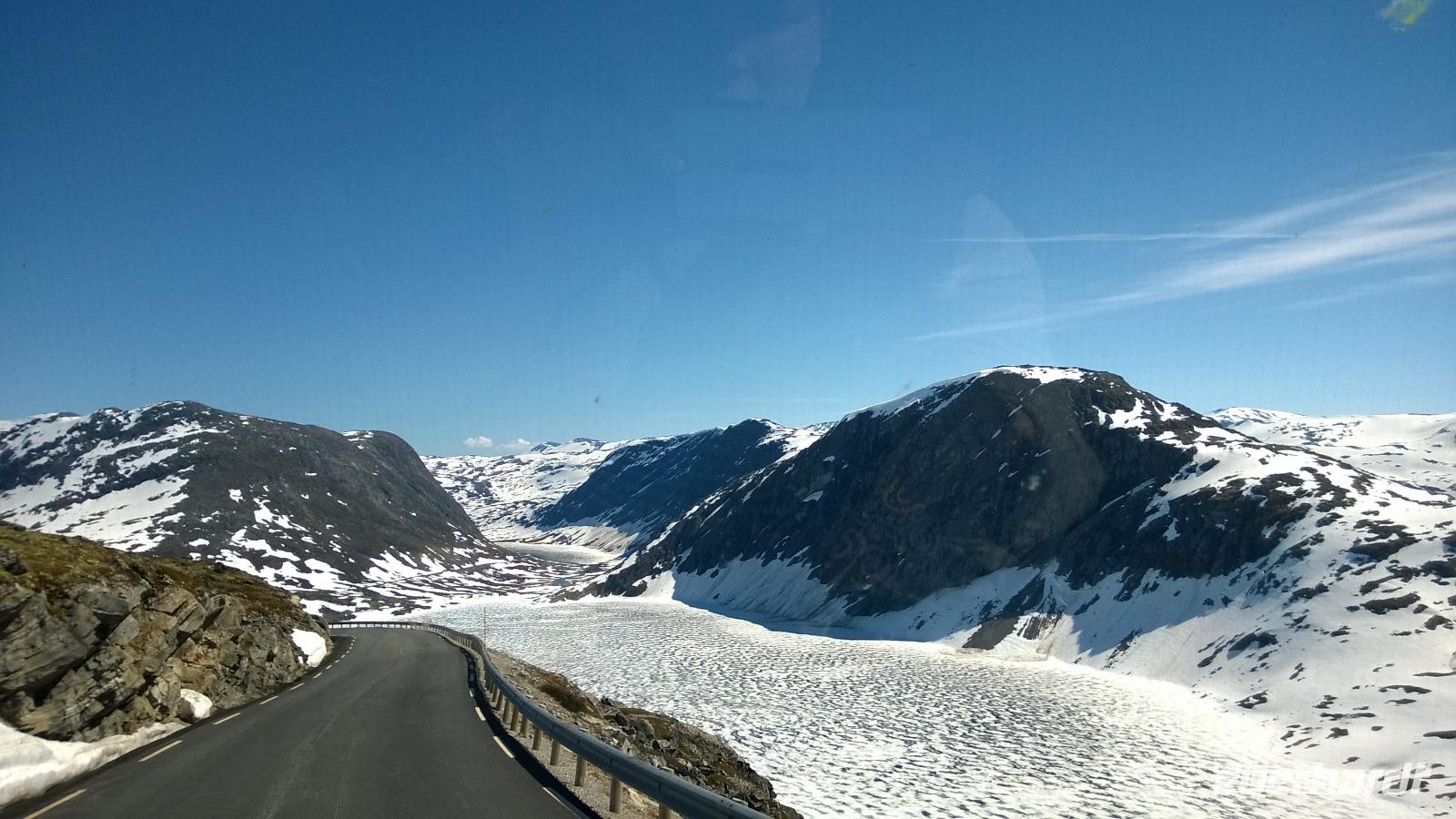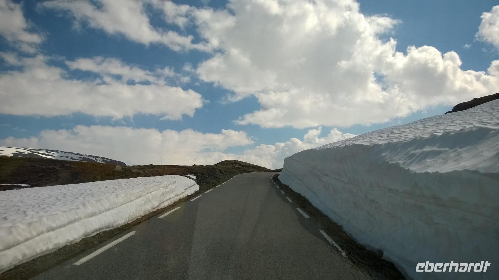Heute führt uns unser Weg über das Sognefjell, also durchs Gebirge. Falls irgendjemand von soviel gutem Sommerwetter die Nase voll hätte, könnte er sich heute also etwas Abkühlung im Schnee verschaffen. Wir fahren vorbei an den Sommerskigebieten und sehen die Sportler beim Langlauf.