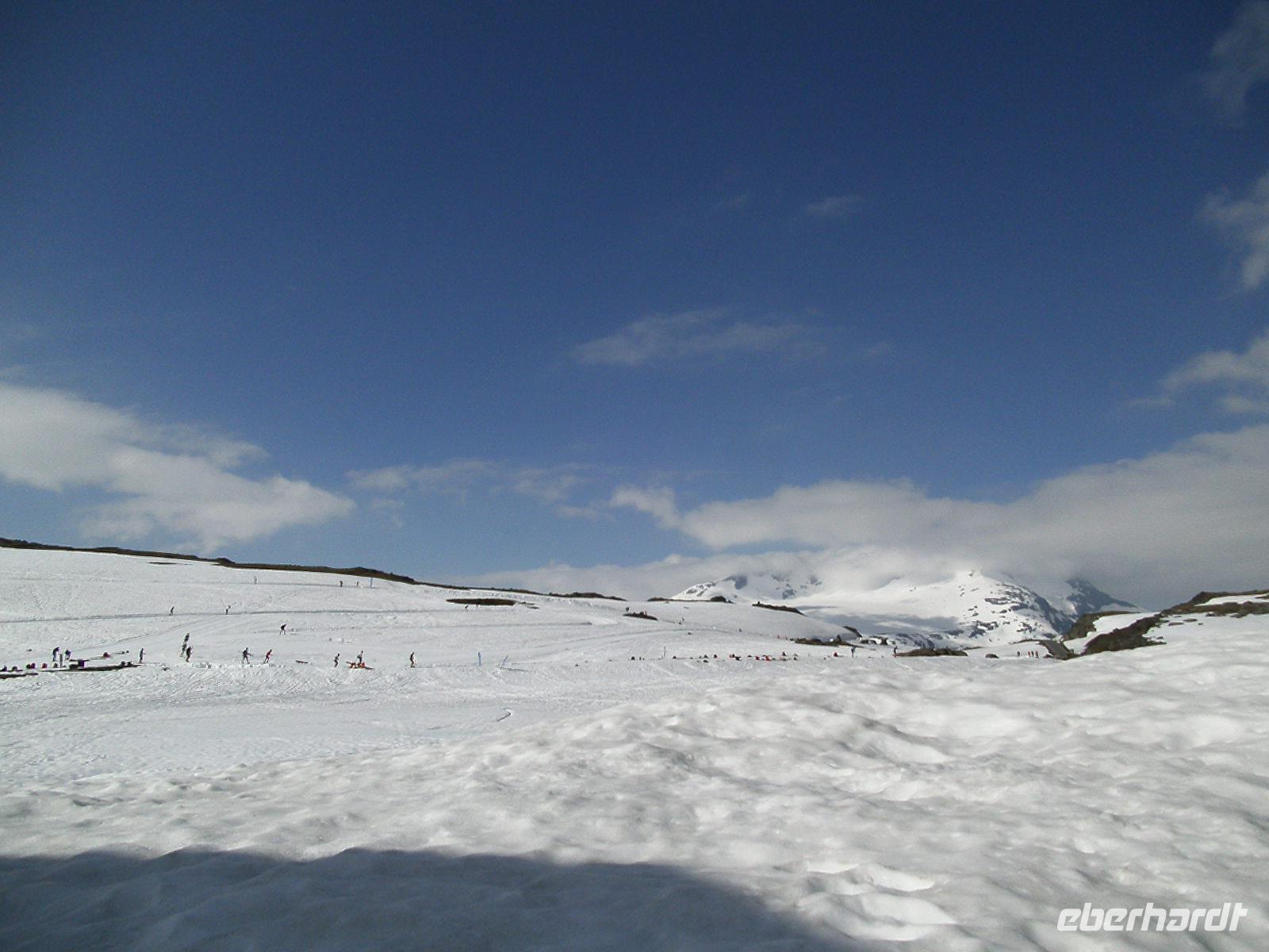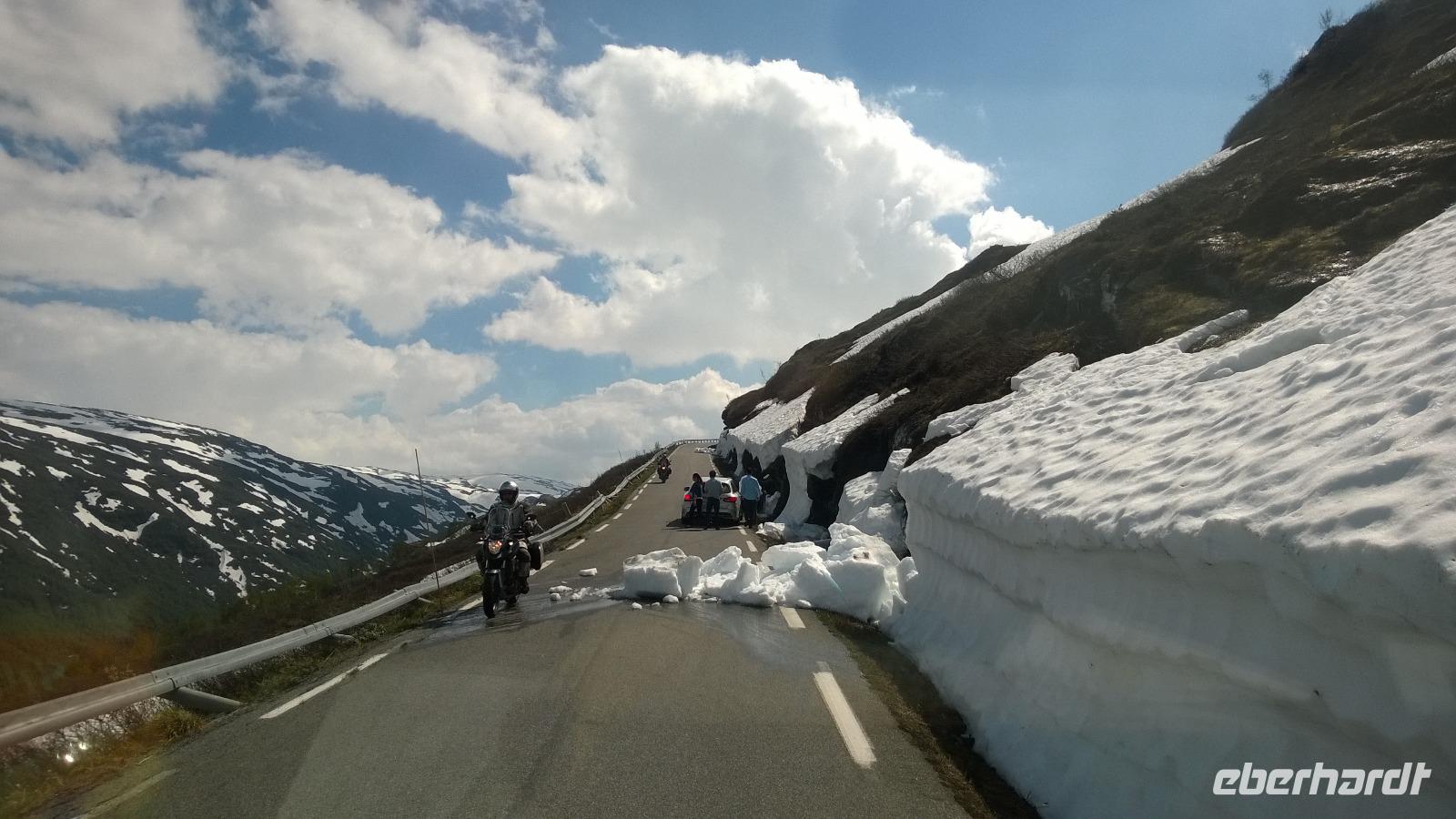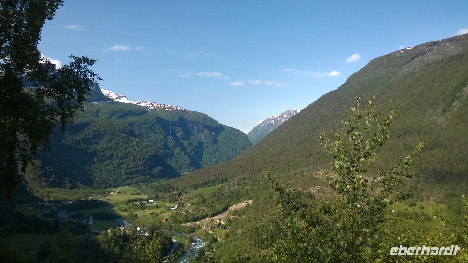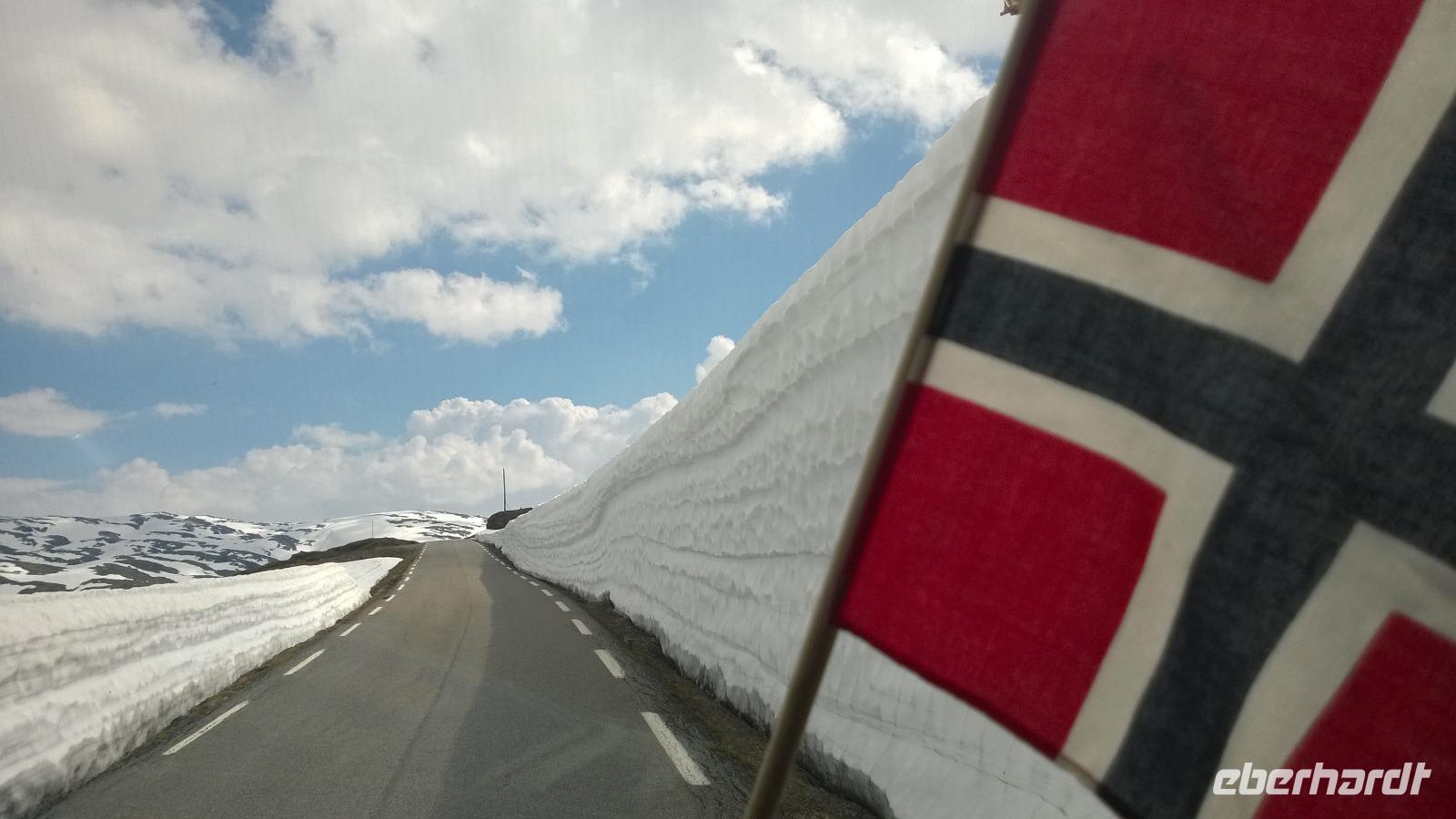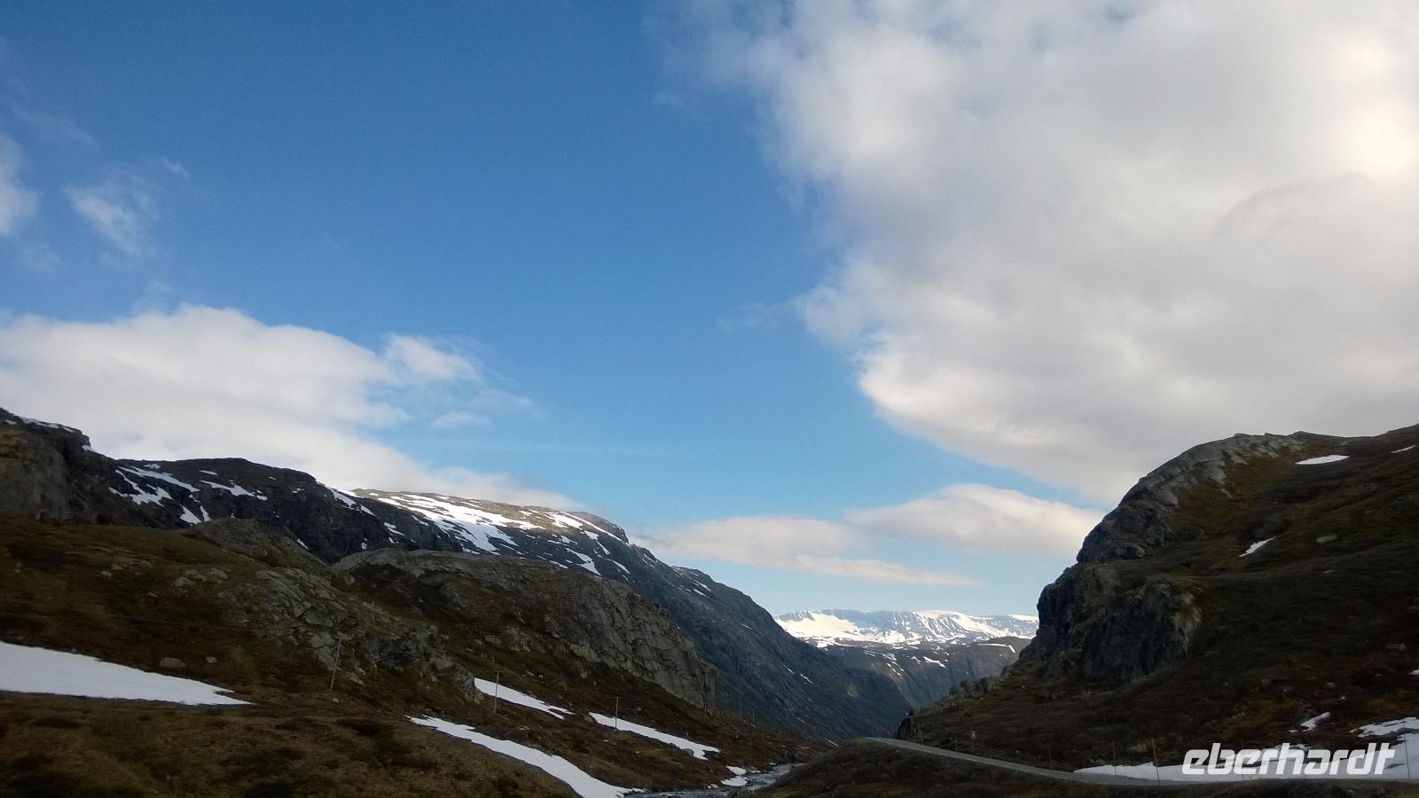 Heute führt uns unser Weg über das Sognefjell, also durchs Gebirge. Falls irgendjemand von soviel gutem Sommerwetter die Nase voll hätte, könnte er sich heute also etwas Abkühlung im Schnee verschaffen. Wir fahren vorbei an den Sommerskigebieten und sehen die Sportler beim Langlauf.