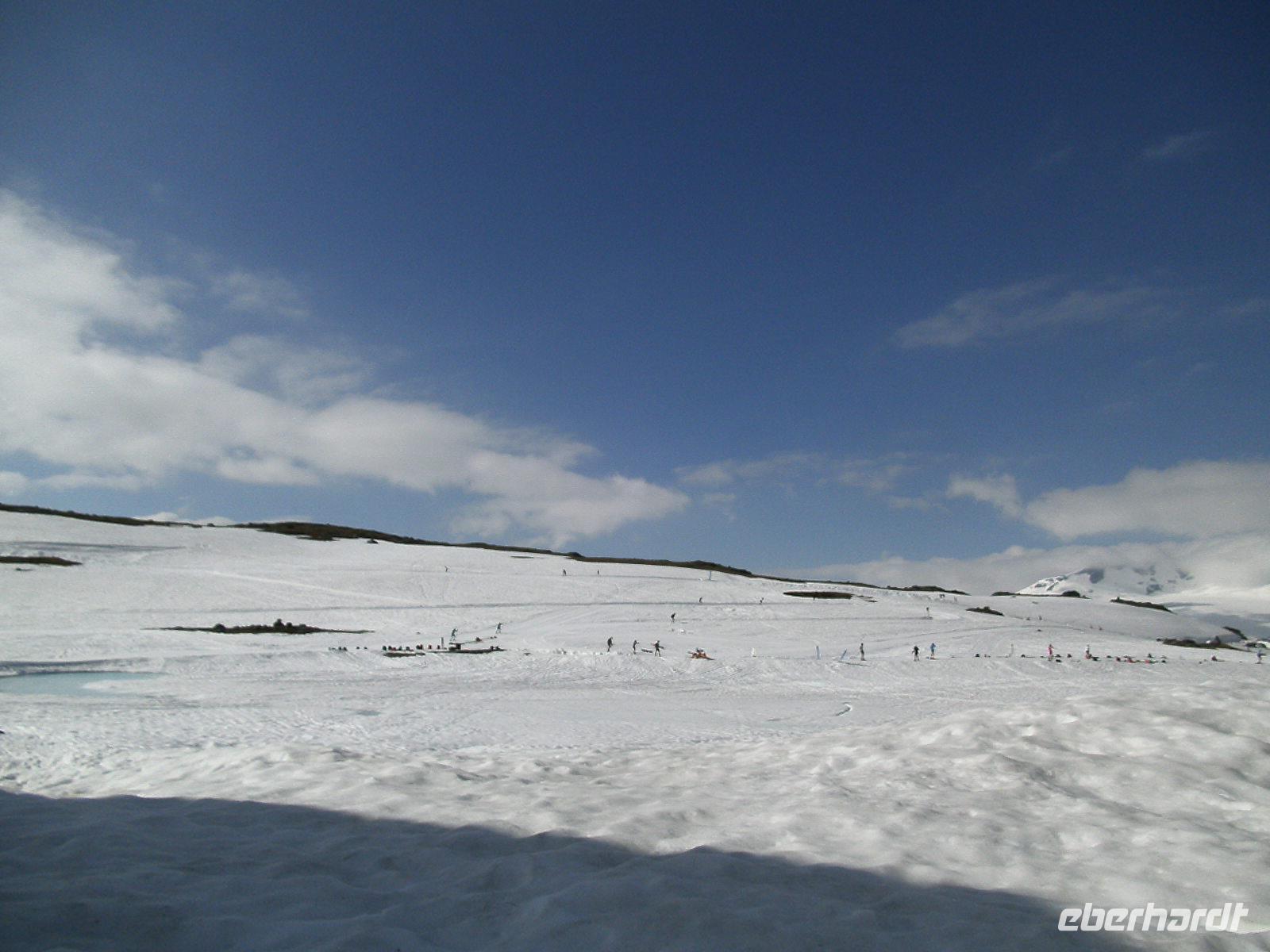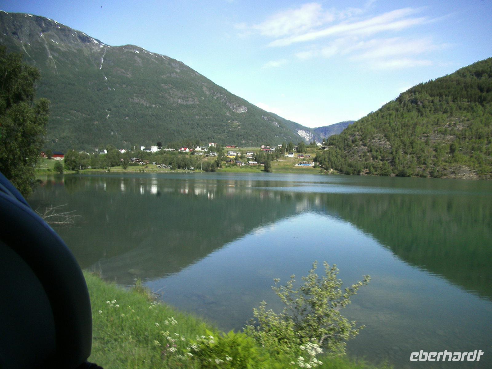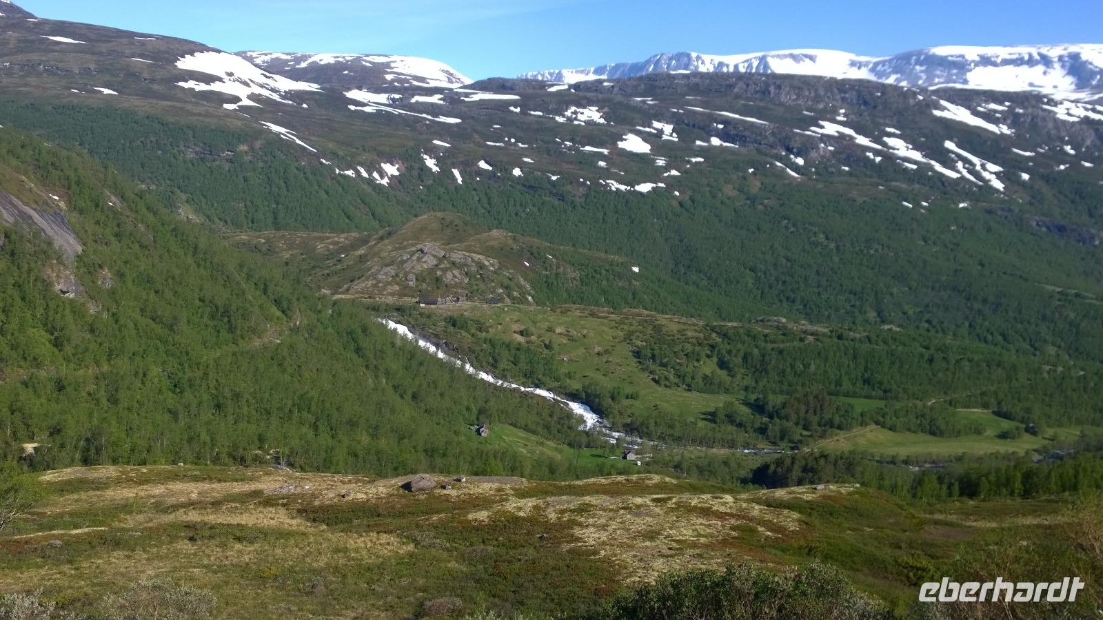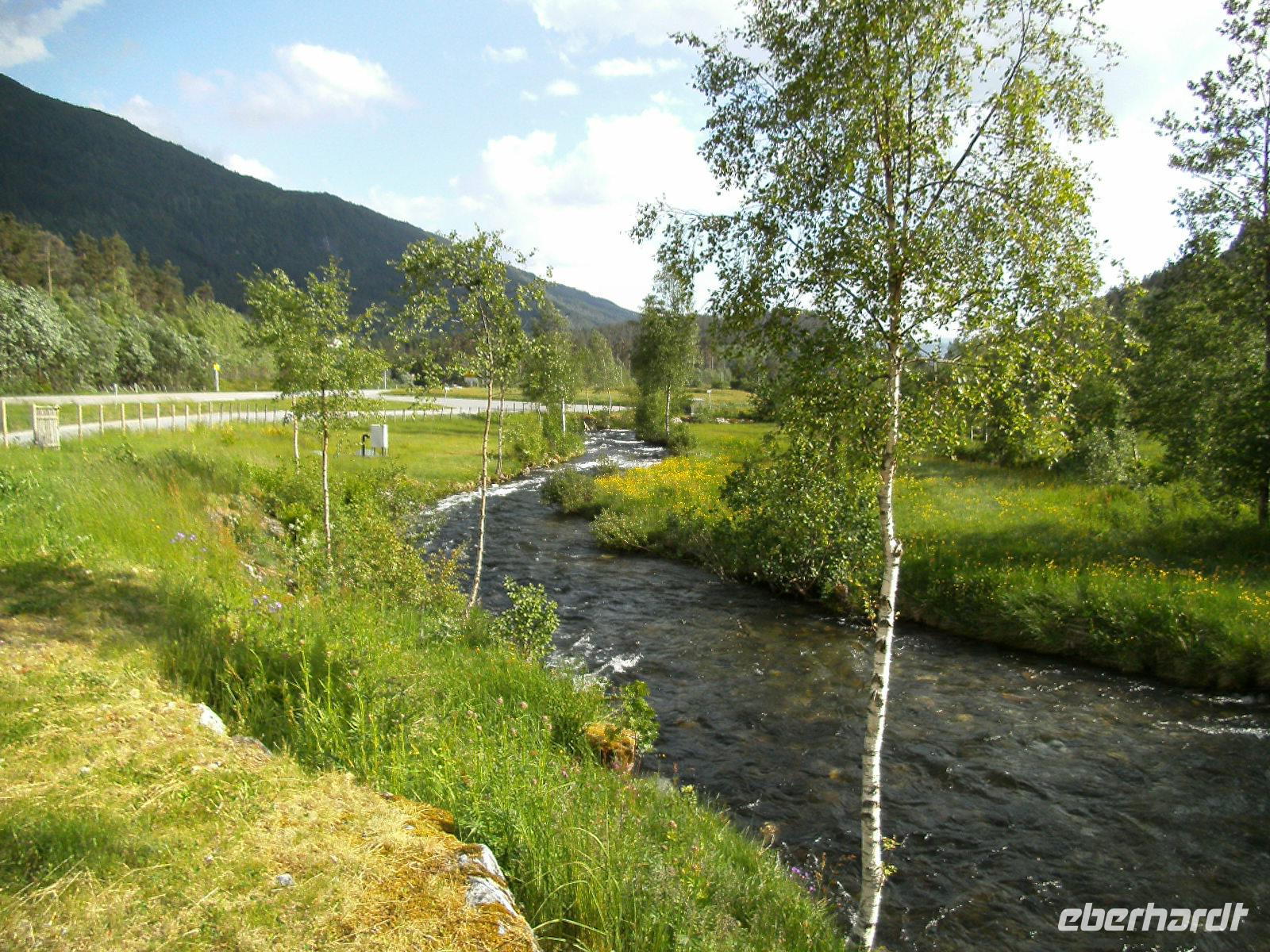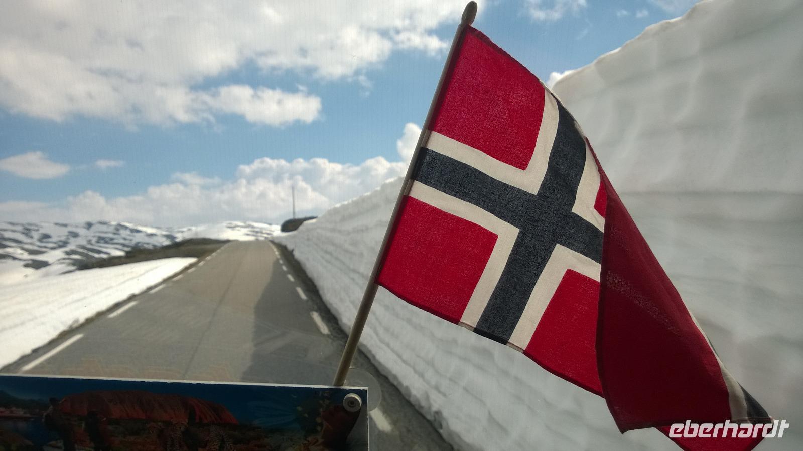 Heute führt uns unser Weg über das Sognefjell, also durchs Gebirge. Falls irgendjemand von soviel gutem Sommerwetter die Nase voll hätte, könnte er sich heute also etwas Abkühlung im Schnee verschaffen. Wir fahren vorbei an den Sommerskigebieten und sehen die Sportler beim Langlauf.