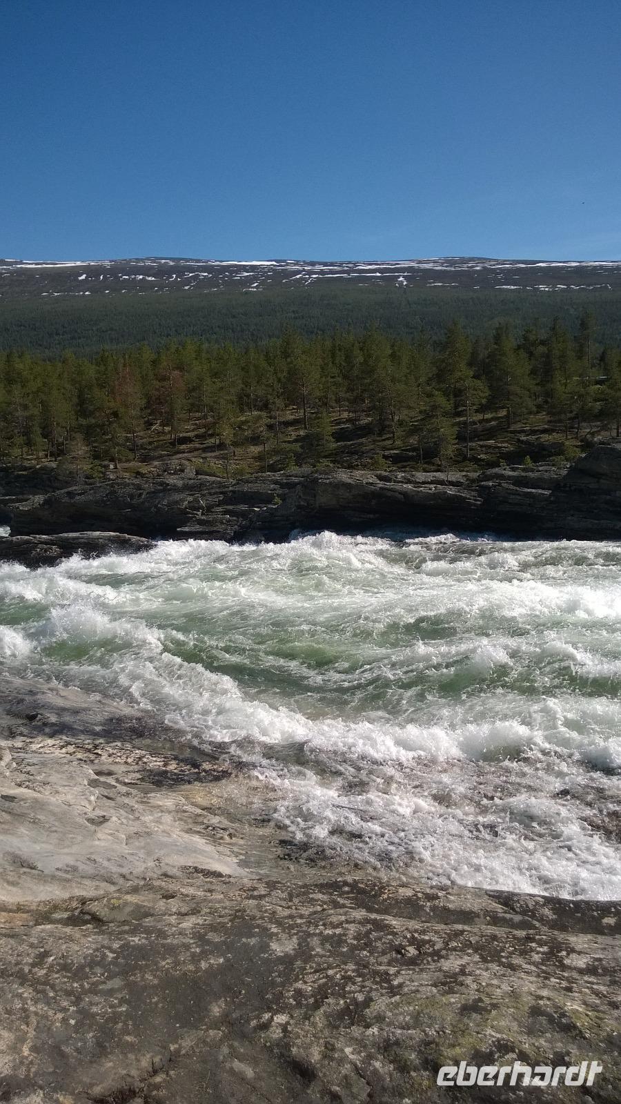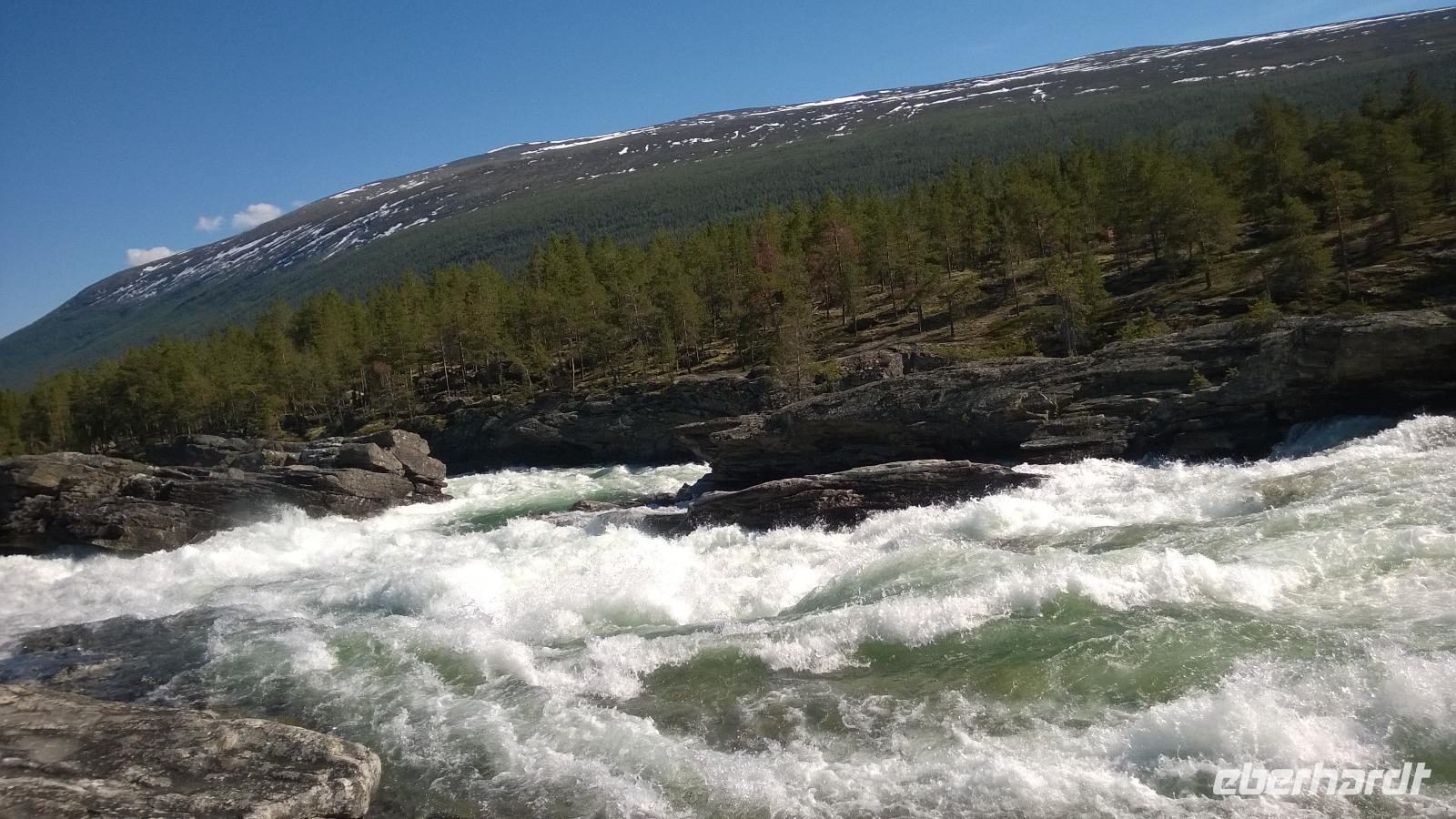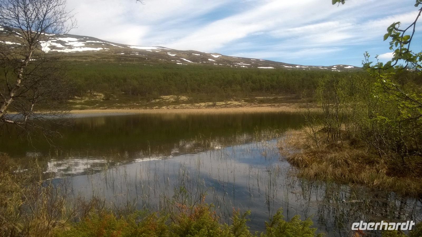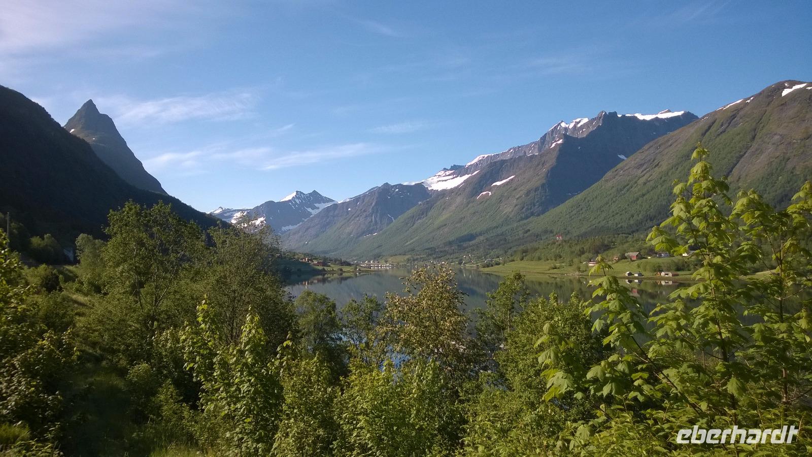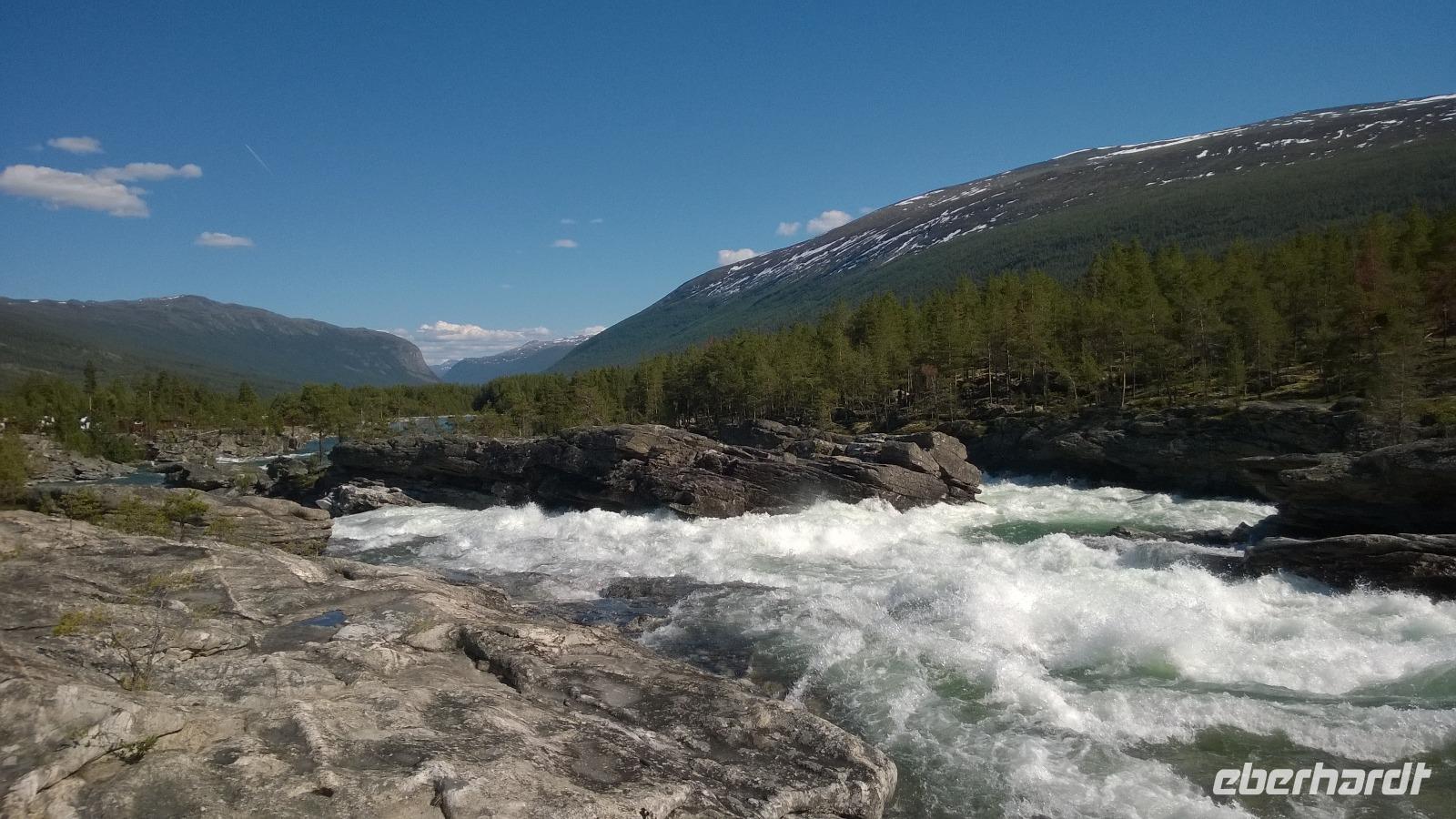 Heute führt uns unser Weg über das Sognefjell, also durchs Gebirge. Falls irgendjemand von soviel gutem Sommerwetter die Nase voll hätte, könnte er sich heute also etwas Abkühlung im Schnee verschaffen. Wir fahren vorbei an den Sommerskigebieten und sehen die Sportler beim Langlauf.