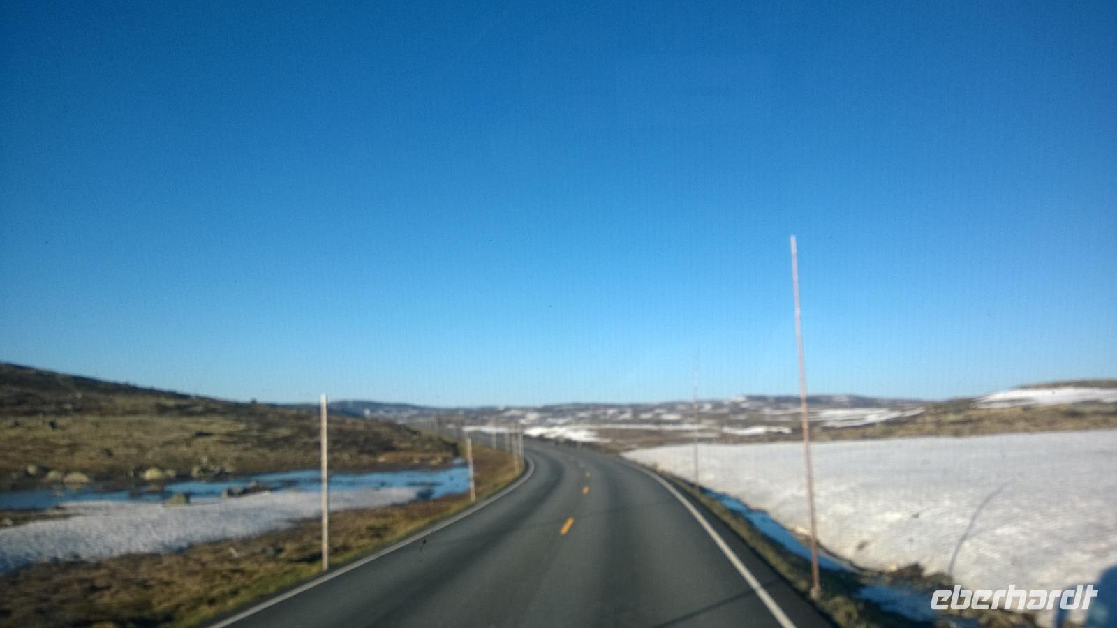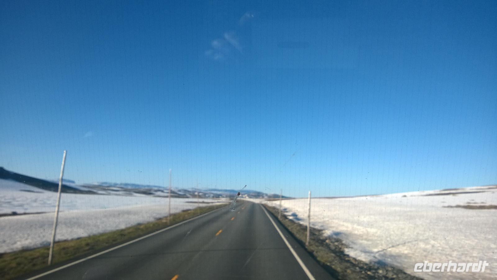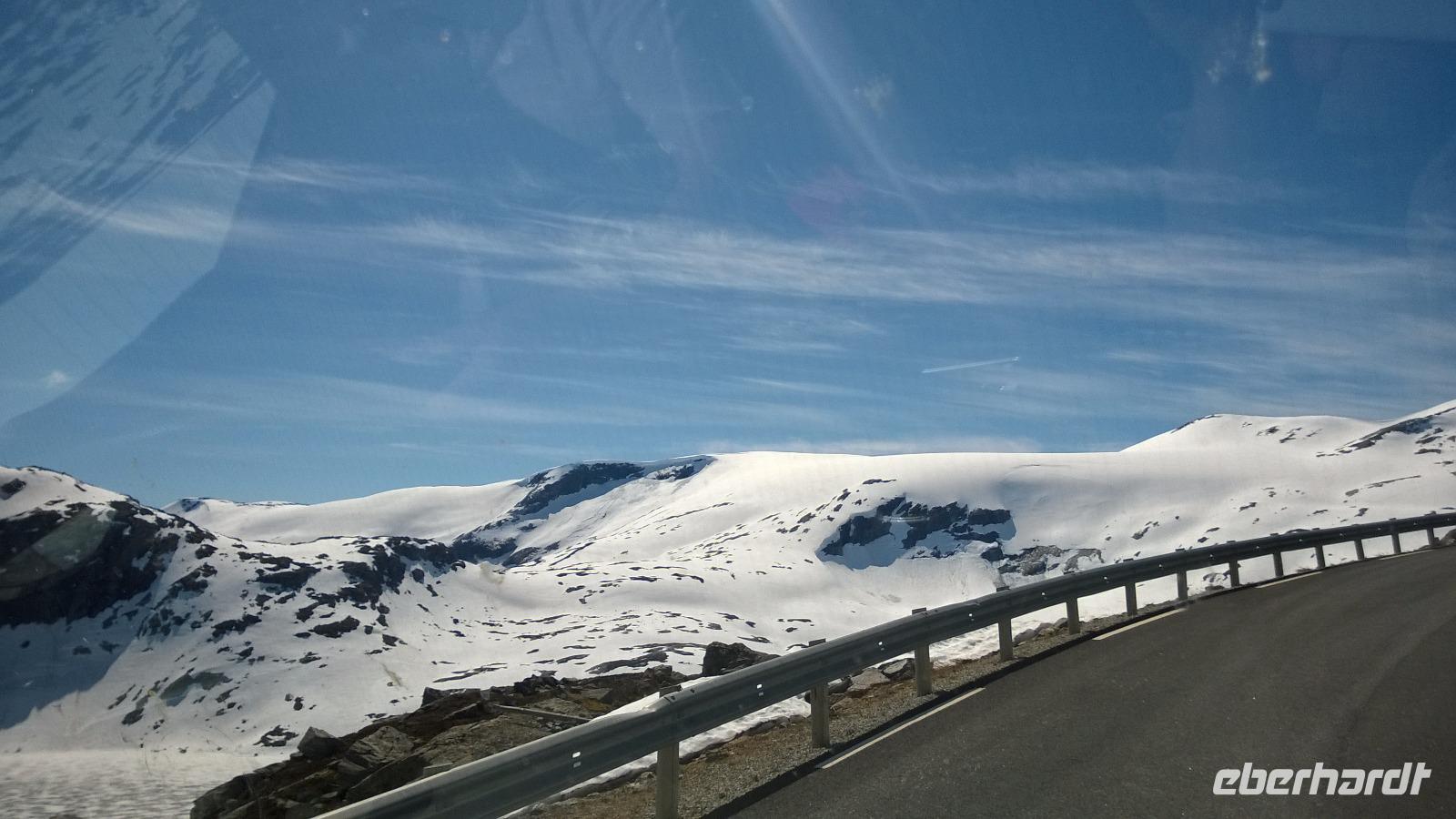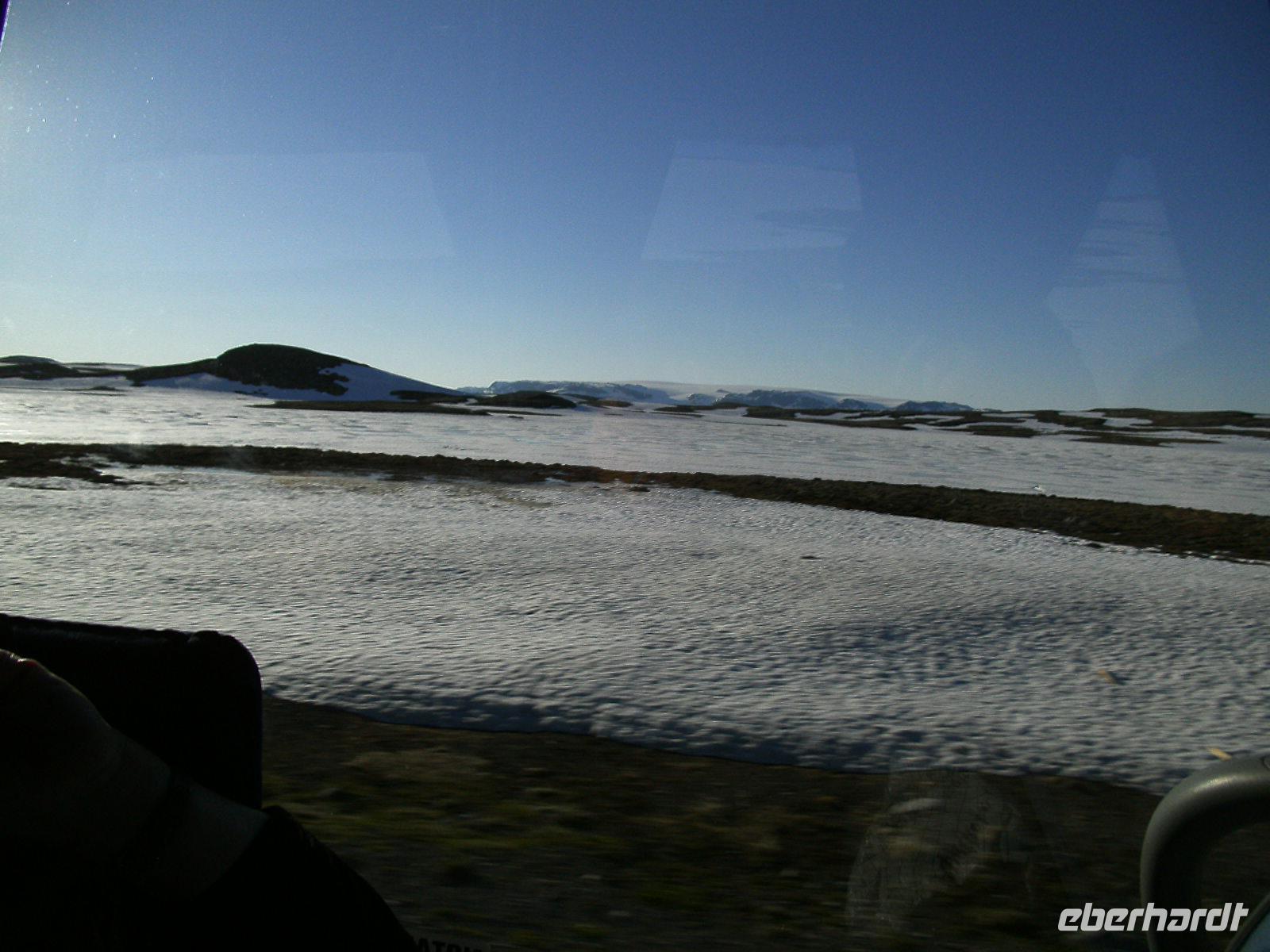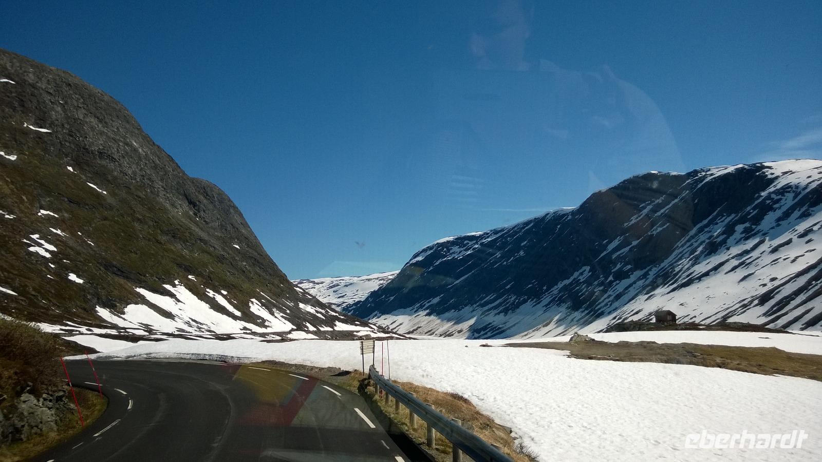 Nun geht es weiter über das Dovrefjell, also ins Gebirge. Die Moschusochsen, die hier wieder angesiedelt wurden, lassen sich leider nicht blicken, aber eindrucksvoll ist diese karge und schneereiche Landschaft trotzdem.