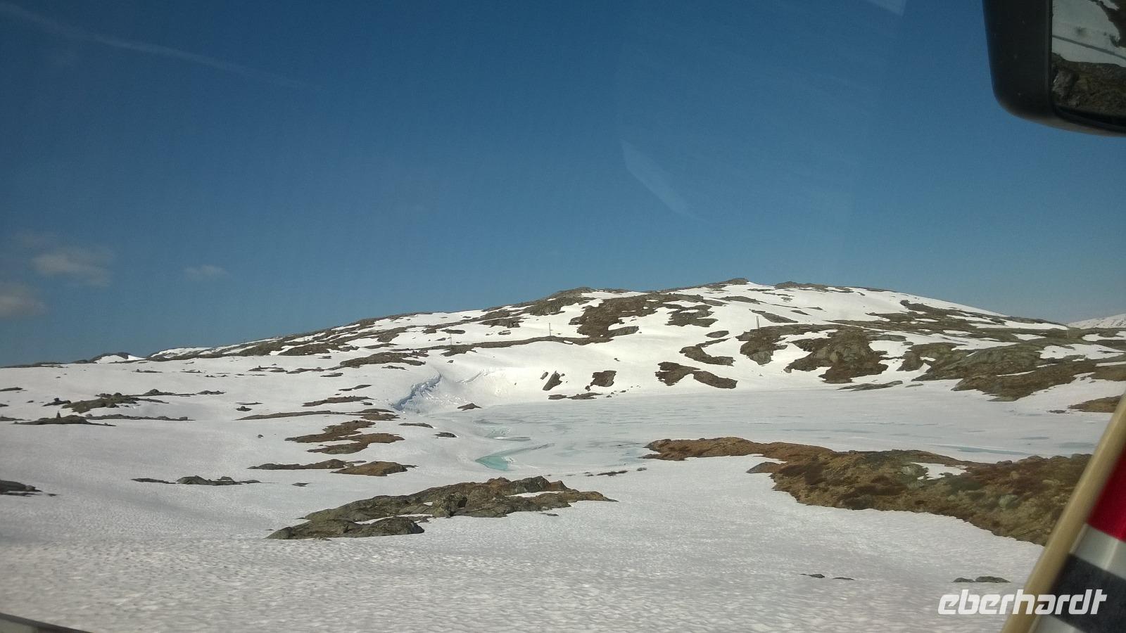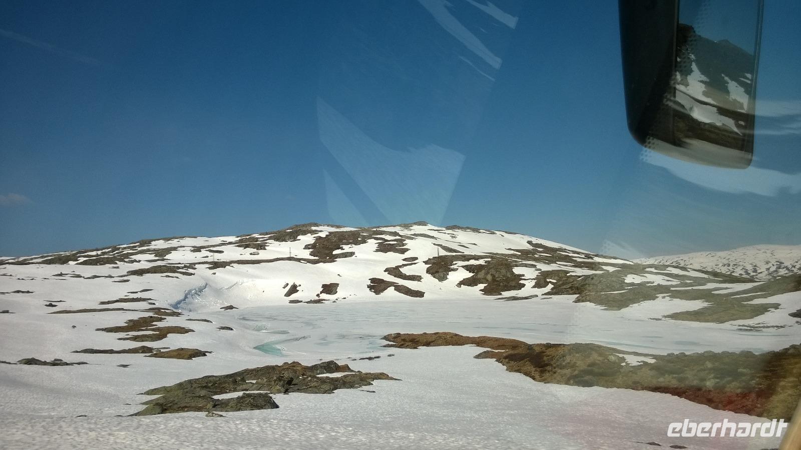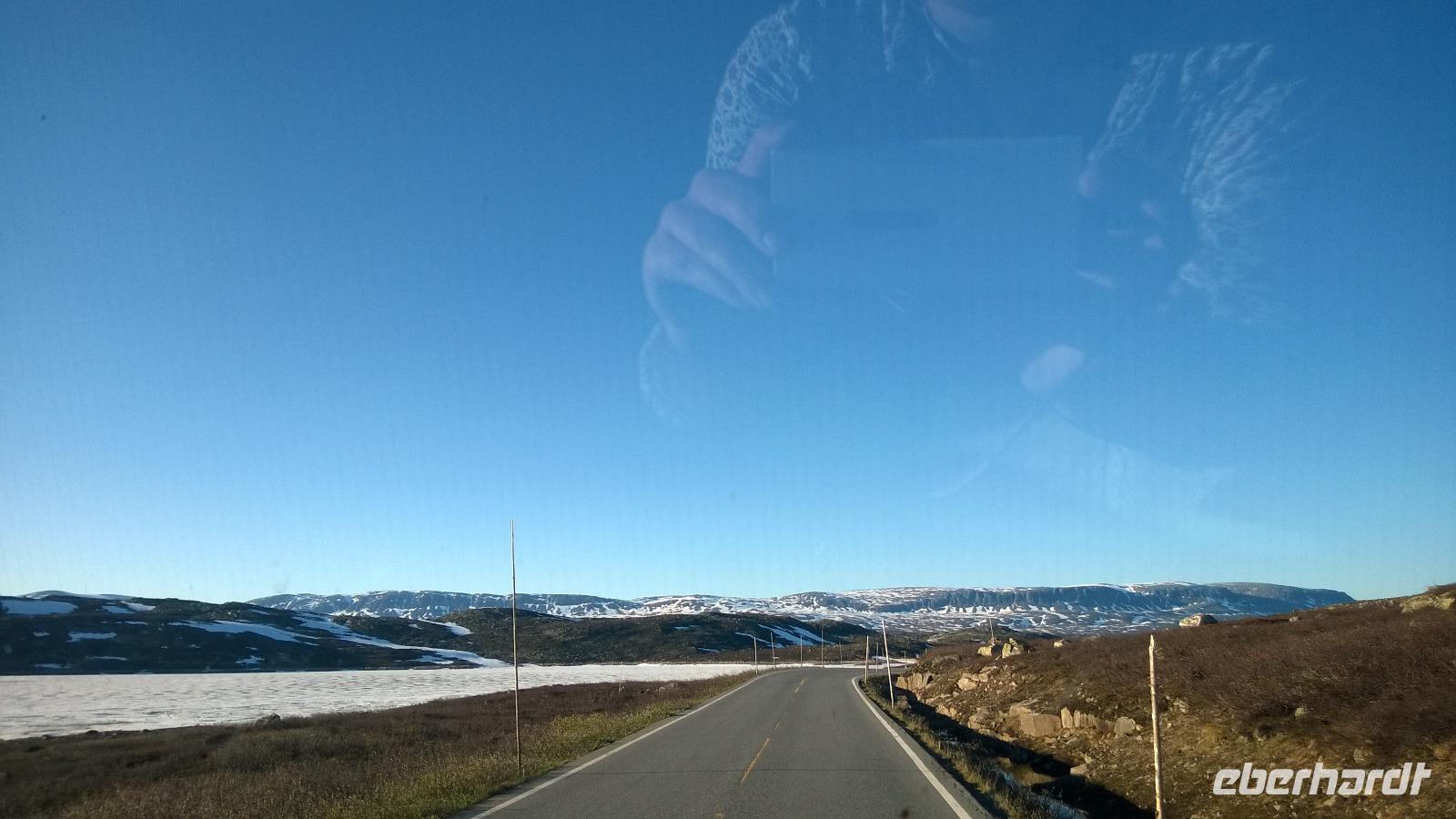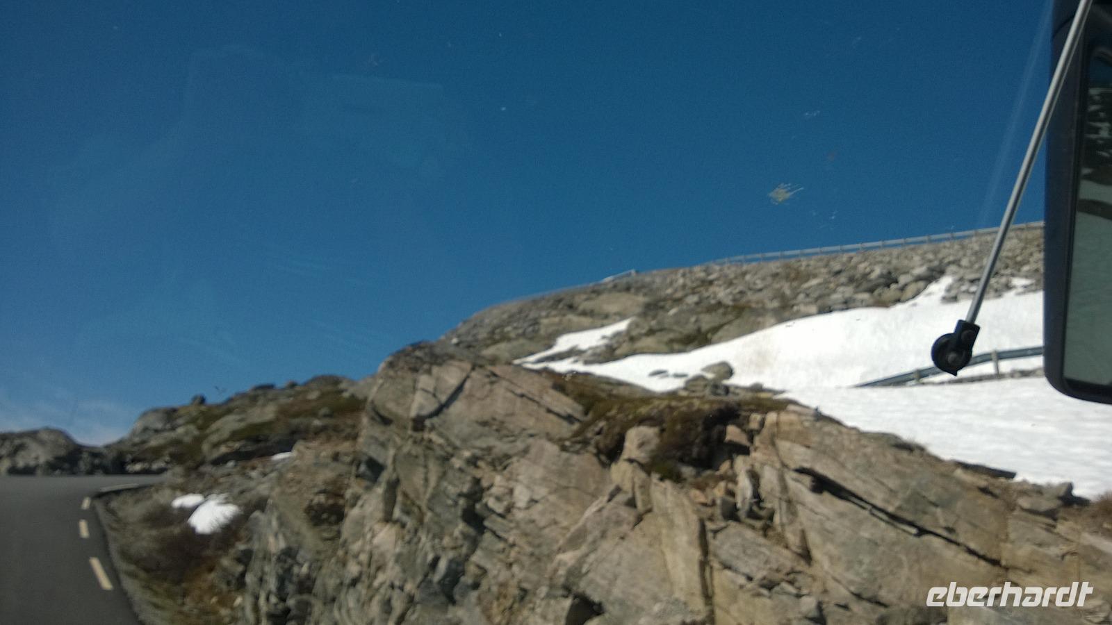 Nun geht es weiter über das Dovrefjell, also ins Gebirge. Die Moschusochsen, die hier wieder angesiedelt wurden, lassen sich leider nicht blicken, aber eindrucksvoll ist diese karge und schneereiche Landschaft trotzdem.