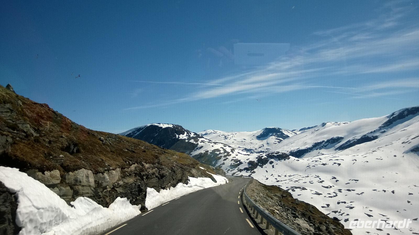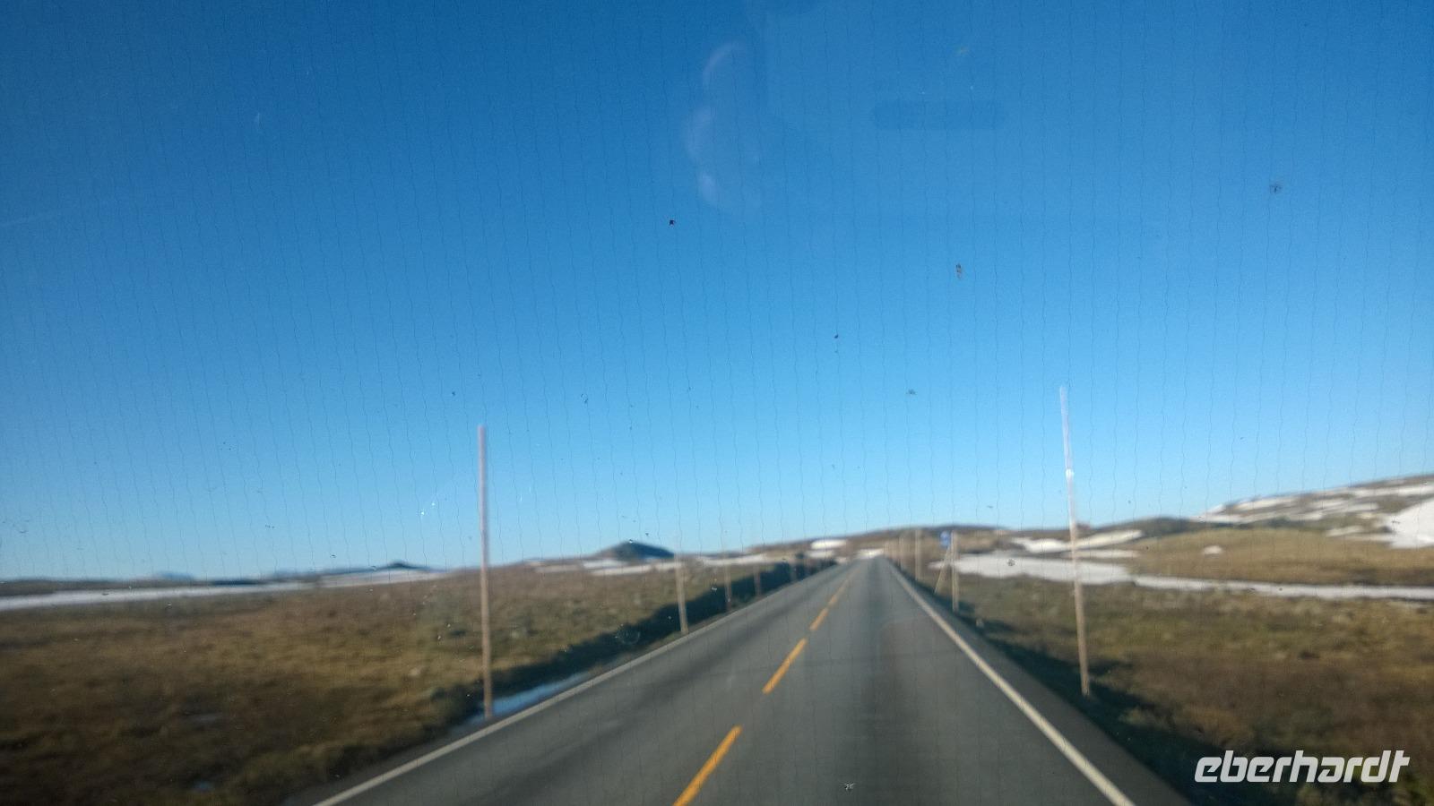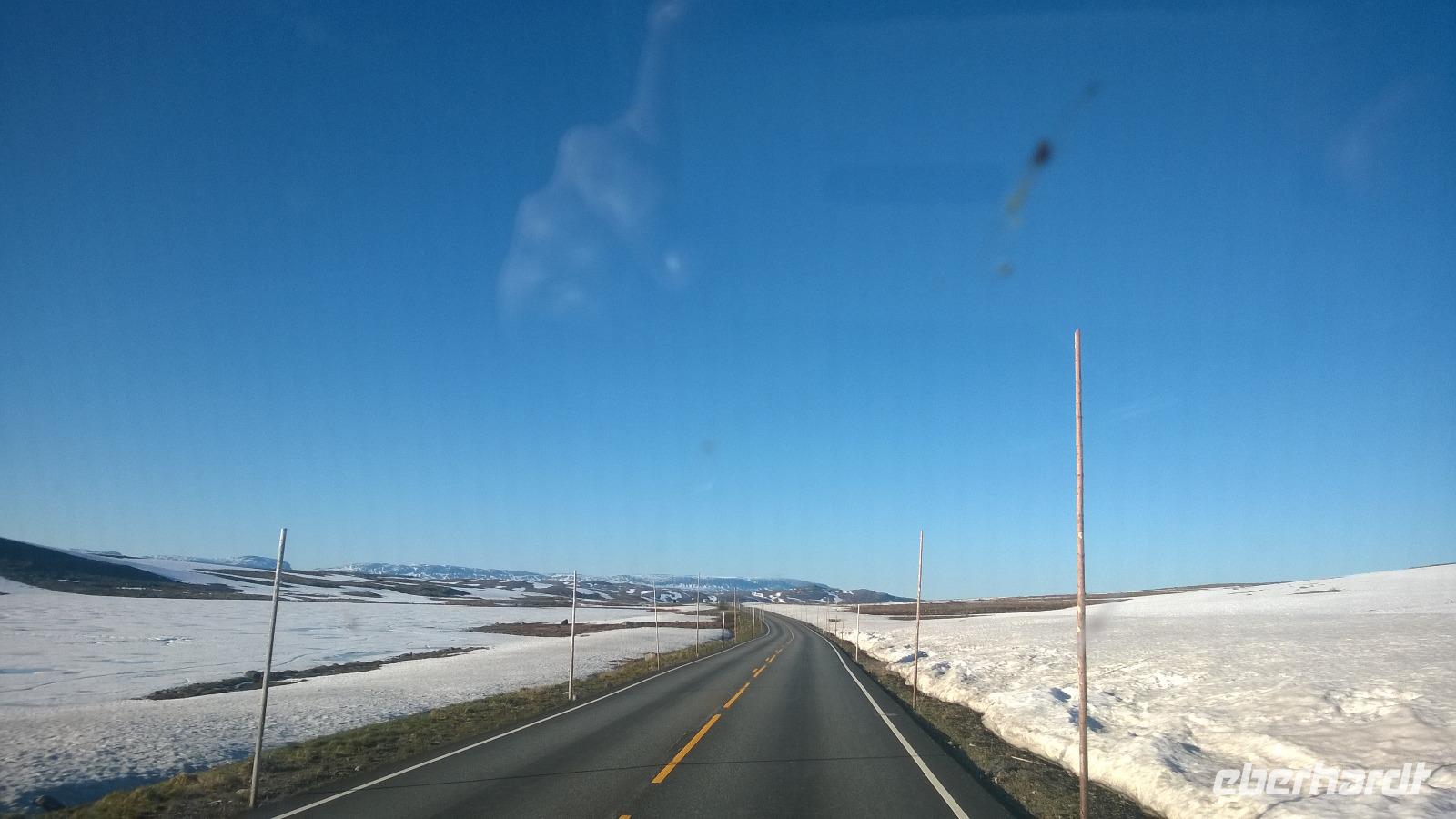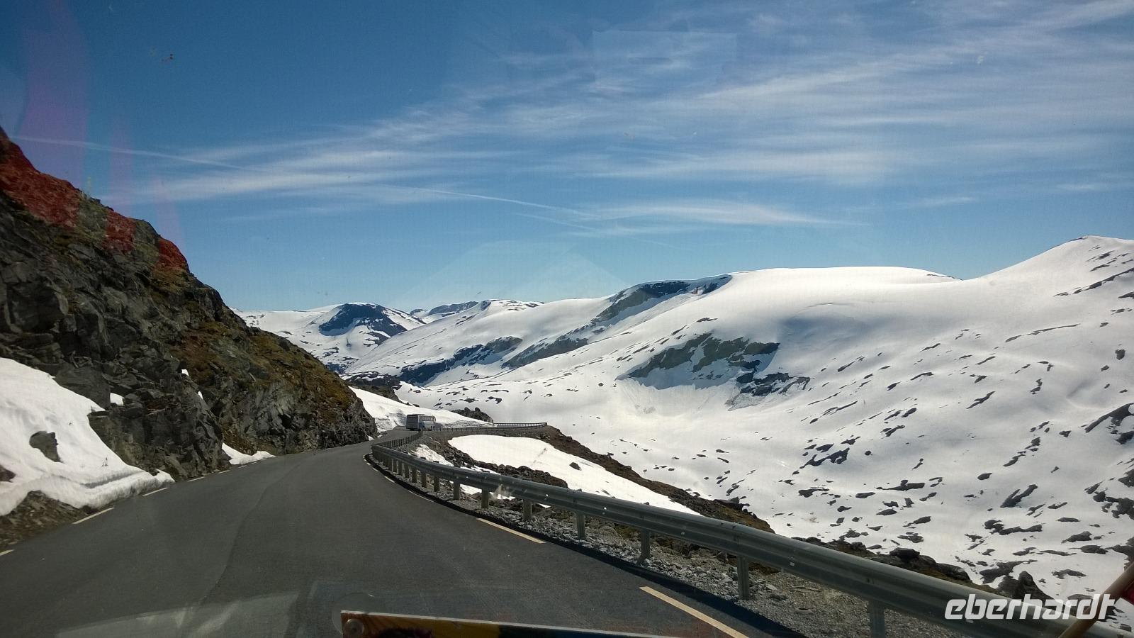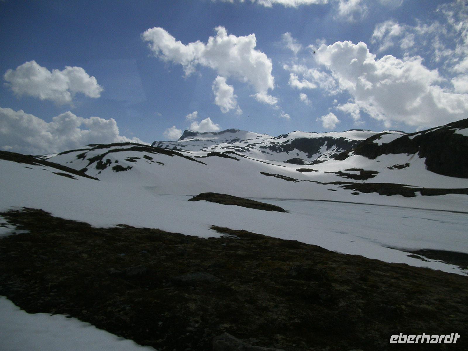 Nun geht es weiter über das Dovrefjell, also ins Gebirge. Die Moschusochsen, die hier wieder angesiedelt wurden, lassen sich leider nicht blicken, aber eindrucksvoll ist diese karge und schneereiche Landschaft trotzdem.