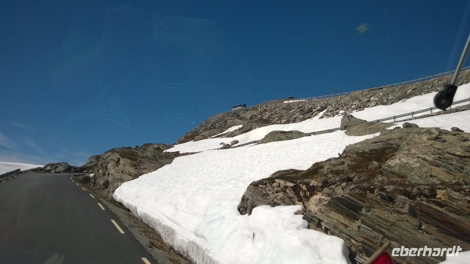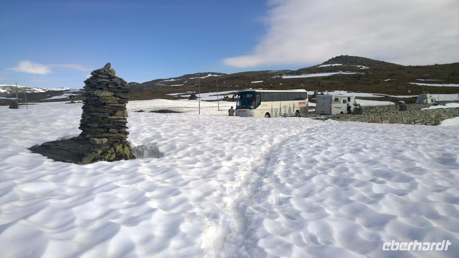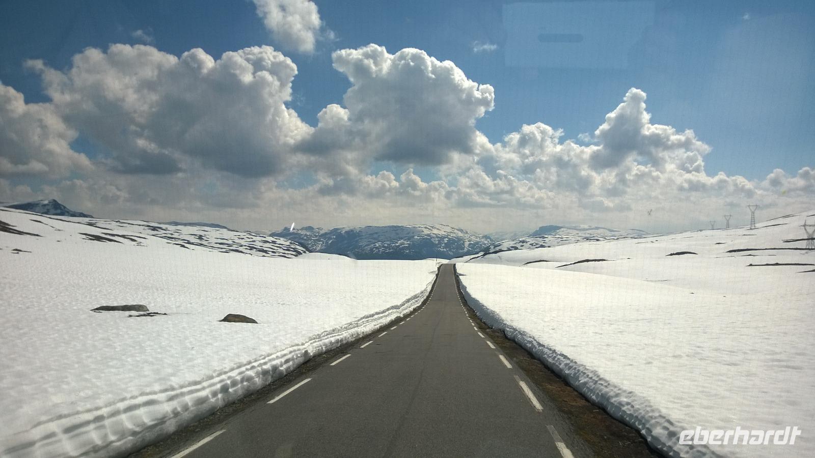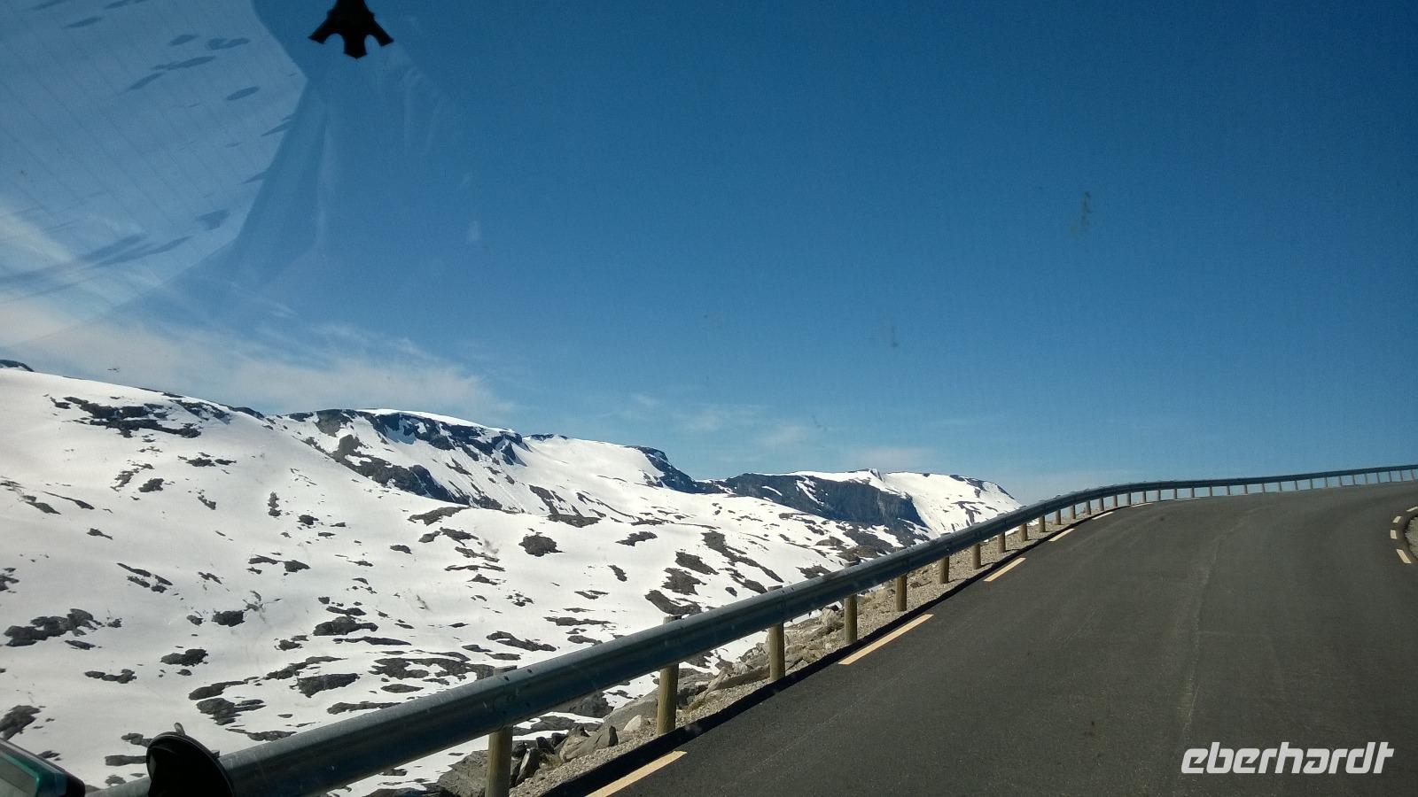 Nun geht es weiter über das Dovrefjell, also ins Gebirge. Die Moschusochsen, die hier wieder angesiedelt wurden, lassen sich leider nicht blicken, aber eindrucksvoll ist diese karge und schneereiche Landschaft trotzdem.