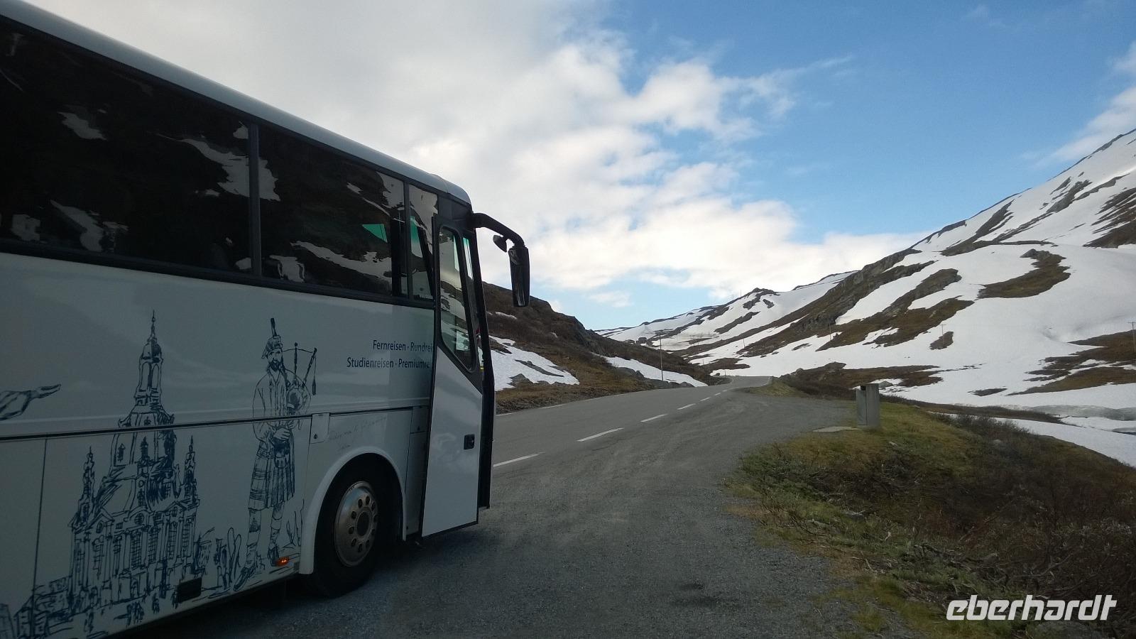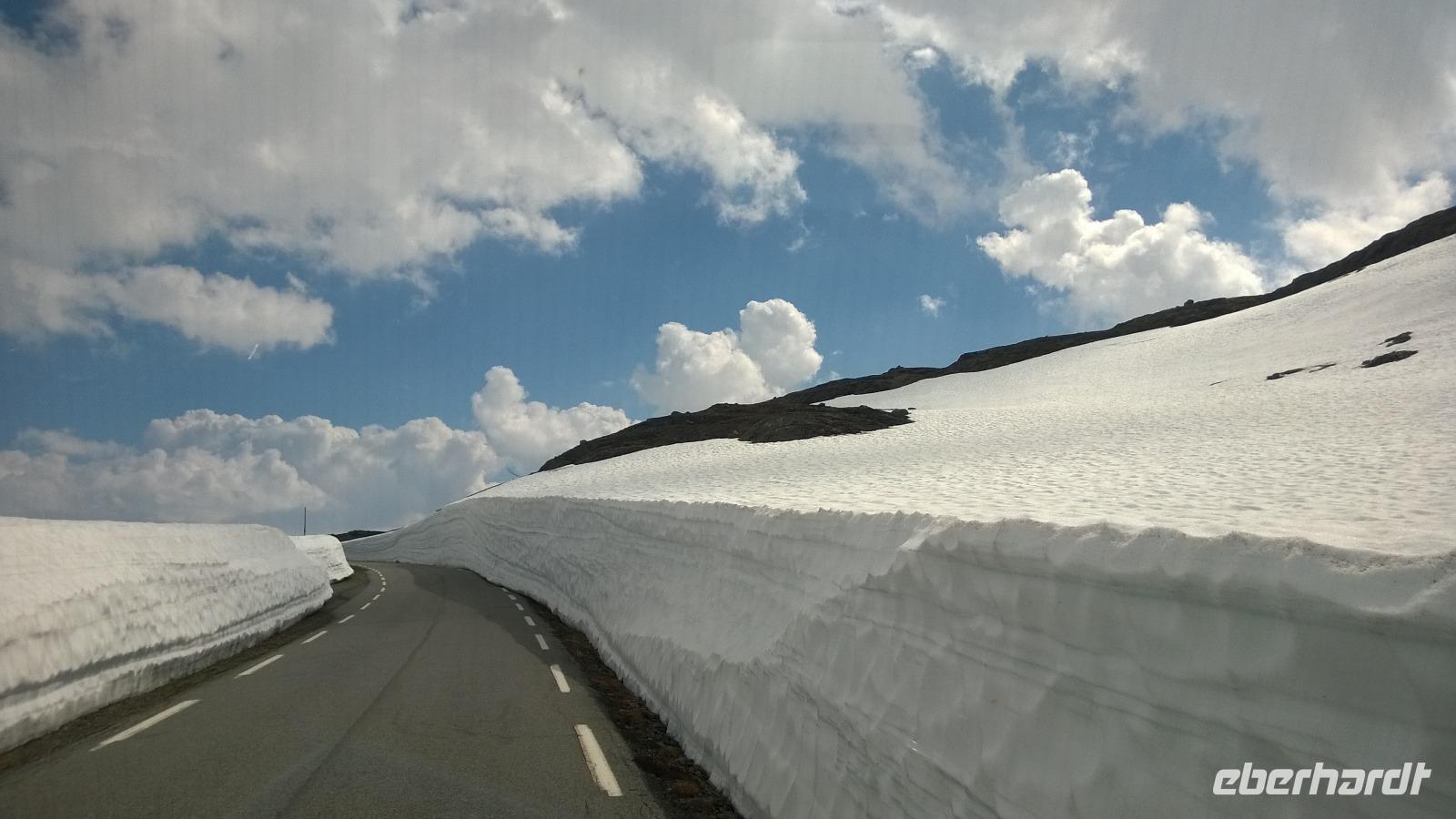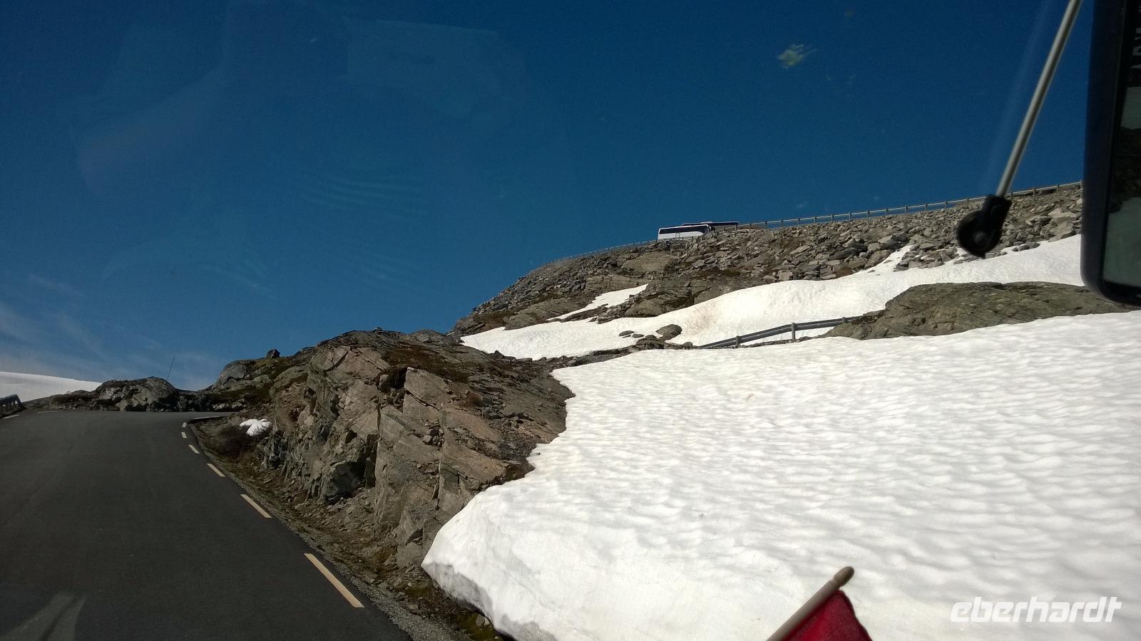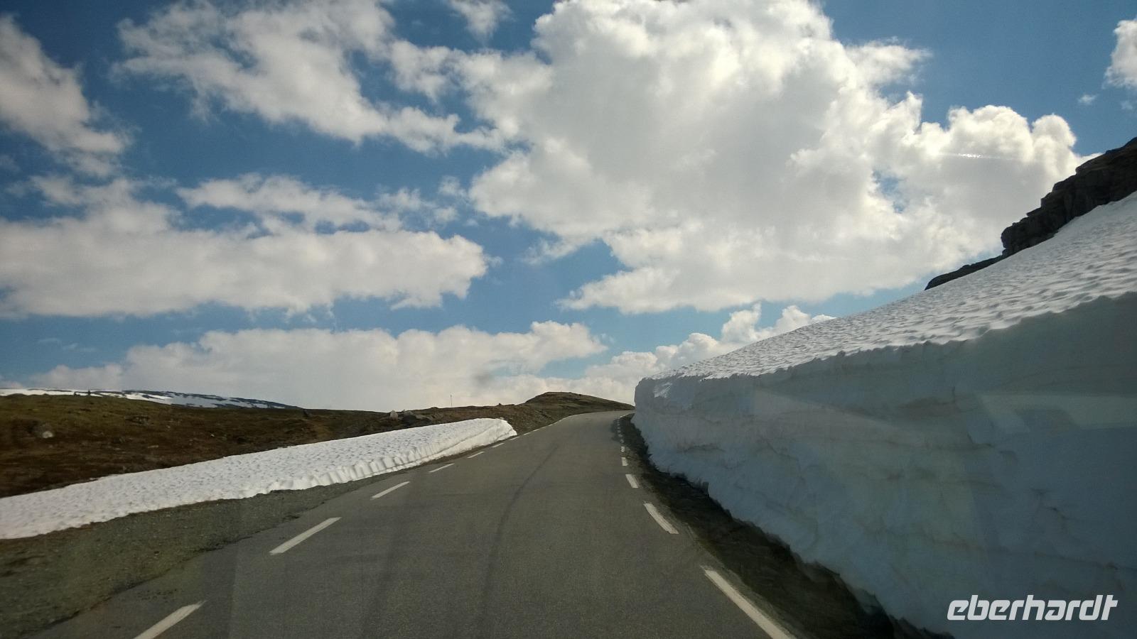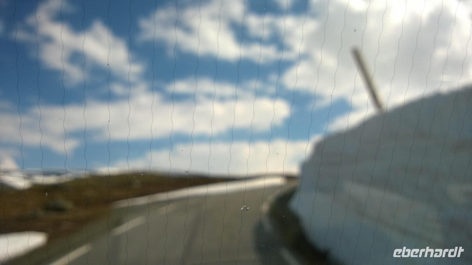 Nun geht es weiter über das Dovrefjell, also ins Gebirge. Die Moschusochsen, die hier wieder angesiedelt wurden, lassen sich leider nicht blicken, aber eindrucksvoll ist diese karge und schneereiche Landschaft trotzdem.
