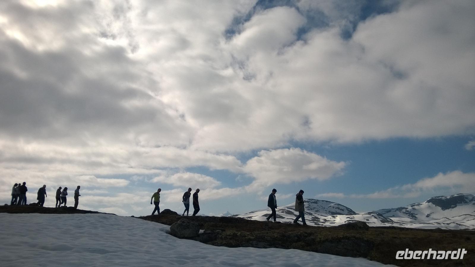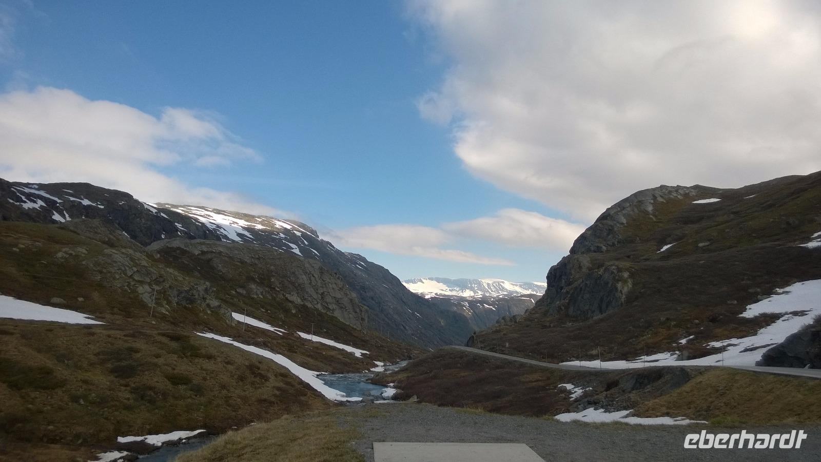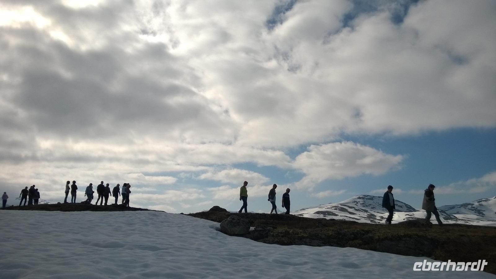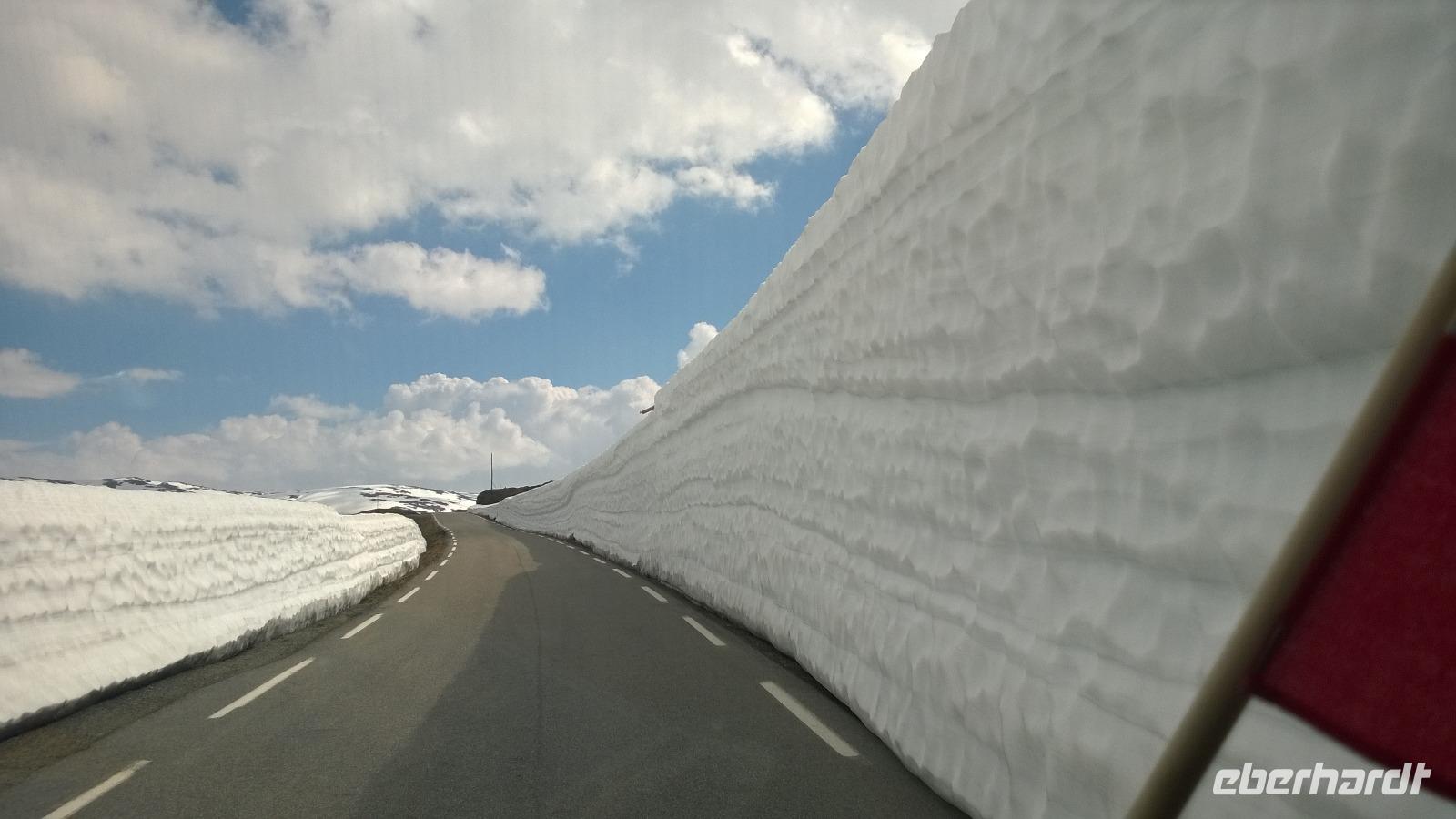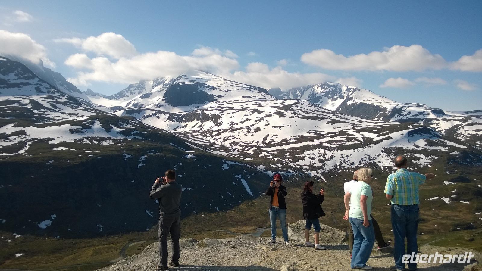 Nun geht es weiter über das Dovrefjell, also ins Gebirge. Die Moschusochsen, die hier wieder angesiedelt wurden, lassen sich leider nicht blicken, aber eindrucksvoll ist diese karge und schneereiche Landschaft trotzdem.