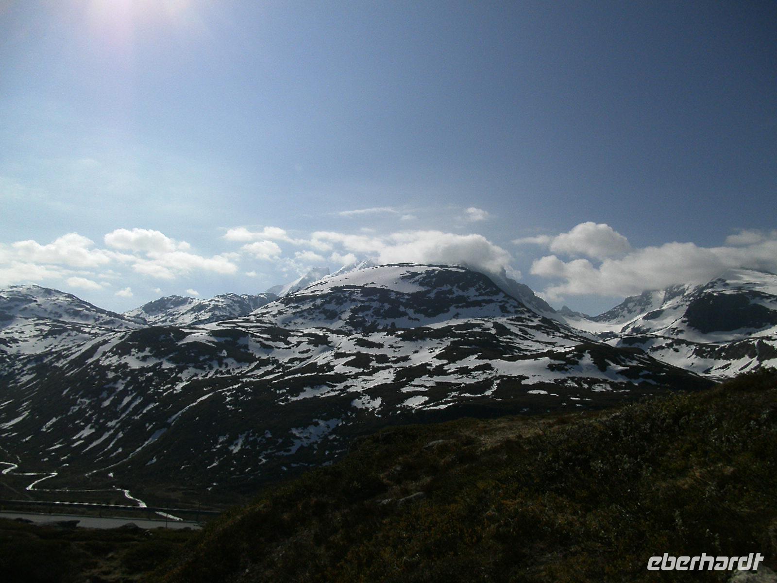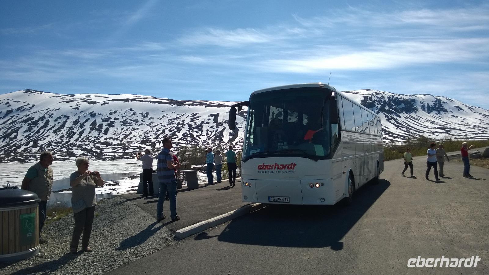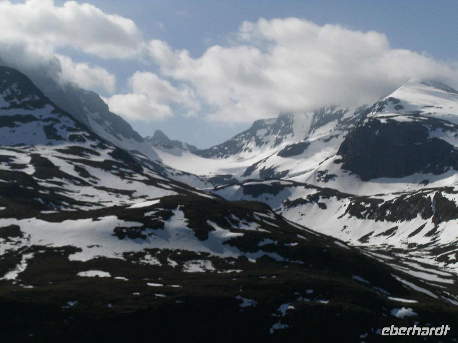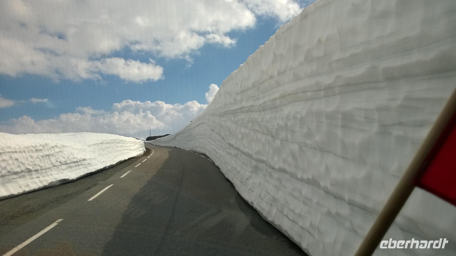 Nun geht es weiter über das Dovrefjell, also ins Gebirge. Die Moschusochsen, die hier wieder angesiedelt wurden, lassen sich leider nicht blicken, aber eindrucksvoll ist diese karge und schneereiche Landschaft trotzdem.