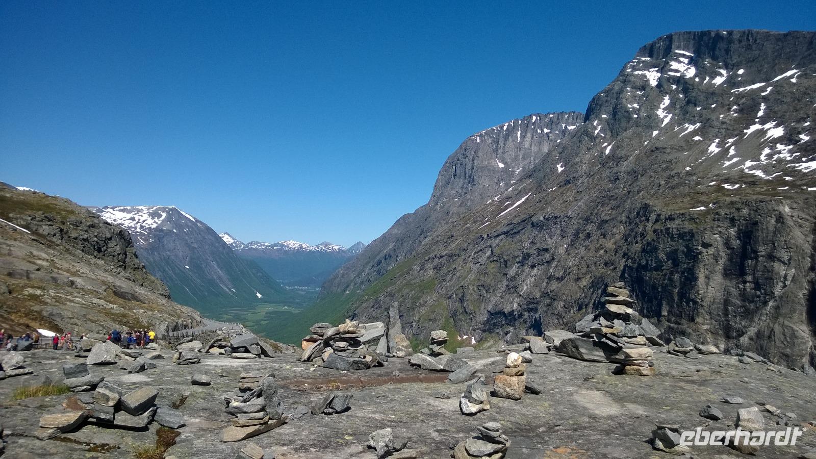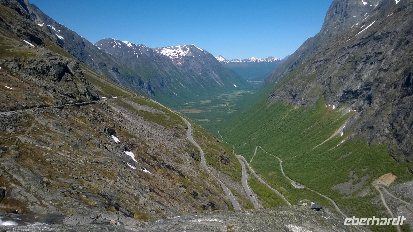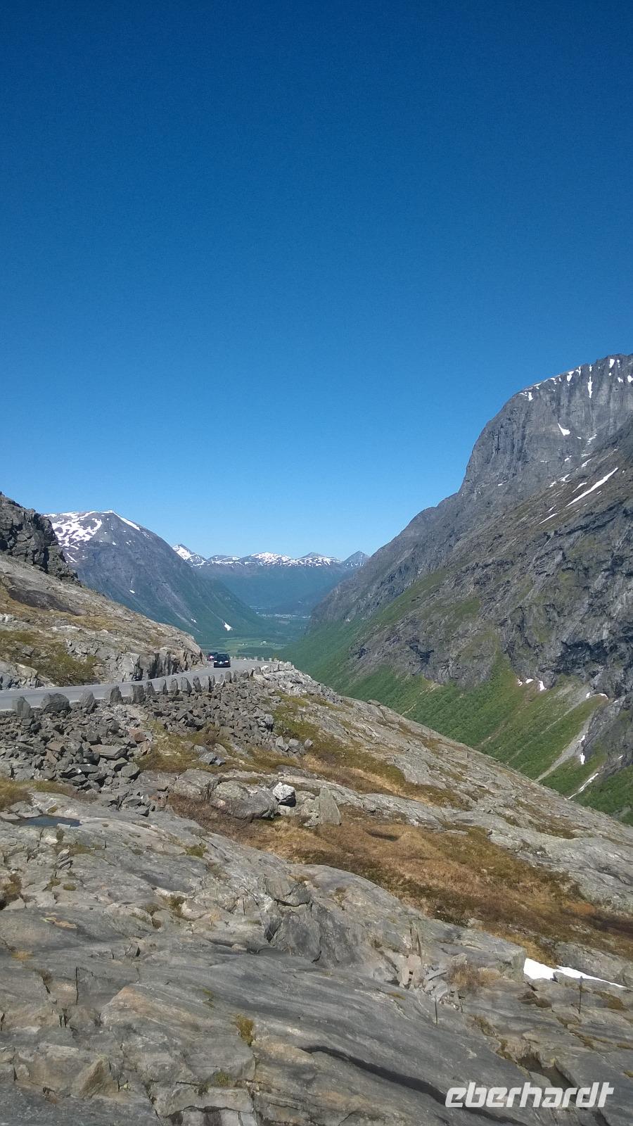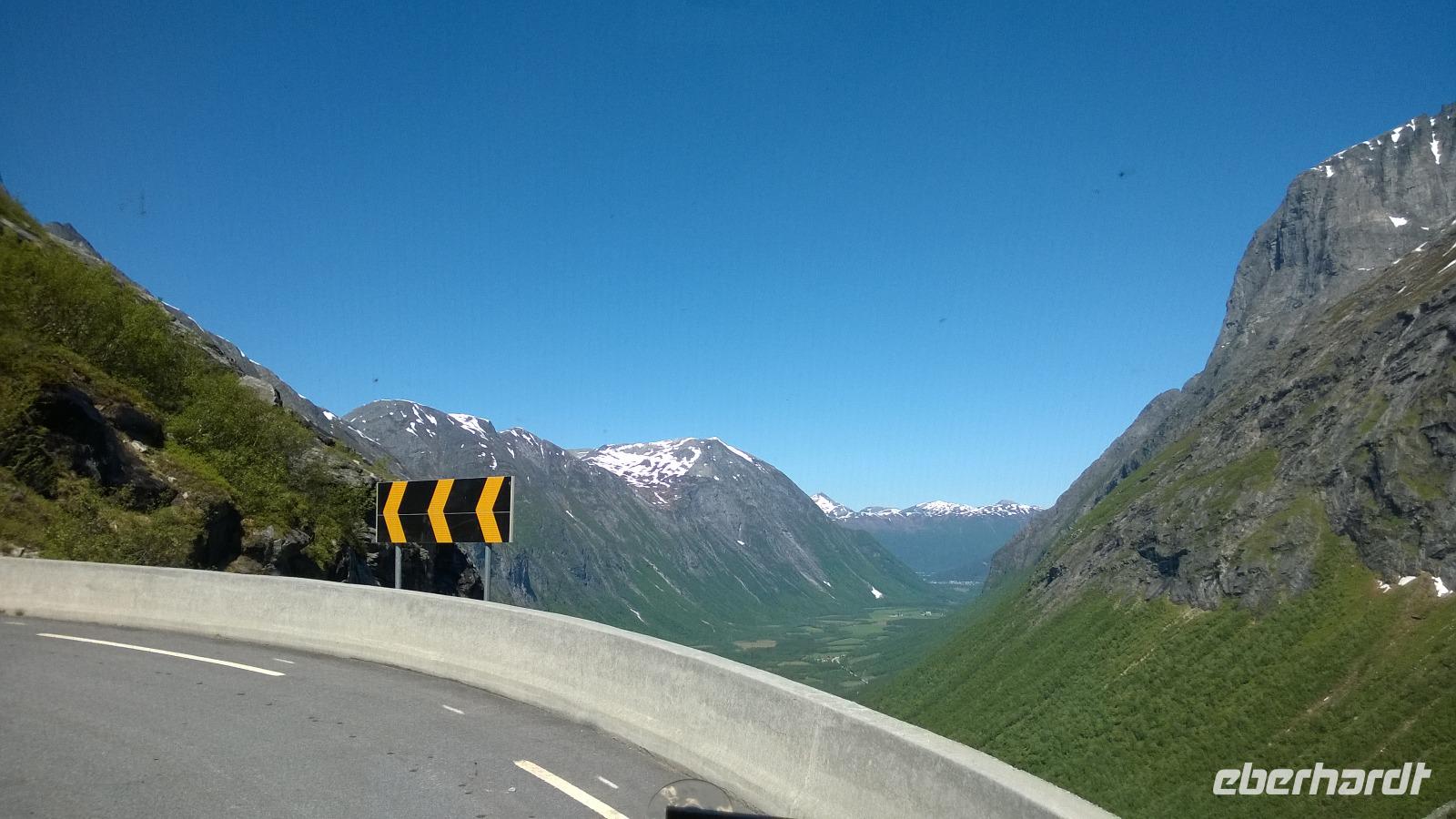 Aber weiter geht's, denn das Abenteuer ruft. Oder viel besser: die Trollwand und die Trollstigen rufen. Ins Gebirge zieht es uns und so bestaunen wir erst einmal die berühmte Trollwand von unten, bevor wir dann die Auffahrt auf den Trollstigen wagen. An manchen Stellen der Serpentinenstraße muss man doch die Luft anhalten und Gänsehaut stellt sich ein - ob die vom grandios schönen Ausblick oder vom Schwindelgefühl beim Blick nach unten kommt, sei dahingestellt. Oben, auf dem Gudbrandsjuvet angekommen, ist die Aussicht nochmal schöner und ergreifender.