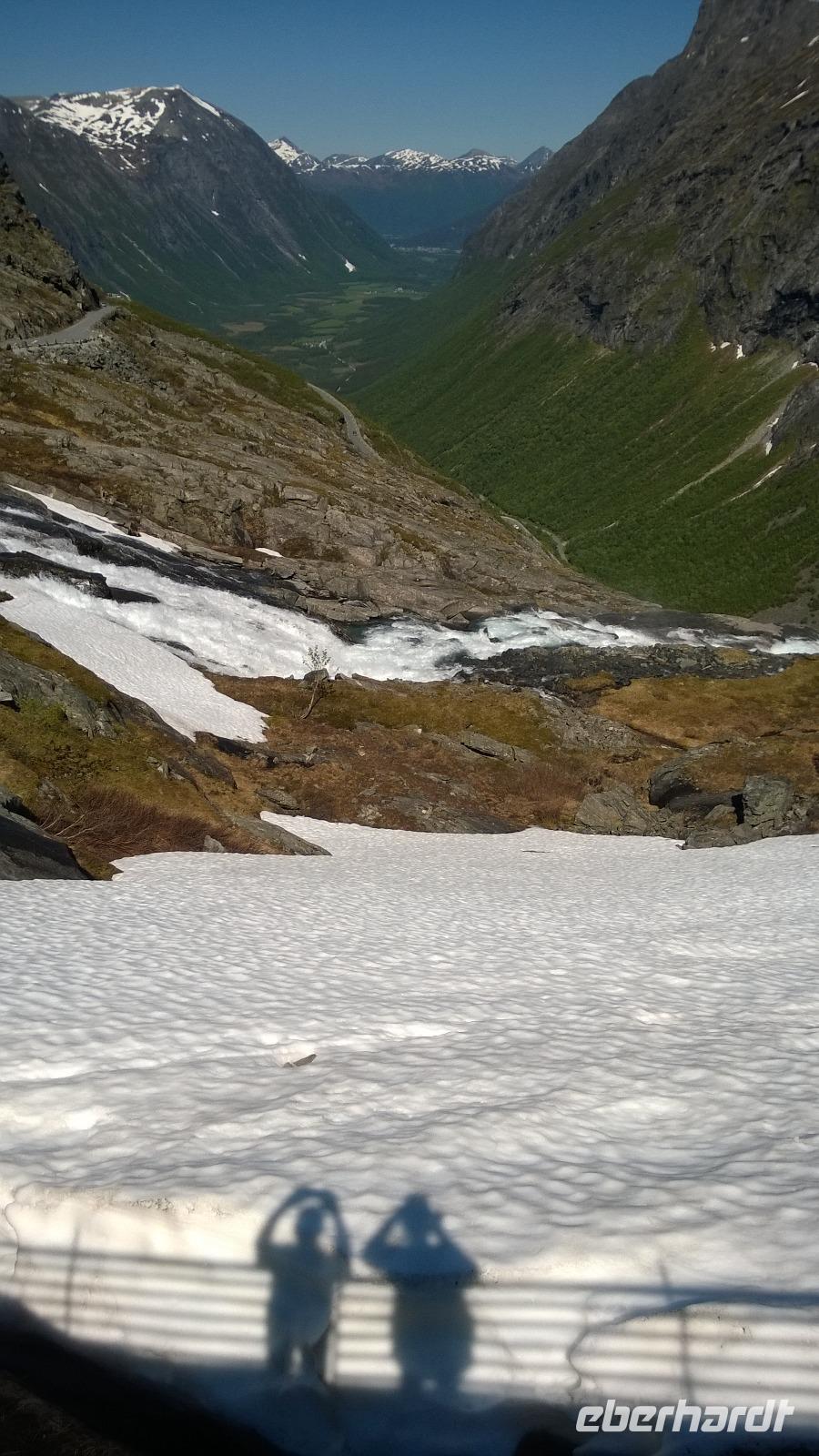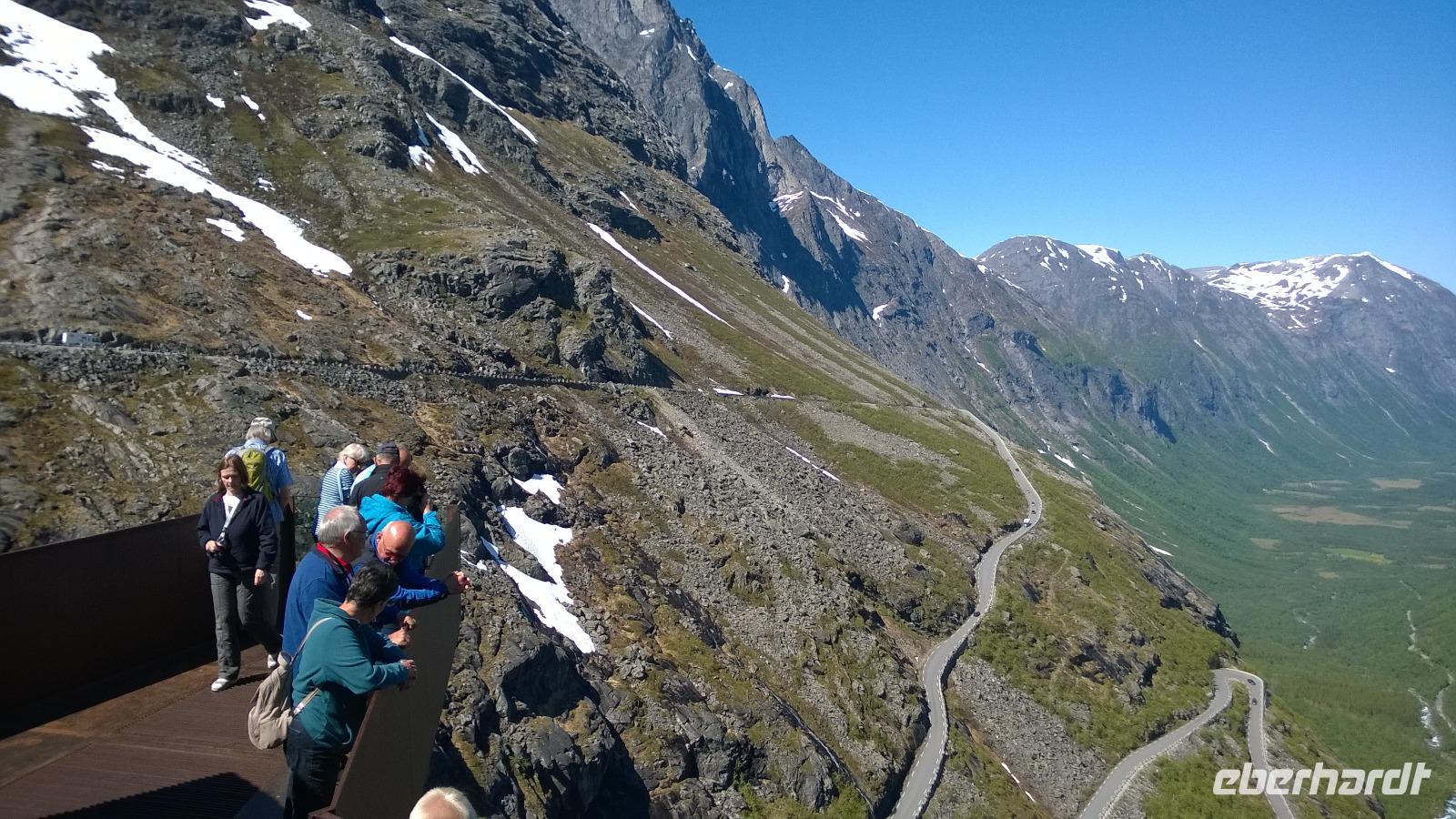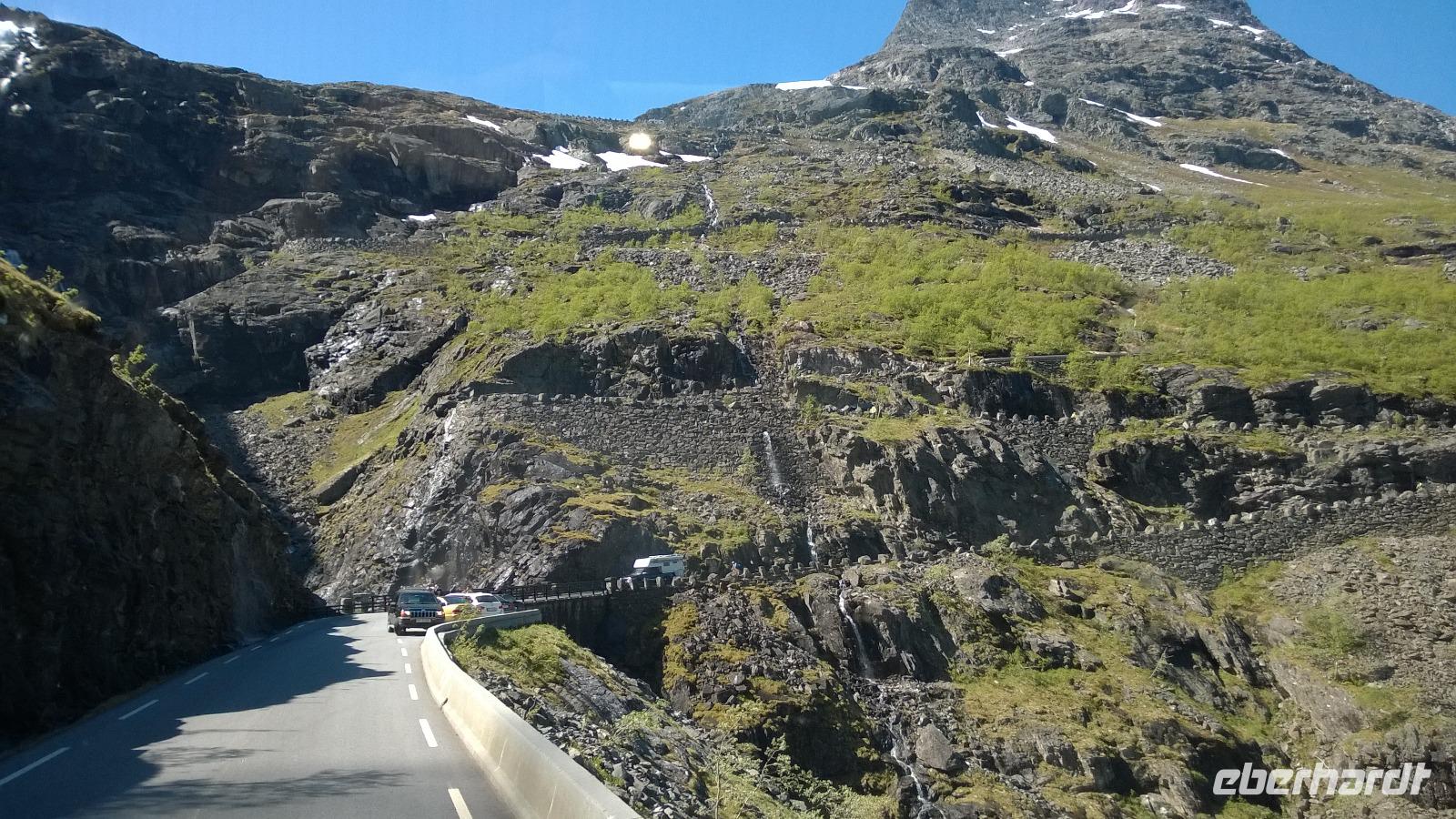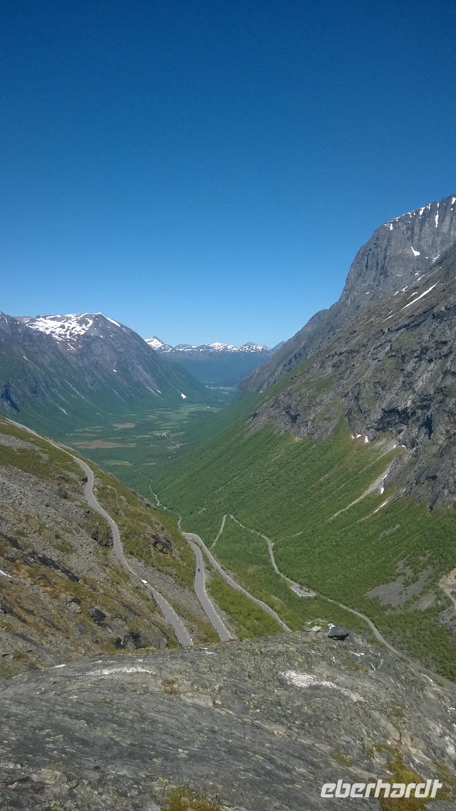 Aber weiter geht's, denn das Abenteuer ruft. Oder viel besser: die Trollwand und die Trollstigen rufen. Ins Gebirge zieht es uns und so bestaunen wir erst einmal die berühmte Trollwand von unten, bevor wir dann die Auffahrt auf den Trollstigen wagen. An manchen Stellen der Serpentinenstraße muss man doch die Luft anhalten und Gänsehaut stellt sich ein - ob die vom grandios schönen Ausblick oder vom Schwindelgefühl beim Blick nach unten kommt, sei dahingestellt. Oben, auf dem Gudbrandsjuvet angekommen, ist die Aussicht nochmal schöner und ergreifender.