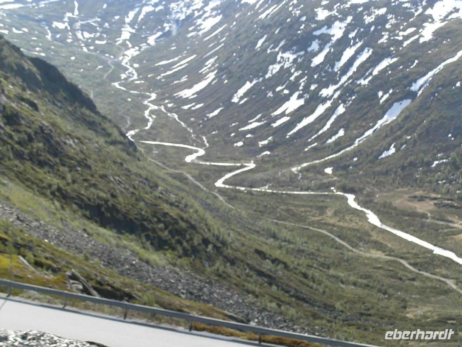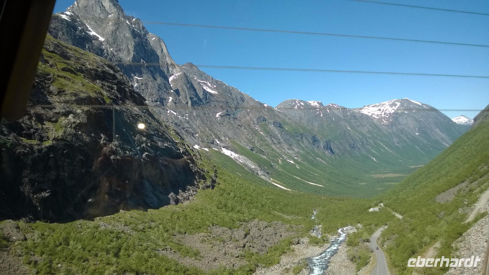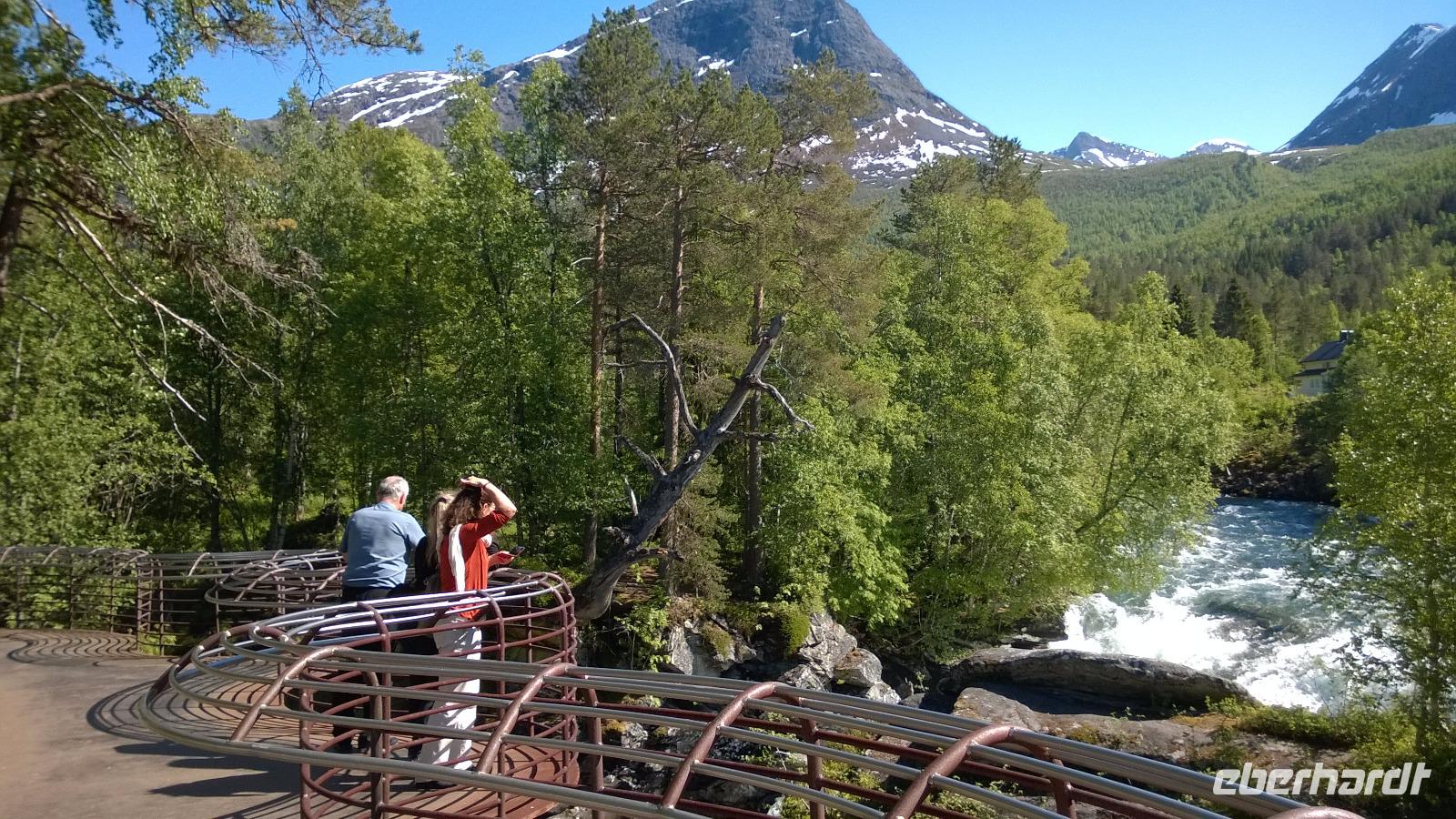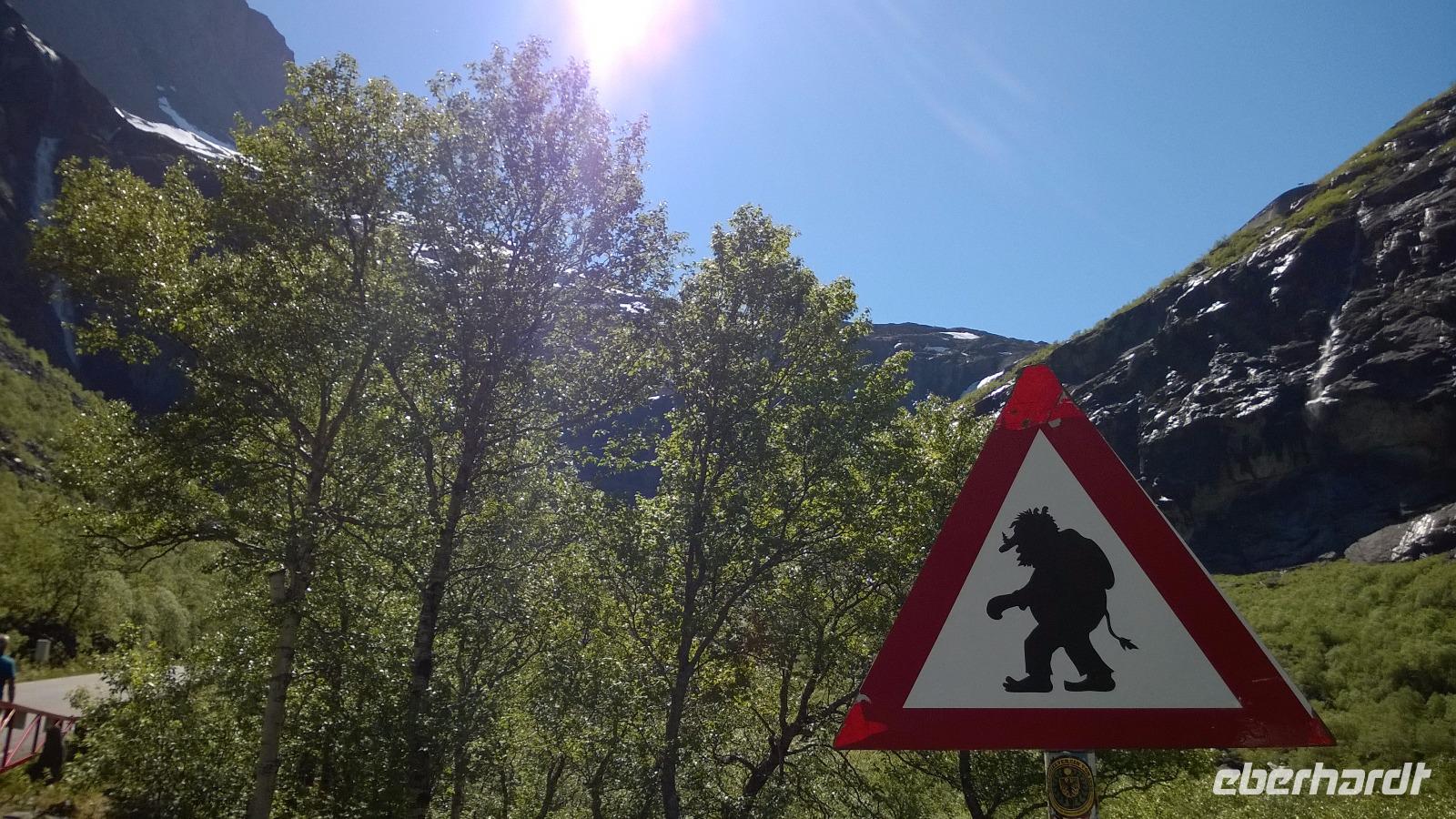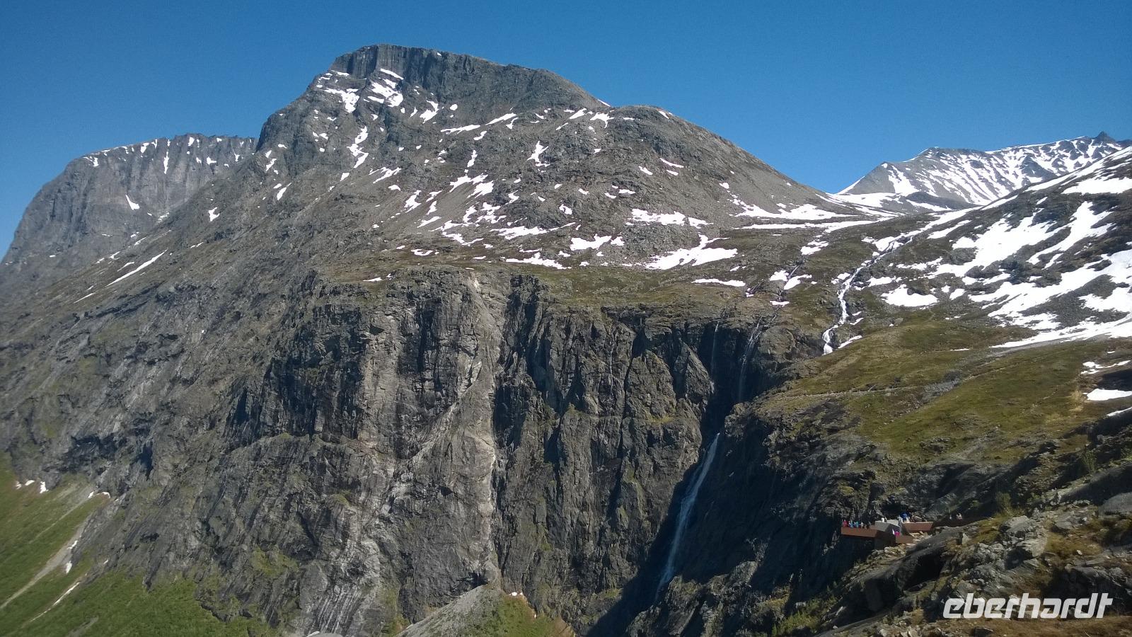 Aber weiter geht's, denn das Abenteuer ruft. Oder viel besser: die Trollwand und die Trollstigen rufen. Ins Gebirge zieht es uns und so bestaunen wir erst einmal die berühmte Trollwand von unten, bevor wir dann die Auffahrt auf den Trollstigen wagen. An manchen Stellen der Serpentinenstraße muss man doch die Luft anhalten und Gänsehaut stellt sich ein - ob die vom grandios schönen Ausblick oder vom Schwindelgefühl beim Blick nach unten kommt, sei dahingestellt. Oben, auf dem Gudbrandsjuvet angekommen, ist die Aussicht nochmal schöner und ergreifender.