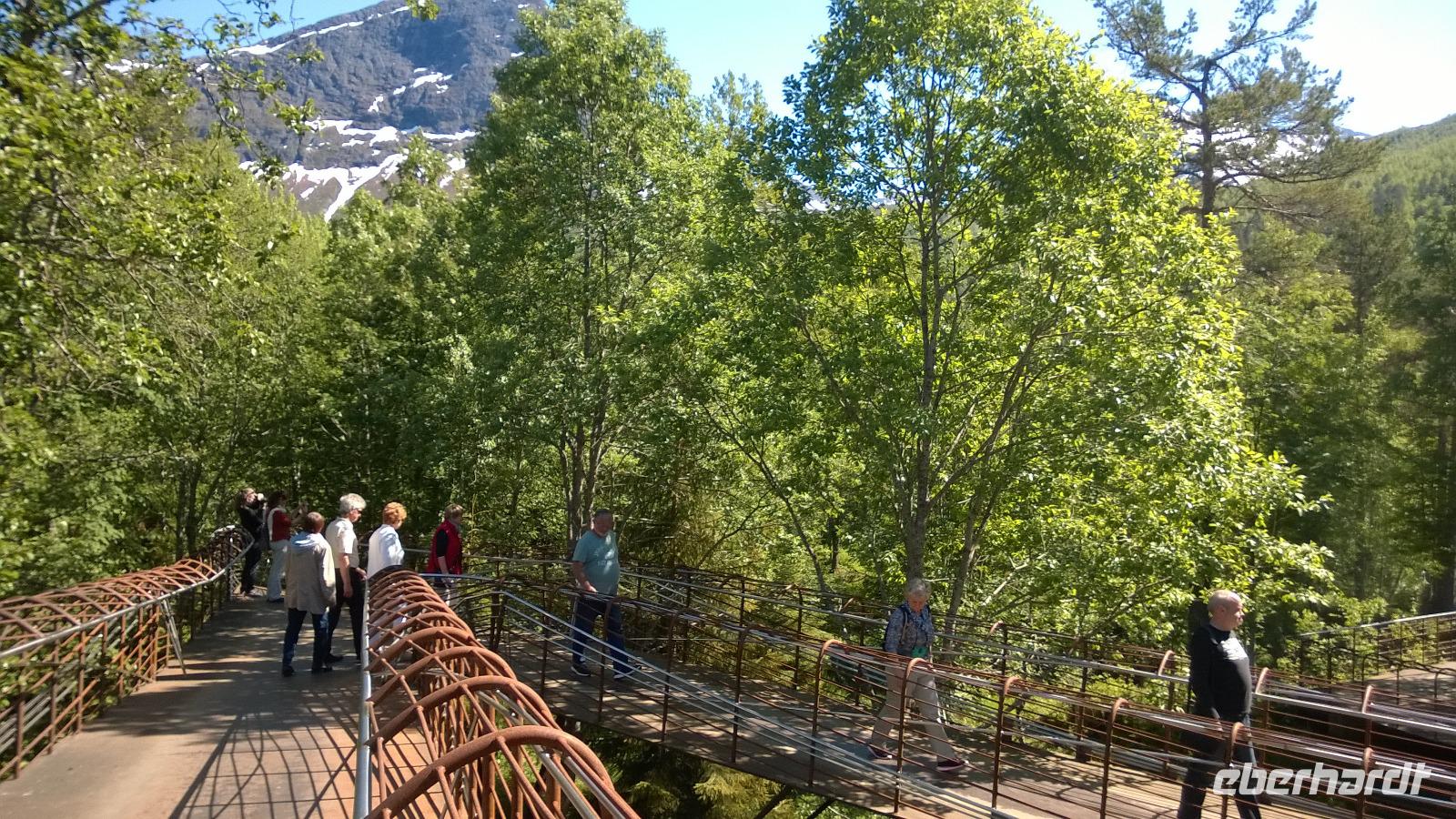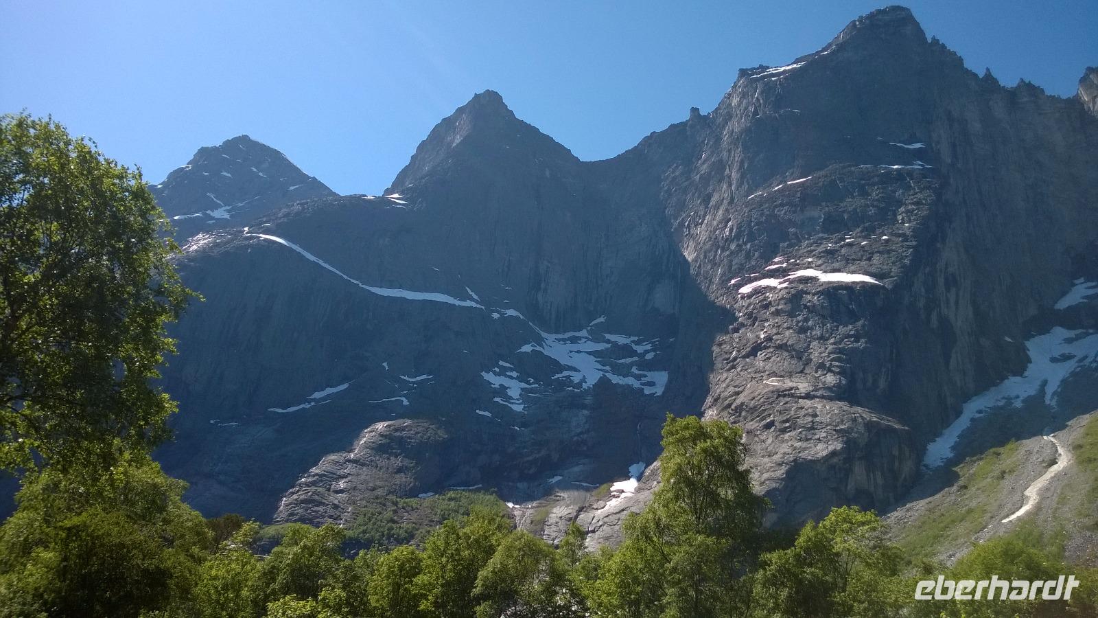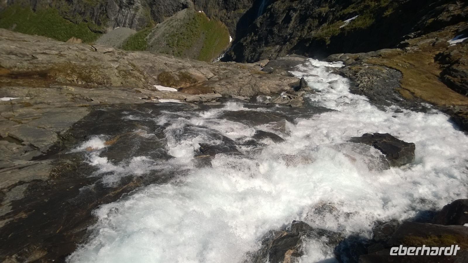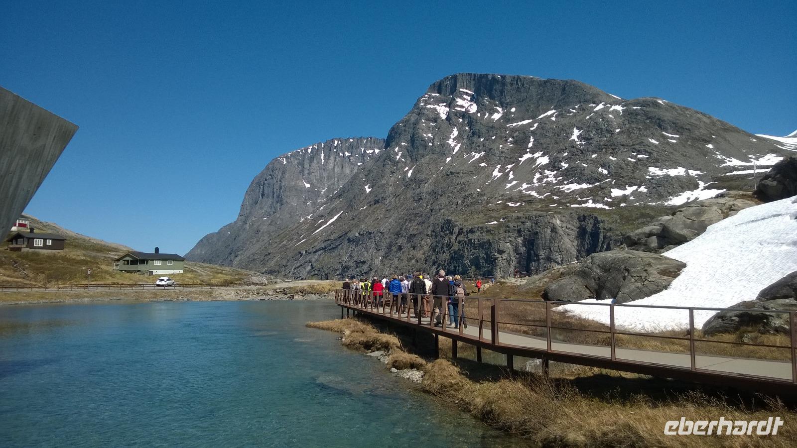 Aber weiter geht's, denn das Abenteuer ruft. Oder viel besser: die Trollwand und die Trollstigen rufen. Ins Gebirge zieht es uns und so bestaunen wir erst einmal die berühmte Trollwand von unten, bevor wir dann die Auffahrt auf den Trollstigen wagen. An manchen Stellen der Serpentinenstraße muss man doch die Luft anhalten und Gänsehaut stellt sich ein - ob die vom grandios schönen Ausblick oder vom Schwindelgefühl beim Blick nach unten kommt, sei dahingestellt. Oben, auf dem Gudbrandsjuvet angekommen, ist die Aussicht nochmal schöner und ergreifender.
