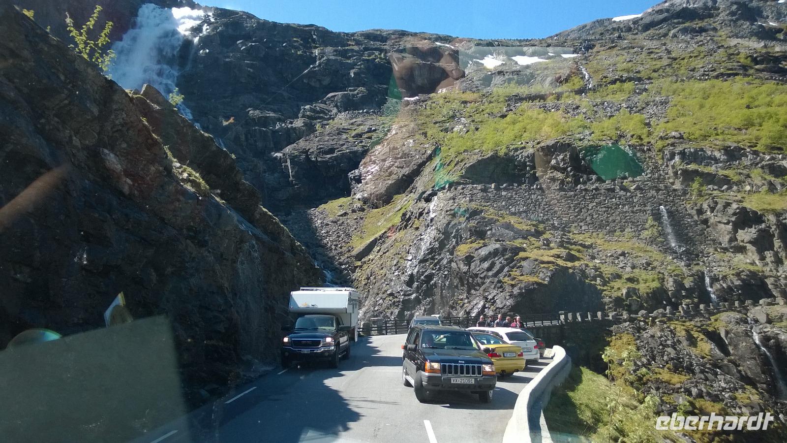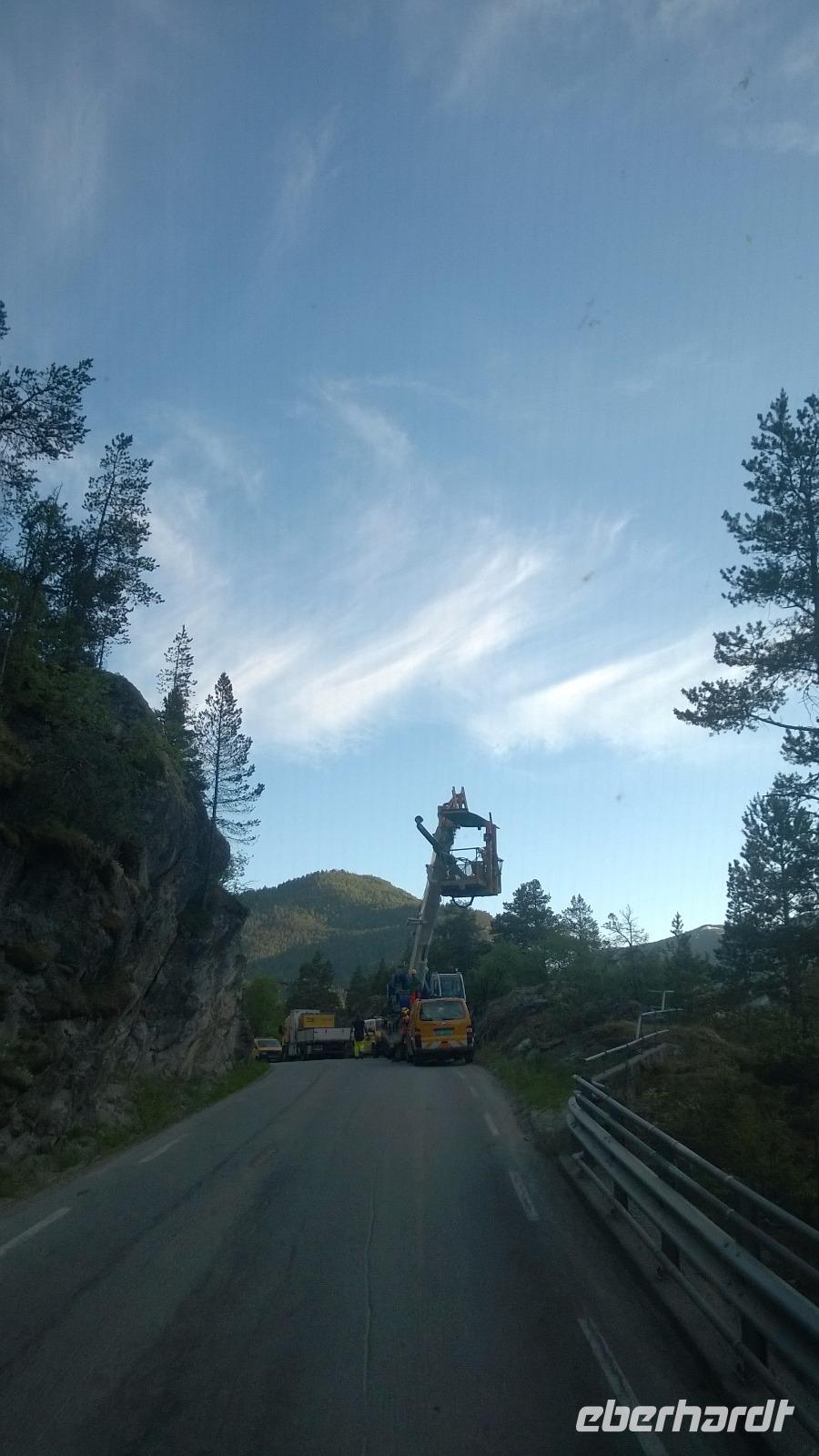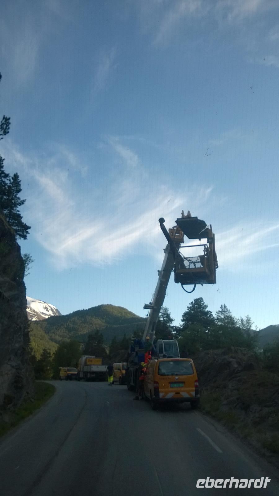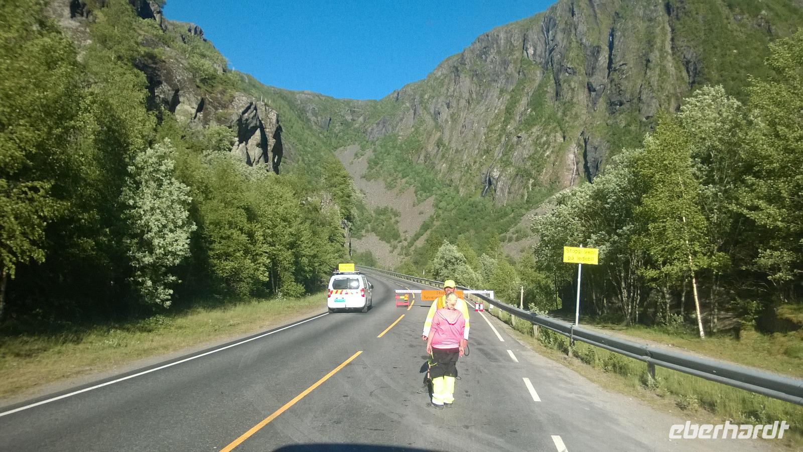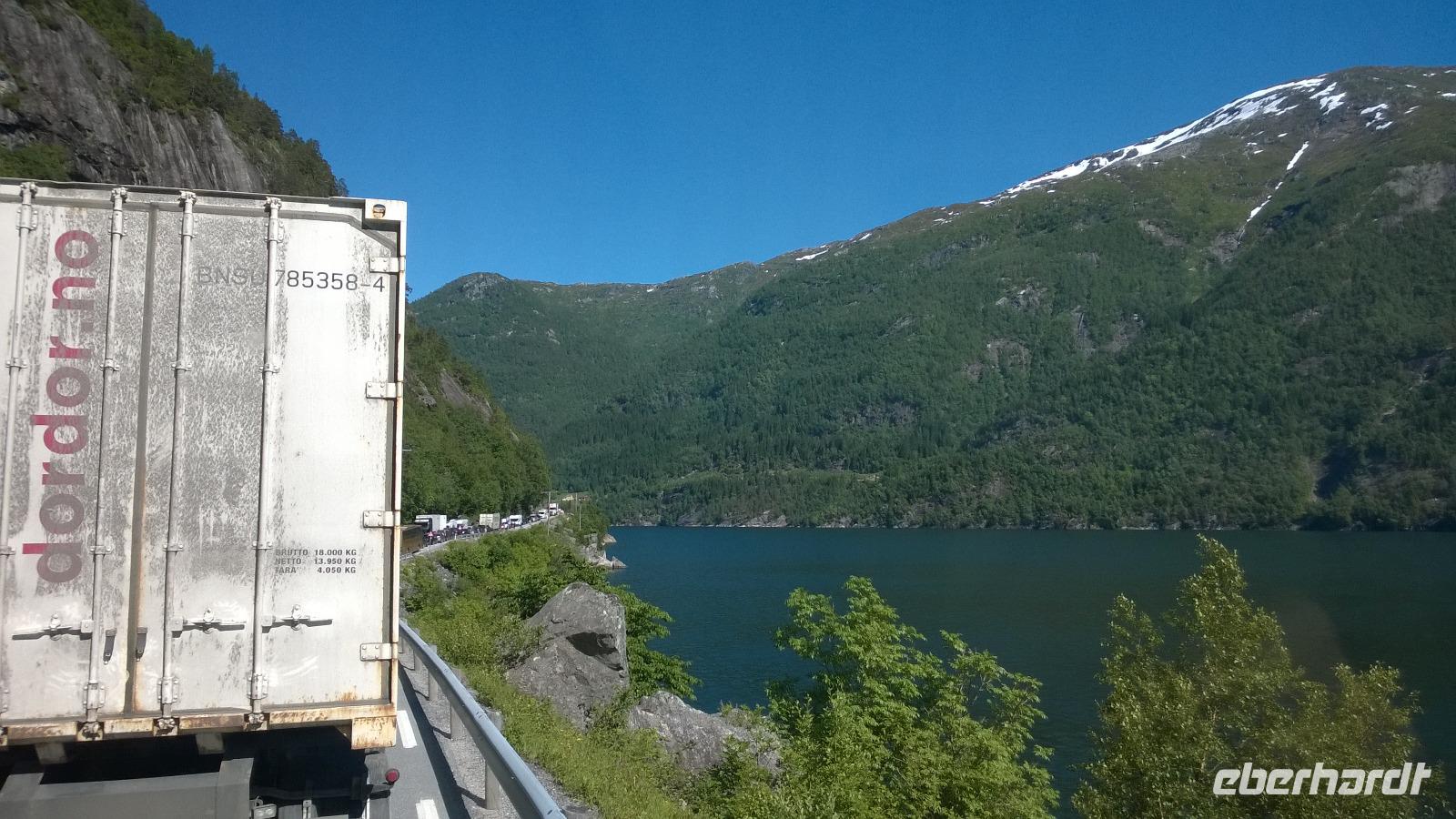 Bald nach dem Wasserfall sind wir weniger beeindruckt, sondern eher ernüchtert. Wir stehen auf einer schmalen Küstenstraße (die Landschaft hört einfach nicht auf, großartig zu sein, aber daran haben wir uns inzwischen schon gewöhnt). Also, wir stehen auf dieser kleinen, schmalen Straße, ganz nahe am Fjord. Vor uns Verkehr, hinter uns Verkehr, aber vor allem Stau. Langsam, ganz langsam bewegen wir uns vorwärts. Teilweise stehen wir auch einfach nur still. Diese kleine, enge Küstenstraße ist doch tatsächlich verstopft, weil nämlich auf einer anderen Zufahrtsstraße zu Bergen Gerölllawinen heruntergekommen sind und der Verkehr über unsere Straße umgeleitet werden muss. Nun werden wir also Zeugen, wie die Norweger ein handfestes Verkehrsproblem selbst in die Hand nehmen. Eine Art Abenteuer ist das gewissermaßen auch.