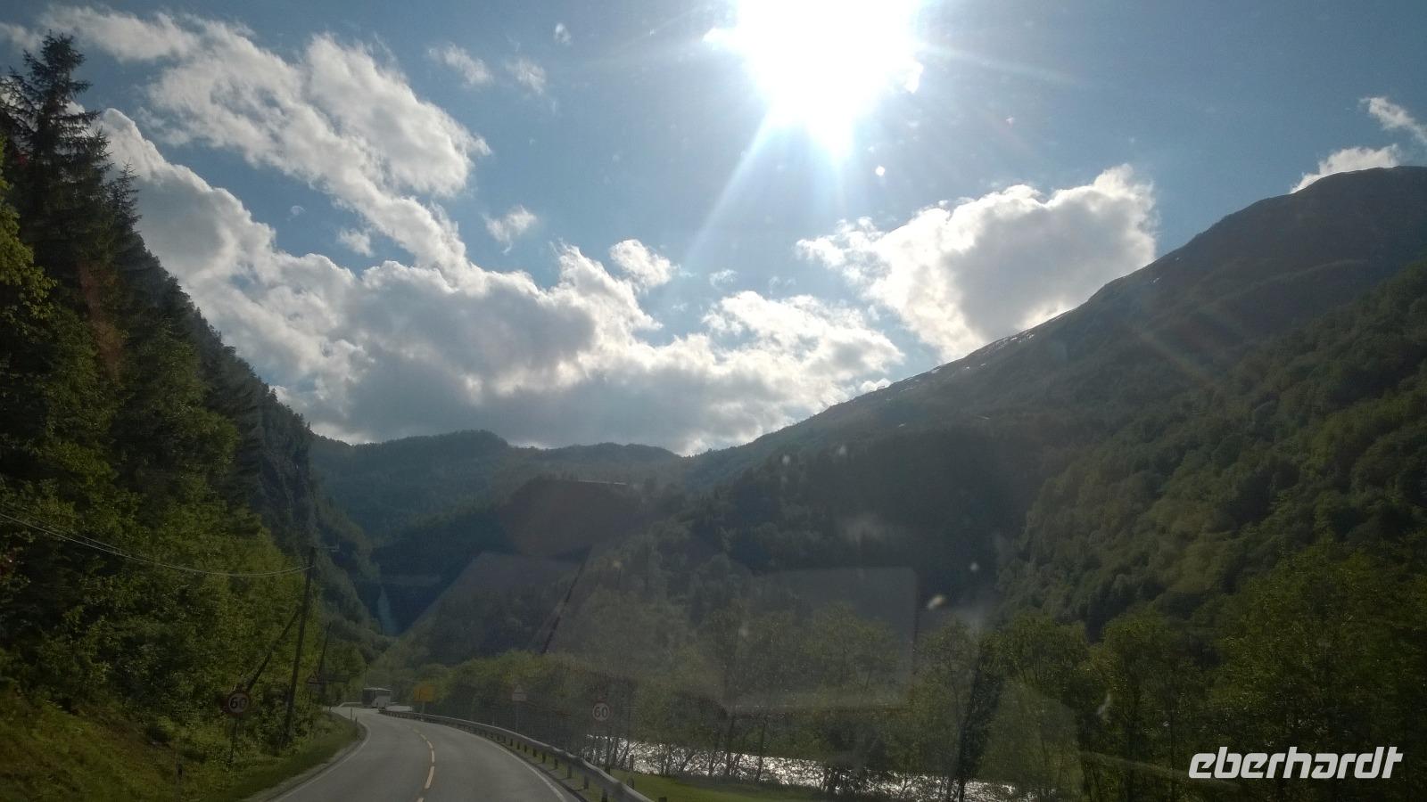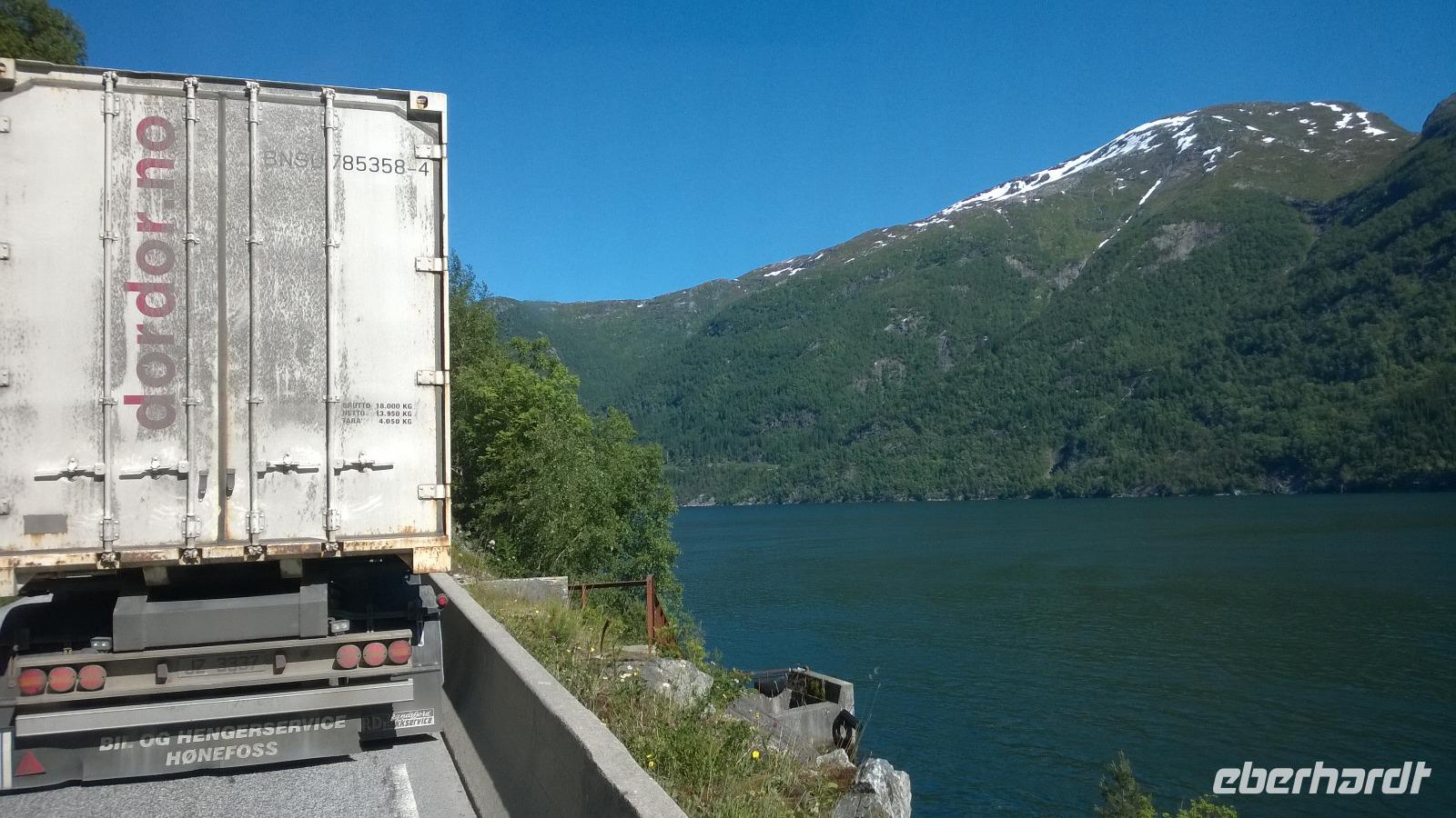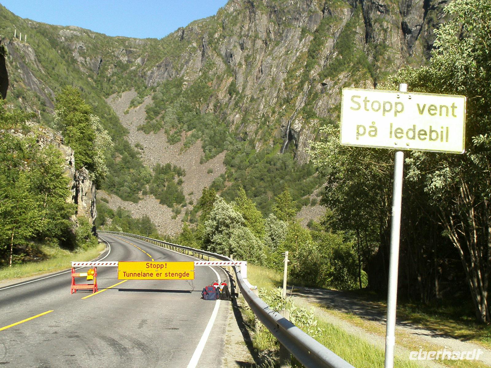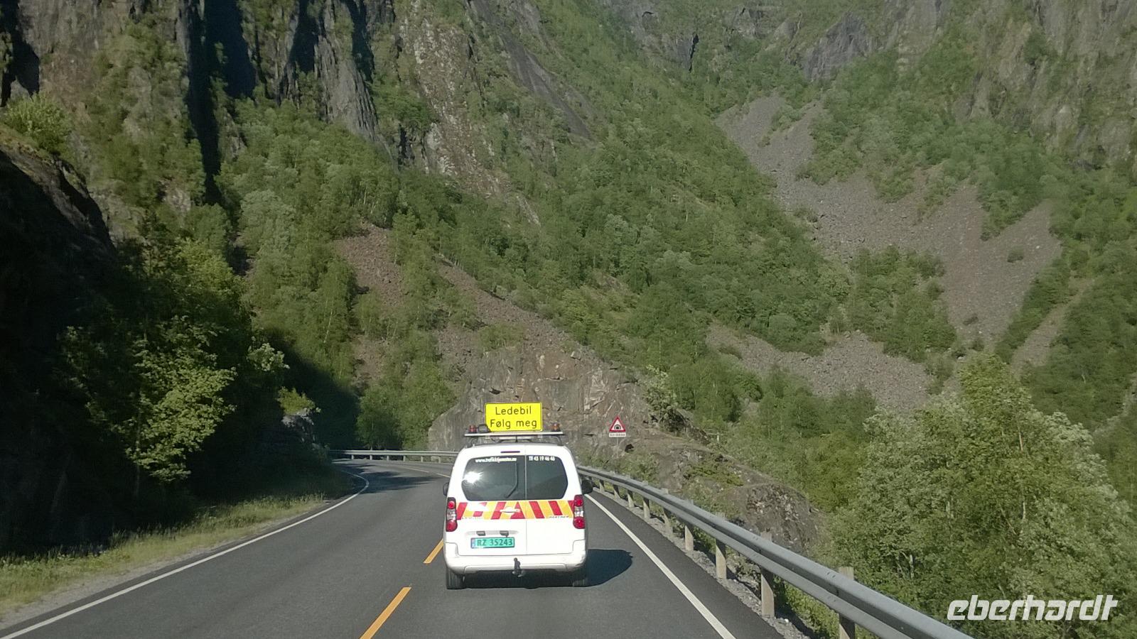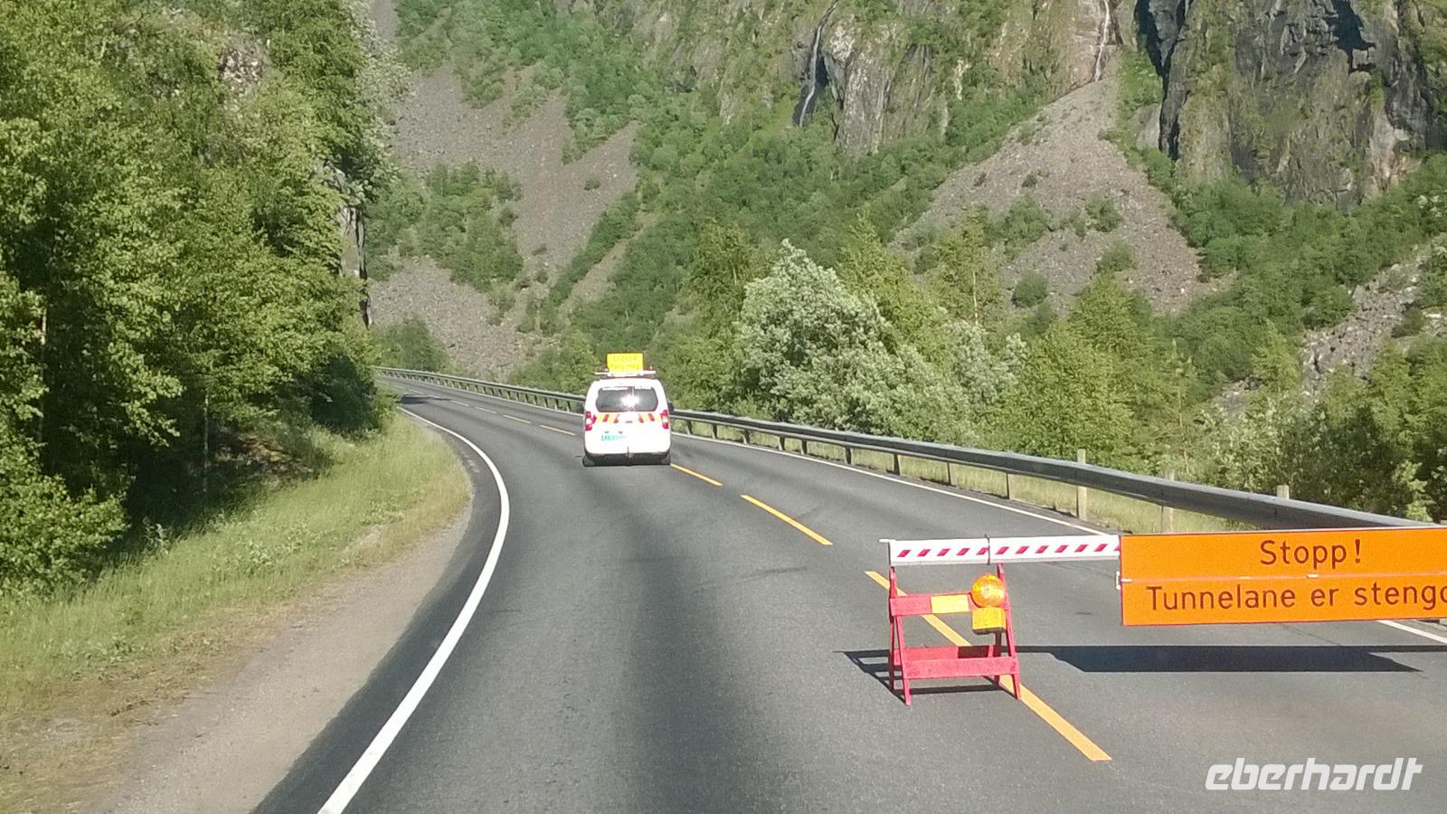 Bald nach dem Wasserfall sind wir weniger beeindruckt, sondern eher ernüchtert. Wir stehen auf einer schmalen Küstenstraße (die Landschaft hört einfach nicht auf, großartig zu sein, aber daran haben wir uns inzwischen schon gewöhnt). Also, wir stehen auf dieser kleinen, schmalen Straße, ganz nahe am Fjord. Vor uns Verkehr, hinter uns Verkehr, aber vor allem Stau. Langsam, ganz langsam bewegen wir uns vorwärts. Teilweise stehen wir auch einfach nur still. Diese kleine, enge Küstenstraße ist doch tatsächlich verstopft, weil nämlich auf einer anderen Zufahrtsstraße zu Bergen Gerölllawinen heruntergekommen sind und der Verkehr über unsere Straße umgeleitet werden muss. Nun werden wir also Zeugen, wie die Norweger ein handfestes Verkehrsproblem selbst in die Hand nehmen. Eine Art Abenteuer ist das gewissermaßen auch.