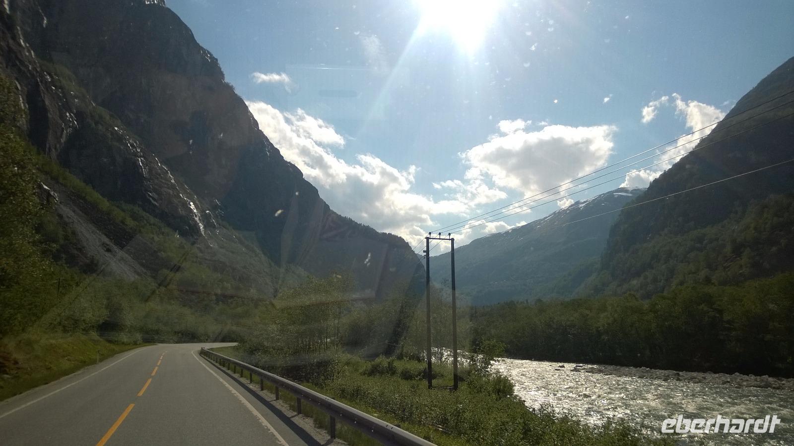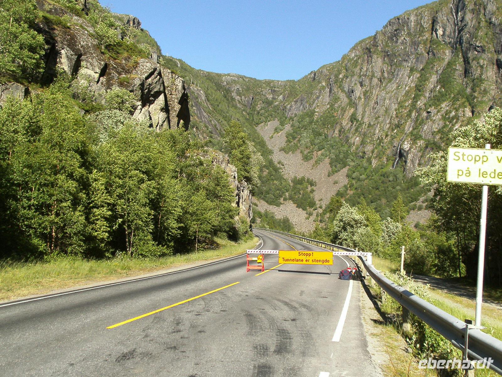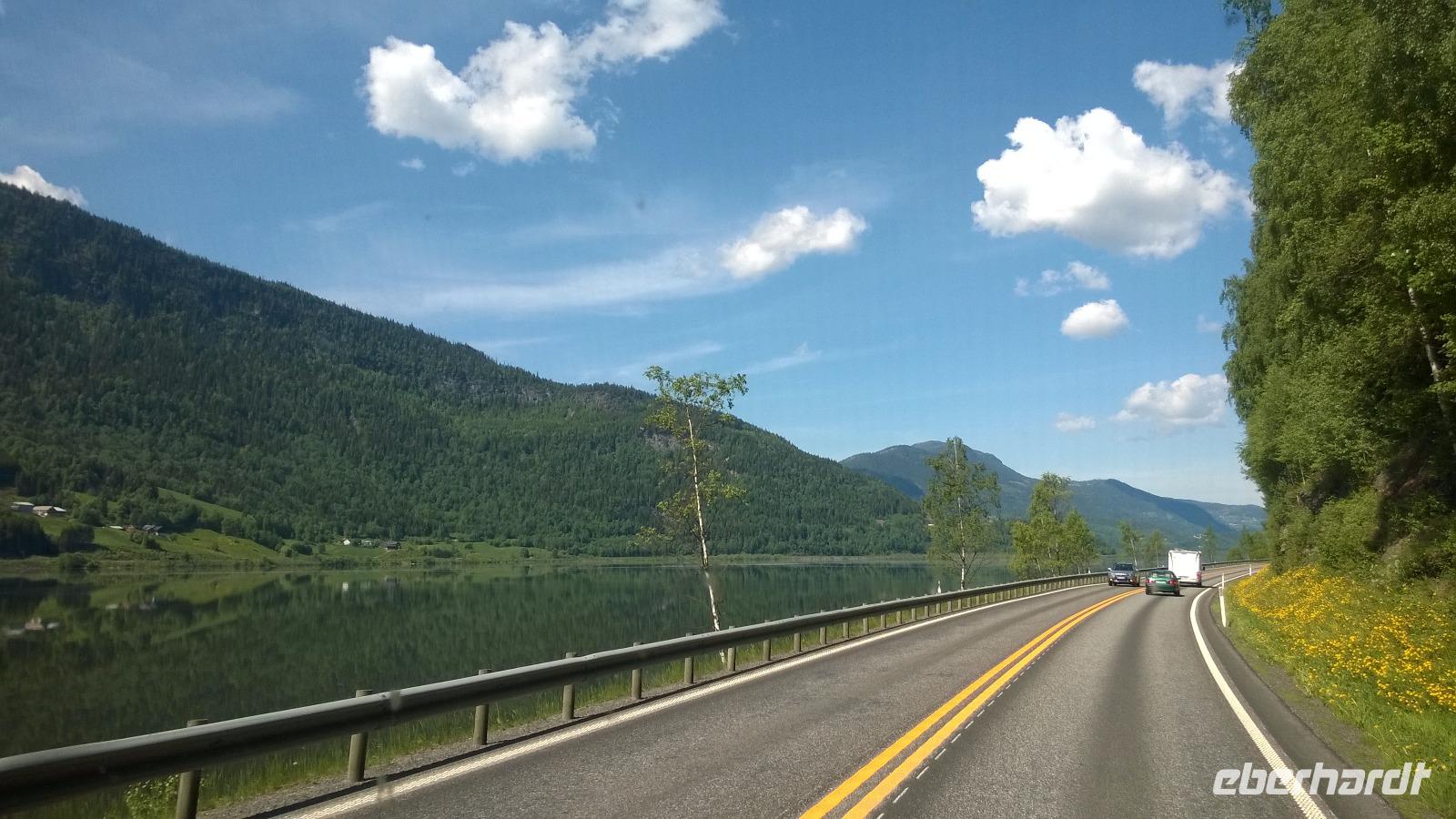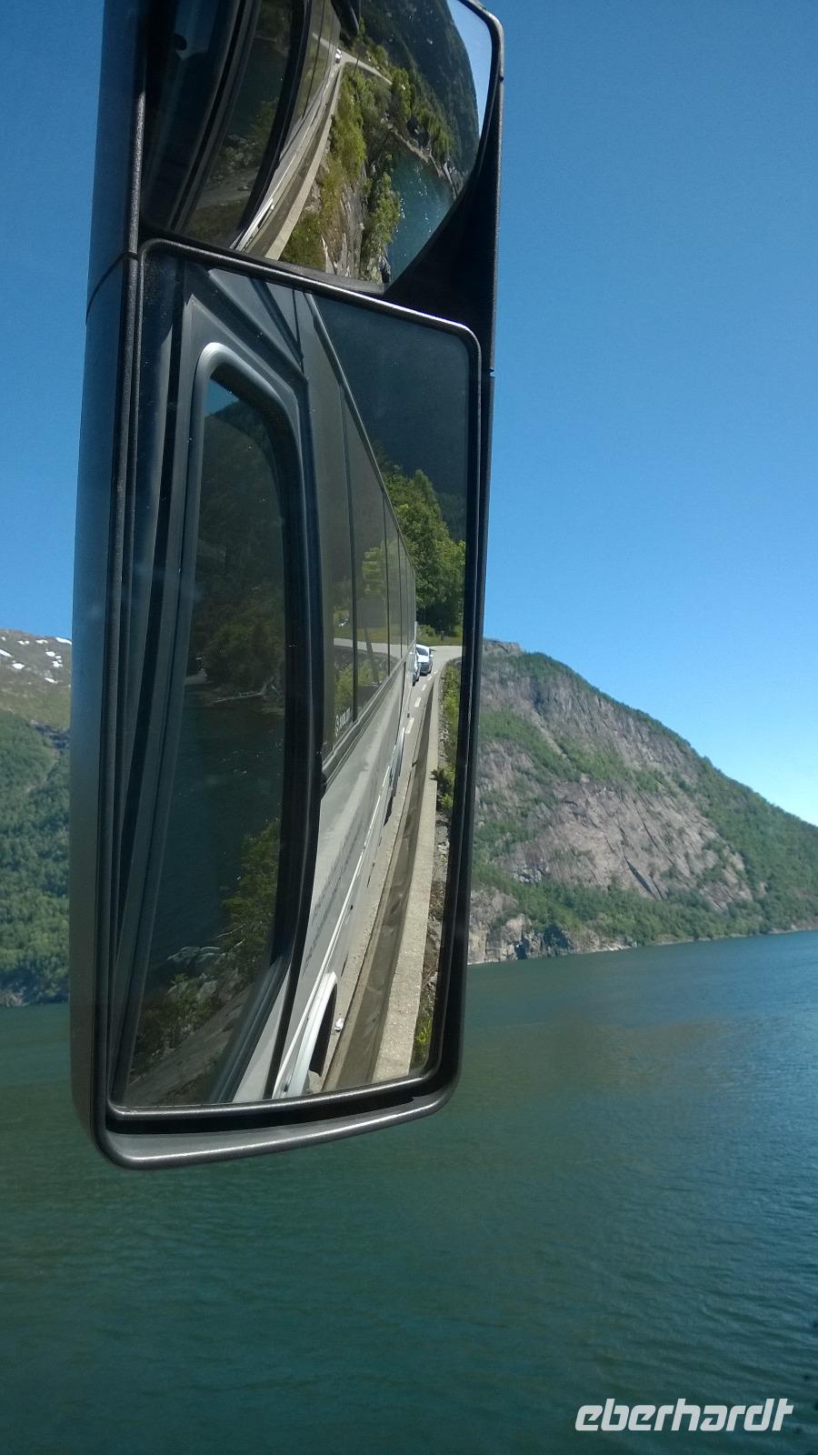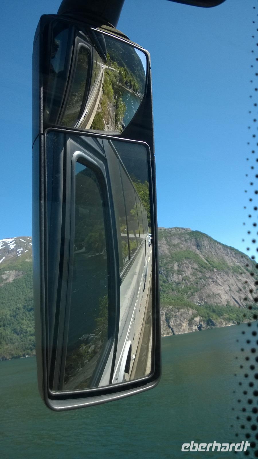 Bald nach dem Wasserfall sind wir weniger beeindruckt, sondern eher ernüchtert. Wir stehen auf einer schmalen Küstenstraße (die Landschaft hört einfach nicht auf, großartig zu sein, aber daran haben wir uns inzwischen schon gewöhnt). Also, wir stehen auf dieser kleinen, schmalen Straße, ganz nahe am Fjord. Vor uns Verkehr, hinter uns Verkehr, aber vor allem Stau. Langsam, ganz langsam bewegen wir uns vorwärts. Teilweise stehen wir auch einfach nur still. Diese kleine, enge Küstenstraße ist doch tatsächlich verstopft, weil nämlich auf einer anderen Zufahrtsstraße zu Bergen Gerölllawinen heruntergekommen sind und der Verkehr über unsere Straße umgeleitet werden muss. Nun werden wir also Zeugen, wie die Norweger ein handfestes Verkehrsproblem selbst in die Hand nehmen. Eine Art Abenteuer ist das gewissermaßen auch.